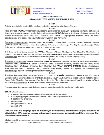 „PARYŻ I DISNEYLAND” SZAMPANIA-PARYŻ-WERSAL-DISNEYLAND (7 DNI) 1 dzień Zbiórka uczestników wycieczki (o ustalonej godzinie); wyjazd; przejazd przez Niemcy; 2 dzień Rano przyjazd EPERNAY w Szampanii: zwiedzanie piwnic (caves) słynących z produkcji szampana połączone z degustacją lampki szampana; przejazd do stolicy regionu - REIMS: kościół Notre-Dame – katedra koronacyjna królów francuskich; Pałac Tau, Plac Królewski, Plac Forum i Kryptoportyk rzymski; Porte de Mars; obiadokolacja; przejazd na nocleg w hotelu turystycznym pod Paryżem; 3 dzień Śniadanie kontynentalne; przyjazd rano do PARYŻA i zwiedzanie: Muzeum Luwru; Muzeum Perfum „FRAGONARD”; Montmartre: Sacre Coeur, Place du Tertre, Moulin Rouge, Plac Pigalle; obiadokolacja; Wieża Eiffla, rejs po Sekwanie; powrót na nocleg w hotelu turystycznym; 4 dzień Śniadanie kontynentalne; powrót do PARYŻA: Muzeum d’Orsay; Plac Zgody, Pola Elizejskie; Plac Gwiazdy z Łukiem Tryumfalnym; dzielnica La Defense; przejazd do WERSALU: zwiedzanie pałacu i ogrodów królewskich; obiadokolacja; wieczorny objazd Paryża autokarem; powrót na nocleg w hotelu turystycznym; 5 dzień Śniadanie kontynentalne; przejazd do DISNEYLAND RESORT pod Paryżem; zabawa do zamknięcia w parkach rozrywki: PARK DISNEYLAND (m.in. Kosmiczna Góra, Gwiezdne Podróże, kolejka Indiana Jones, Piraci Karaibscy Góra Wielkiego Grzmotu, Dom Duchów) lub WALT DISNEY’S STUDIOS (m.in. Armagedon, Rock’and’rollercoster, Trzęsienie Ziemi; pokazy kaskaderskie); wieczorem spacer po Disney-Village; obiadokolacja; powrót na nocleg w hotelu turystycznym; 6 dzień Śniadanie kontynentalne; wykwaterowanie i przejazd do PARYŻA (zwiedzanie piesze + metro): Ogrody Luksemburskie; Dzielnica Łacińska (Panteon, Sorbona, Skwer Św. Seweryna); wyspa La Cite: Katedra NotreDame, Saint Chapelle, Conciergerie; Pont Neuf; Hotel de Ville – Ratusz, Centrum Pompidou; wizyta na Stade de France; obiadokolacja; w godz. wieczornych wyjazd w drogę powrotną; 7 dzień Przejazd przez Niemcy; przyjazd do kraju i powrót na miejsce zbiórki o ustalonych godzinach; CENA brutto obejmuje: - transport komfortowym autokarem (wc, dvd, barek, klimatyzacja) - 4 noclegi wg programu w hotelach sieci F1 lub o podobnym standardzie - 9 posiłków wg programu - opiekę pilota - ubezpieczenie: KL i NNW - podatek VAT UWAGA! Cena nie obejmuje opłat za miejscowych przewodników, dodatkowych wstępów i napojów do obiadokolacji. W/w program imprezy jest ramowy i nastawiony na zwiedzanie obiektów z zewnątrz. Pilot nie oprowadza po muzeach. Miejsce zbiórki: ..................................................................................... Godz. Zbiórki: ...................Godz. wyjazdu: ..............Godz. powrotu (planowana): .......................
