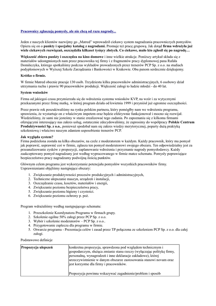Pracownicy zgłaszają pomysły, ale nie chcą od razu nagrody... Jeden z naszych klientów nazwijmy go „Matred” wprowadził ciekawy system nagradzania pracowniczych pomysłów. Opiera się on o punkty i specjalny katalog z nagrodami. Promuje też pracę grupową. Jak dotąd firma wdrożyła już wiele ciekawych rozwiązań, oszczędziła kilkaset tysięcy złotych. Co ciekawe, mało kto zgłosił się po nagrodę… Większość zbiera punkty i oszczędza na kino domowe i inne wielkie atrakcje. Poniższy artykuł składa się z materiałów udostępnionych nam przez pracownika tej firmy i z fragmentów pracy dyplomowej pana Rafała Domińczyka, którego spotkaliśmy podczas wykładów prowadzonych przez trenerów PCP Sp. z o.o. na studiach podyplomowych w Wyższej Szkole Zarządzania i Bankowości w Krakowie. Obu panom serdecznie dziękujemy. Krótko o firmie. W firmie Matred obecnie pracuje 130 osób. Trzydziestu kilku pracowników administracyjnych, 6 osobowy dział utrzymania ruchu i prawie 90 pracowników produkcji. Większość załogi to ludzie młodzi - do 40 lat. System wniosków Firma od jakiegoś czasu przymierzała się do wdrożenia systemu wniosków KVP, na wzór i za wytycznymi przekazanymi przez firmę matkę, w której program działa od kwietnia 1999 i przyniósł już ogromne oszczędności. Przez prawie rok poszukiwaliśmy na rynku polskim partnera, który pomógłby nam we wdrożeniu programu, sprawieniu, że wystartuje on z właściwym impetem oraz będzie efektywnie funkcjonował i mocno się rozwijał. Wiedzieliśmy, że sami nie jesteśmy w stanie zrealizować tego zadania. Po zapoznaniu się z kilkoma firmami oferującymi interesujący nas zakres usług, ostatecznie zdecydowaliśmy, że zaprosimy do współpracy Polskie Centrum Produktywności Sp. z o.o., ponieważ spodobał nam się zakres wiedzy merytorycznej, poparty dużą praktyką szkoleniową i właściwe naszym zdaniem usposobienie trenerów PCP. Jak wygląda system? Firma podzielona została na kilka obszarów, na czele z moderatorem w każdym. Każdy pracownik, który ma pomysł jak poprawić, usprawnić coś w firmie, zgłasza ten pomysł moderatorowi swojego obszaru. Ten odpowiedzialny jest za przeanalizowanie zysków z propozycji, zaplanowanie wdrożenia i przyznanie nagrody pomysłodawcy. Każdy zaakceptowany pomysł nagradzany jest według wypracowanego w firmie matce schematu. Pomysły poprawiające bezpieczeństwo pracy nagradzamy podwójną ilością punktów. Głównym celem programu jest wykorzystanie potencjału pomysłów wszystkich pracowników firmy. Usprawnieniami objęliśmy następujące obszary: 1. 2. 3. 4. 5. 6. Zwiększanie produktywności procesów produkcyjnych i administracyjnych, Techniczne ulepszanie maszyn, urządzeń i instalacji, Oszczędzanie czasu, kosztów, materiałów i energii, Zwiększanie poziomu bezpieczeństwa pracy, Zwiększanie poziomu higieny i czystości. Zwiększanie poziomu ochrony p. poż. Program wdrażaliśmy według następującego schematu: 1. 2. 3. 4. 5. Przeszkolenie Koordynatora Programu w firmach grupy. Szkolenie ogólne 50% załogi przez PCP Sp. z o.o. Wybór i szkolenie moderatorów – PCP Sp. z o.o.. Przygotowanie zaplecza dla programu w firmie. Otwarcie programu - Prezentacja celów i zasad przez TP połączona ze szkoleniem PCP Sp. z o.o. dla całej załogi. Podstawowe definicje Propozycja ulepszeń konkretna propozycja, sprawdzona pod względem technicznym i gospodarczym, służąca zmianie stanu rzeczy (wyłączając politykę firmy, personalną, wynagrodzeń i inne deklaracje zakładowe), której urzeczywistnienie w danym obszarze zastosowania stanowi novum oraz jest korzystne dla firmy i pracowników. Propozycja powinna wskazywać zagadnienie/problem i sposób System wynagrodzeń • • • • Moderator na podstawie oszacowanych zysków składa propozycje przyznania nagrody. Propozycja jest rozpatrywana przez „komisje zatwierdzającą”, która ostatecznie przyznaje punkty. Premie z policzonych propozycji będą liczone wg. przepisów dot. wynagrodzeń i będą zawierać podatek. Za grupowe propozycje (od 3 osób w górę) punkty są podwajane i zespół decyduje o ich podziale. Odrzucona propozycja uzyskuje 10 pkt. Wynagrodzenie moderatorów za sukces ich obszarów: 1. Kwartalna premia pieniężna wyliczona według następującego schematu: ilość zaakceptowanych propozycji na pracownika obszaru x 100 PLN. 2. 2% możliwego do ustalenia powtarzalnego rokrocznie zysku lub 0,5 % jednorazowego zysku wszystkich propozycji danego obszaru. Wykorzystanie punktów. Mogą być wymienione w każdym czasie na premie rzeczowe z aktualnego katalogu. Nie ma możliwości wymiany na pieniądze. Dodatkowe aktywności wspomagające program KVP W celu zwiększenia intensywności wynajdywania usprawnień i rozwiązywania problemów, by łatwiej dotrzeć do pomysłów pracowników, wykorzystywane są następujące metody: • • • a. Akcje czerwonych kartek b. Akcje zbierania problemów c. 5s Zakres i termin działań oraz wsparcie zewnętrzne ustalane jest przez odpowiedzialnych za program. Rezultaty: 1. W ciągu 5 miesięcy funkcjonowania systemu KVP wdrożono 153 propozycje ulepszeń na łączną kwotę uzyskanych korzyści 336,5 tyś. zł. 2. Średnio proponowano ok. 43 pomysłów miesięcznie, przy czym na jednego pracownika przypada ok 1,7 propozycji 3. Zaobserwowano wysoki stopień wykorzystania proponowanych ulepszeń; ok. 71% usprawnień produkcji zostało wdrożonych 4. W obszarach administracji, jakości, laminacji i magazynu (magazyn jest jednym z działów produkcyjnych, wynikający ze specyfiki produkcji) zaobserwowano wysoką aktywność osób ze swojego obszaru. 5. Niekwestionowanym liderem w osiągnięciu wysokiego poziomu zysku (ok. 217 tyś. zł.) został dział logistyki. Stąd największy wskaźnik zysków na 1 propozycję oraz wskaźnik zysków na 1 pracownika Kilka wdrożonych propozycji ulepszeń: • urządzenie do zamykani