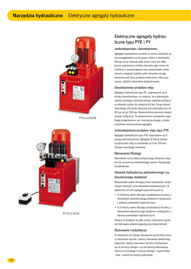 Narzędzia hydrauliczne Elektryczne agregaty hydrauliczne Elektryczne agregaty hydrauliczne typu PYE i PY Jednostopniowe i dwustopniowe Agregaty hydrauliczne są łatwe w użyciu, ponieważ są one przygotowane już do pracy i łatwe w sterowaniu. Stosuje się je wówczas gdy: praca musi być efektywnie wykonana w krótkim terminie; gdy mamy do czynienia z powtarzającymi się czynnościami; kiedy chcemy osiągnąć szybkie cykle siłownika lub gdy konieczny jest duży przepływ dużej ilości oleju przy użyciu ciężkich siłowników hydraulicznych. Dwustopniowy przepływ oleju PY-11/3/20/4 M Agregaty hydrauliczne typu PY...wyposażone są w pompy dwustopniowe, co oznacza, że w pierwszym stopniu (niskiego ciśnienia) pompa napełnia podłączony siłownik szybko do ciśnienia 80 bar. Drugi stopień (wysokiego ciśnienia) włączany jest automatycznie od 80 bar aż do 700 bar. Równocześnie pierwszy stopień zostaje rozłączony. To ekonomiczne rozwiązanie zapobiega przegrzewaniu się, oszczędza energię, a także umożliwia zwartą budowę agregatu. Jednostopniowy przepływ oleju typu PYE Agregaty hydrauliczne typu PYE wyposażone są w pompy jednostopniowe, Agregaty te tłoczą zawsze tą samą ilość oleju w przedziale od 0 do 700 bar (stopień wysokiego ciśnienia). Sterowanie/Obsługa Sterowanie ruchu tłoka podłączonego siłownika odbywa się za pomocą wbudowanego zaworu sterującego (rozdzielacza). Siłownik hydrauliczny jednostronnego czy dwustronnego działania? Bezpośredni zawór sterujący musi odpowiadać zasadniczym funkcjom w/w siłowników hydraulicznych. W zależności od nich agregat wyposażony jest w: • 3/3-drożny zawór sterujący (rozdzielacz) do pracy z siłownikami jednostronnego działania w połączeniu z jednym przewodem hydraulicznym PY-07/3/10/4 E • 4/3-drożny zawór sterujący (rozdzielacz) do pracy z siłownikami dwustronnego działania w połączeniu z dwoma przewodami hydraulicznymi. Zawory te dostępne są jako zawory sterowane ręczne lub sterowane elektromagnetycznie (solenoidowe). Stosowanie rozdzielaczy W zależności od rodzaju sterowania wyróżniamy zawory sterowane ręcznie i zawory sterowane elektromagnetycznie. Zawory sterowane ręcznie uruchamiane są za pomocą dźwigni i są one tańszą alternatywą. Zawory te posiadają 3 pozycje dźwigni: -wysuw tłoka - stop - powrót do pozycji wyjściowej. 218 Narzędzia hydrauliczne Elektryczne agregaty hydrauliczne Zawory sterowane elektromagnetycznie Olej hydrauliczny Wielką zaletą zaworów sterowanych elektromagnetycznie jest sterowanie za pomocą kabla i kasety sterowniczej, co umożliwia obsługującemu urządzenia wielką swobodę ruchu. Wszystkie agregaty hydrauliczne docierają do klienta jako gotowe już do pracy. Wypełnione są one wysokowartościowym olejem hydraulicznym w/g specyfikacji ISO VG 32. Zawory te steruje się poprzez dwa przyciski (- praca - powrót -). W momencie gdy przycisk nie jest włączony zawór ten przełącza pompę na specjalny bieg jałowy, gdzie ciśnienie i siła w podłączonych siłownikach utrzymana jest bez spadków ciśnienia. Dzięki zastosowaniu zaworów sterowanych elektromagnetycznie możliwe jest szybkie i bardzo precyzyjne ( z dokładnością milimetrową) sterowanie siłownika hydraulicznego. Właściwości Bieg jałowy W pozycji stop wszystkie zawory sterujące przełączają na bieg jałowy tzn. że przepływ oleju odbywa się rotacyjnie od pompy i kierowany jest z powrotem do zbiornika bez kreowania jakiegokolwiek ciśnienia. Specjalna konfiguracja zaworu sterowanego elektromagnetycznie • Trwałe agregaty, nadające się również do zastosowania w trybie ciągłym. • Uniwersalne zastosowanie we wszystkich pracach remontowych i montażowych oraz pracach w warsztatach. • Włącznik i wyłącznik silnika oraz 3 metrowy kabel. • Z uchwytem transportowym, wskaźnikiem poziomu oleju oraz zatyczkami zbiornika. • Ciśnieniomierz GGY-631. • Dwustopniowe działanie tzn. szybki wysuw tłoka siłownika nieobciążonego oraz automatyczne przełączenie na poziom drugi przy odpowiednim obciążeniu. • Inne napięcia silnika i rozmiary zbiornika na życzenie klienta. Niektóre zastosowania jak np. niezależna praca kilku siłowników z jednego agregatu, wymagają specjalnej konfiguracji sterowania zaworu elektromagnetycznego. Mamy tutaj do czynienia z zaworem rozbudowanym i indywidualnie wykonanym odpowiednio do zastosowania i wymagań klienta. • Z zaworami sterowanymi ręcznie i elektromagnetycznie. Czujnik ciśnieniowy agregatu • Sterowanie napięciem 24 V, przy zaworach sterowanych elektromagnetycznie, poprzez wbudowany transformator. Agregaty hydrauliczne wyposażone w specjalne sterowanie mogą być zastosowane jako czujnik ciśnieniowy. Z taką funkcją kontrolują one samodzielnie nastawione juź ciśnienie robocze, a w momencie kiedy ciśnienie spada, umożliwiają automatycznie ponowny wzrost ciśnienia. • Zawory sterowane elektromagnetycznie z kablem 3m i kasetą sterowniczą oraz zawór ciśnieniowy do bezstopniowego nastawiania pożądanego ciśnienia roboczego 0-700 bar. Wózki Wszystkie agregaty hydrauliczne mogą być wyposażone w wózki, posiadające dwa stałe, nieruchome i dwa przestawne kółka. Chłodnica oleju Stosowanie agregatów hydraulicznych w trybie ciągłym może powodować wytwarzanie ciepła, które następnie podwyższa temperaturę oleju. W momencie kiedy temperatura oleju hydraulicznego przekracza 60° C, chłodnica oleju zaczyna działać. 219 Narzędzia hydrauliczne Elektryczne agregaty hydrauliczne Elektryczne agregaty hydrauliczne, dwupoziomowe, 700 bar Model Pojemność zbiornika Zawór sterujący (rozdzielaczl) Moc silnika Wydajność, dział.dwupozio. Zawór sterowany ręcznie Zawór sterowany elektromag. ca. l/min ca. l/min 3/3-drożny 4/3-drożny 3/3-drożny 4/3-drożny kw 0 - 80 bar 80 - 700 bar 10 l 20 l 30 l 50 l PY - 07/3/10/3 M PY - 07/3/10/4 M PY - 07/3/20/3 M PY - 07/3/20/4 M 