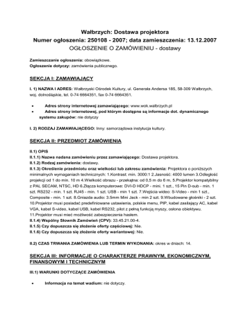 Wałbrzych: Dostawa projektora Numer ogłoszenia: 250108 - 2007; data zamieszczenia: 13.12.2007 OGŁOSZENIE O ZAMÓWIENIU - dostawy Zamieszczanie ogłoszenia: obowiązkowe. Ogłoszenie dotyczy: zamówienia publicznego. SEKCJA I: ZAMAWIAJĄCY I. 1) NAZWA I ADRES: Wałbrzyski Ośrodek Kultury, ul. Generała Andersa 185, 58-309 Wałbrzych, woj. dolnośląskie, tel. 0-74 6664351, fax 0-74 6664351. • • Adres strony internetowej zamawiającego: www.wok.walbrzych.pl Adres strony internetowej, pod którym dostępne są informacje dot. dynamicznego systemu zakupów: nie dotyczy I. 2) RODZAJ ZAMAWIAJĄCEGO: Inny: samorządowa instytucja kultury. SEKCJA II: PRZEDMIOT ZAMÓWIENIA II.1) OPIS II.1.1) Nazwa nadana zamówieniu przez zamawiającego: Dostawa projektora. II.1.2) Rodzaj zamówienia: dostawy. II.1.3) Określenie przedmiotu oraz wielkości lub zakresu zamówienia: Projektora o poniŜszych minimalnych wymaganiach technicznych: 1.Kontrast: min. 3000:1 2.Jasność: 4000 lumen 3.Odległość projekcji od 1 do min. 10 m 4.Wielkość obrazu - przekątna: od 0,5 m do 6 m, 5.Projektor kompatybilny z PAL SECAM, NTSC, HD 6.Złącza komputerowe: DVI-D HDCP - mini. 1 szt., 15 Pin D-sub - min. 1 szt. RS232 - min. 1 szt. RJ45 - min. 1 szt. USB - min 1 szt. 7.Wejścia wideo: S-Video - min 1 szt., Composite - min. 1 szt. 8.Gniazda audio: 3.5mm Mini Jack - min 2 szt. 9.Wbudowane głośniki - 2 szt. 10.Projektor musi posiadać predefiniowane ustawienia, polskie menu, PIP, kabel zasilający AC, kabel VGA, kabel S-video, kabel USB, kabel RS232, pilot z pełną funkcją myszy, osłona obiektywu. 11.Projektor musi mieć moŜliwość zabezpieczenia hasłem. II.1.4) Wspólny Słownik Zamówień (CPV): 33.45.21.00-4. II.1.5) Czy dopuszcza się złoŜenie oferty częściowej: Nie. II.1.6) Czy dopuszcza się złoŜenie oferty wariantowej: Nie. II.2) CZAS TRWANIA ZAMÓWIENIA LUB TERMIN WYKONANIA: okres w dniach: 14. SEKCJA III: INFORMACJE O CHARAKTERZE PRAWNYM, EKONOMICZNYM, FINANSOWYM I TECHNICZNYM III.1) WARUNKI DOTYCZĄCE ZAMÓWIENIA • Informacja na temat wadium: nie dotyczy. III.2) WARUNKI UDZIAŁU • Opis warunków udziału w postępowaniu oraz opis sposobu dokonywania oceny spełniania tych warunków: 1)posiadają uprawnienia do wykonywania określonej działalności lub czynności, jeŜeli ustawy nakładają obowiązek posiadania takich uprawnień, ocena spełnienia tego warunku odbędzie się na podstawie oświadczenia (załącznik nr 3 do SIWZ) oraz dokumentów wymienionych w pkt 2.1.1 SIWZ 2)posiadają niezbędną wiedzę i doświadczenie oraz dysponują potencjałem technicznym i osobami zdolnymi do wykonania zamówienia, ocena spełnienia tego warunku odbędzie się na podstawie oświadczenia (załącznik nr 3 do SIWZ) 3)znajdują się w sytuacji ekonomicznej i finansowej zapewniającej wykonanie zamówienia, ocena spełnienia tego warunku odbędzie się na podstawie oświadczenia (załącznik nr 3 do SIWZ) 4)nie podlegają wykluczeniu z postępowania o udzielenie zamówienia publicznego, ocena spełnienia tego warunku odbędzie się na podstawie oświadczenia (załącznik nr 3 do SIWZ) oraz dokumentów wymienionych w pkt 2.1.1 SIWZ (tj.: aktualny odpis z właściwego rejestru lub • zaświadczenie o wpisie do ewidencji działalności gospodarczej) Informacja o oświadczeniach i dokumentach, jakie mają dostarczyć wykonawcy w celu potwierdzenia spełniania warunków udziału w postępowaniu: a)aktualny odpis z właściwego rejestru albo aktualne zaświadczenie o wpisie do ewidencji działalności gospodarczej, jeŜeli odrębne przepisy wymagają wpisu do rejestru lub zgłoszenia do ewidencji działalności gospodarczej, wystawiony nie wcześniej niŜ 6 miesięcy przed upływem terminu składania ofert. SEKCJA IV: PROCEDURA IV.1) TRYB UDZIELENIA ZAMÓWIENIA IV.1.1) Tryb udzielenia zamówienia: przetarg nieograniczony. IV.2) KRYTERIA OCENY OFERT IV.2.1) Kryteria oceny ofert: najniŜsza cena. IV.2.2) Wykorzystana będzie aukcja elektroniczna: Nie. IV.3) INFORMACJE ADMINISTRACYJNE IV.3.1) Adres strony internetowej, na której dostępna jest specyfikacja istotnych warunków zamówienia: www.wok.walbrzych.pl Specyfikację istotnych warunków zamówienia moŜna uzyskać pod adresem: Wałbrzyski Ośrodek Kultury ulica Andersa185 - Biały Kamień kod pocztowy 58 - 304 miejscowość Wałbrzych tel. 074 666 43 50 fax. 074 666 43 51. IV.3.2) Opis potrzeb i wymagań zamawiającego określonych w sposób umoŜliwiający przygotowanie się wykonawców do udziału w dialogu konkurencyjnym lub informacja o sposobie uzyskania tego opisu: nie dotyczy IV 3.3) Informacja o wysokości nagród dla wykonawców, którzy podczas dialogu konkurencyjnego przedstawili rozwiązania stanowiące podstawę do składania ofert, jeŜeli zamawiający przewiduje nagrody: nie dotyczy IV.3.4) Termin składania wniosków o dopuszczenie do udziału w postępowaniu lub ofert: 20.12.2007 godzina 13:00, miejsce: sekretariat Wałbrzyskiego Ośrodka Kultury ulica Andersa185 Biały Kamień, kod pocztowy 58 - 304 miejscowość Wałbrzych. IV.3.5) Termin związania ofertą: okres w dniach: 21 (od ostatecznego terminu składania ofert). IV.3.6) Informacje dodatkowe, w tym dotyczące finansowania projektu/programu ze środków Unii Europejskiej: umowa z Ministerstwem Kultury i Dziedzictwa Narodowego