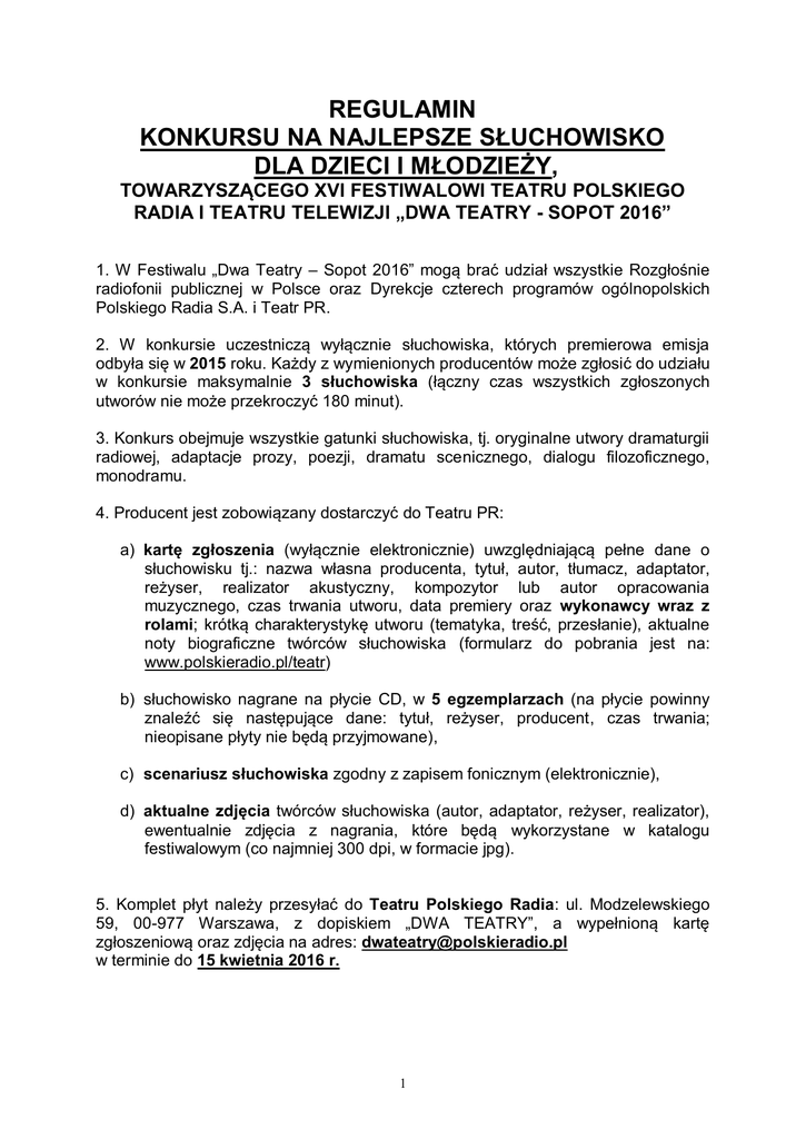 REGULAMIN KONKURSU NA NAJLEPSZE SŁUCHOWISKO DLA DZIECI I MŁODZIEŻY, TOWARZYSZĄCEGO XVI FESTIWALOWI TEATRU POLSKIEGO RADIA I TEATRU TELEWIZJI „DWA TEATRY - SOPOT 2016” 1. W Festiwalu „Dwa Teatry – Sopot 2016” mogą brać udział wszystkie Rozgłośnie radiofonii publicznej w Polsce oraz Dyrekcje czterech programów ogólnopolskich Polskiego Radia S.A. i Teatr PR. 2. W konkursie uczestniczą wyłącznie słuchowiska, których premierowa emisja odbyła się w 2015 roku. Każdy z wymienionych producentów może zgłosić do udziału w konkursie maksymalnie 3 słuchowiska (łączny czas wszystkich zgłoszonych utworów nie może przekroczyć 180 minut). 3. Konkurs obejmuje wszystkie gatunki słuchowiska, tj. oryginalne utwory dramaturgii radiowej, adaptacje prozy, poezji, dramatu scenicznego, dialogu filozoficznego, monodramu. 4. Producent jest zobowiązany dostarczyć do Teatru PR: a) kartę zgłoszenia (wyłącznie elektronicznie) uwzględniającą pełne dane o słuchowisku tj.: nazwa własna producenta, tytuł, autor, tłumacz, adaptator, reżyser, realizator akustyczny, kompozytor lub autor opracowania muzycznego, czas trwania utworu, data premiery oraz wykonawcy wraz z rolami; krótką charakterystykę utworu (tematyka, treść, przesłanie), aktualne noty biograficzne twórców słuchowiska (formularz do pobrania jest na: www.polskieradio.pl/teatr) b) słuchowisko nagrane na płycie CD, w 5 egzemplarzach (na płycie powinny znaleźć się następujące dane: tytuł, reżyser, producent, czas trwania; nieopisane płyty nie będą przyjmowane), c) scenariusz słuchowiska zgodny z zapisem fonicznym (elektronicznie), d) aktualne zdjęcia twórców słuchowiska (autor, adaptator, reżyser, realizator), ewentualnie zdjęcia z nagrania, które będą wykorzystane w katalogu festiwalowym (co najmniej 300 dpi, w formacie jpg). 5. Komplet płyt należy przesyłać do Teatru Polskiego Radia: ul. Modzelewskiego 59, 00-977 Warszawa, z dopiskiem „DWA TEATRY”, a wypełnioną kartę zgłoszeniową oraz zdjęcia na adres: [email protected] w terminie do 15 kwietnia 2016 r. 1 6. Zgłoszenie słuchowiska do konkursu jest równoznaczne z udzieleniem przez dysponenta / producenta jednorazowej nieodpłatnej licencji na publiczne odtworzenie zgłoszonego utworu podczas trwania festiwalu. 7. W skład Jury, powołanego przez Zarząd Polskiego Radia S.A., wchodzić będą przedstawiciele środowisk twórczych. Jury wybierze ze swego grona Przewodniczącego. 8. Jury przyzna: Nagrodę ufundowaną przez Przewodniczącego Krajowej Rady Radiofonii i Telewizji, dla twórców słuchowiska zgłoszonego programy ogólnopolskie oraz Rozgłośnie Regionalne Polskiego Radia 9. Organizatorzy zastrzegają sobie prawo do ewentualnych zmian niniejszego regulaminu. --- 2