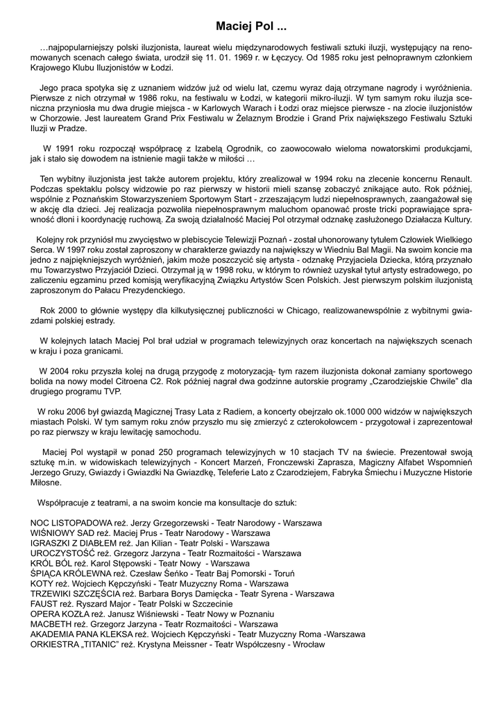 Maciej Pol ... …najpopularniejszy polski iluzjonista, laureat wielu międzynarodowych festiwali sztuki iluzji, występujący na renomowanych scenach całego świata, urodził się 11. 01. 1969 r. w Łęczycy. Od 1985 roku jest pełnoprawnym członkiem Krajowego Klubu Iluzjonistów w Łodzi. Jego praca spotyka się z uznaniem widzów już od wielu lat, czemu wyraz dają otrzymane nagrody i wyróżnienia. Pierwsze z nich otrzymał w 1986 roku, na festiwalu w Łodzi, w kategorii mikro-iluzji. W tym samym roku iluzja sceniczna przyniosła mu dwa drugie miejsca - w Karlowych Warach i Łodzi oraz miejsce pierwsze - na zlocie iluzjonistów w Chorzowie. Jest laureatem Grand Prix Festiwalu w Żelaznym Brodzie i Grand Prix największego Festiwalu Sztuki Iluzji w Pradze. W 1991 roku rozpoczął współpracę z Izabelą Ogrodnik, co zaowocowało wieloma nowatorskimi produkcjami, jak i stało się dowodem na istnienie magii także w miłości … Ten wybitny iluzjonista jest także autorem projektu, który zrealizował w 1994 roku na zlecenie koncernu Renault. Podczas spektaklu polscy widzowie po raz pierwszy w historii mieli szansę zobaczyć znikające auto. Rok później, wspólnie z Poznańskim Stowarzyszeniem Sportowym Start - zrzeszającym ludzi niepełnosprawnych, zaangażował się w akcję dla dzieci. Jej realizacja pozwoliła niepełnosprawnym maluchom opanować proste tricki poprawiające sprawność dłoni i koordynację ruchową. Za swoją działalność Maciej Pol otrzymał odznakę zasłużonego Działacza Kultury. Kolejny rok przyniósł mu zwycięstwo w plebiscycie Telewizji Poznań - został uhonorowany tytułem Człowiek Wielkiego Serca. W 1997 roku został zaproszony w charakterze gwiazdy na największy w Wiedniu Bal Magii. Na swoim koncie ma jedno z najpiękniejszych wyróżnień, jakim może poszczycić się artysta - odznakę Przyjaciela Dziecka, którą przyznało mu Towarzystwo Przyjaciół Dzieci. Otrzymał ją w 1998 roku, w którym to również uzyskał tytuł artysty estradowego, po zaliczeniu egzaminu przed komisją weryfikacyjną Związku Artystów Scen Polskich. Jest pierwszym polskim iluzjonistą zaproszonym do Pałacu Prezydenckiego. Rok 2000 to głównie występy dla kilkutysięcznej publiczności w Chicago, realizowanewspólnie z wybitnymi gwiazdami polskiej estrady. W kolejnych latach Maciej Pol brał udział w programach telewizyjnych oraz koncertach na największych scenach w kraju i poza granicami. W 2004 roku przyszła kolej na drugą przygodę z motoryzacją- tym razem iluzjonista dokonał zamiany sportowego bolida na nowy model Citroena C2. Rok później nagrał dwa godzinne autorskie programy „Czarodziejskie Chwile” dla drugiego programu TVP. W roku 2006 był gwiazdą Magicznej Trasy Lata z Radiem, a koncerty obejrzało ok.1000 000 widzów w największych miastach Polski. W tym samym roku znów przyszło mu się zmierzyć z czterokołowcem - przygotował i zaprezentował po raz pierwszy w kraju lewitację samochodu. Maciej Pol wystąpił w ponad 250 programach telewizyjnych w 10 stacjach TV na świecie. Prezentował swoją sztukę m.in. w widowiskach telewizyjnych - Koncert Marzeń, Fronczewski Zaprasza, Magiczny Alfabet Wspomnień Jerzego Gruzy, Gwiazdy i Gwiazdki Na Gwiazdkę, Teleferie Lato z Czarodziejem, Fabryka Śmiechu i Muzyczne Historie Miłosne. Współpracuje z teatrami, a na swoim koncie ma konsultacje do sztuk: NOC LISTOPADOWA reż. Jerzy Grzegorzewski - Teatr Narodowy - Warszawa WIŚNIOWY SAD reż. Maciej Prus - Teatr Narodowy - Warszawa IGRASZKI Z DIABŁEM reż. Jan Kilian - Teatr Polski - Warszawa UROCZYSTOŚĆ reż. Grzegorz Jarzyna - Teatr Rozmaitości - Warszawa KRÓL BÓL reż. Karol Stępowski - Teatr Nowy - Warszawa ŚPIĄCA KRÓLEWNA reż. Czesław Śeńko - Teatr Baj Pomorski - Toruń KOTY reż. Wojciech Kępczyński - Teatr Muzyczny Roma - Warszawa TRZEWIKI SZCZĘŚCIA reż. Barbara Borys Damięcka - Teatr Syrena - Warszawa FAUST reż. Ryszard Major - Teatr Polski w Szczecinie OPERA KOZŁA reż. Janusz Wiśniewski - Teatr Nowy w Poznaniu MACBETH reż. Grzegorz Jarzyna - Teatr Rozmaitości - Warszawa AKADEMIA PANA KLEKSA reż. Wojciech Kępczyński - Teatr Muzyczny Roma -Warszawa ORKIESTRA „TITANIC” reż. Krystyna Meissner - Teatr Współczesny - Wrocław