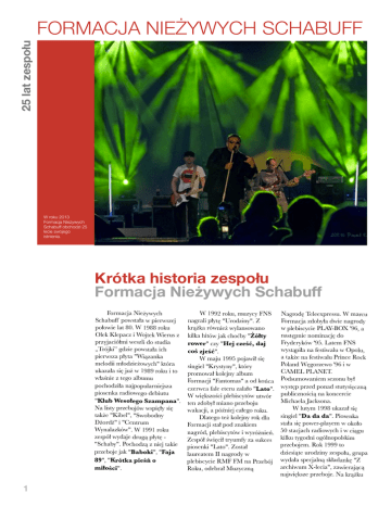 25 lat zespołu FORMACJA NIEŻYWYCH SCHABUFF W roku 2013 Formacja Nieżywych Schabuff obchodzi 25 lecie swojego istnienia. Krótka historia zespołu Formacja Nieżywych Schabuff Formacja Nieżywych Schabuff powstała w pierwszej połowie lat 80. W 1988 roku Olek Klepacz i Wojtek Wierus z przyjaciółmi weszli do studia „Trójki” gdzie powstała ich pierwsza płyta "Wiązanka melodii młodzieżowych" która ukazała się już w 1989 roku i to właśnie z tego albumu pochodziła najpopularniejsza piosenka radiowego debiutu "Klub Wesołego Szampana". Na listy przebojów wspięły się także "Kibel", "Swobodny Dżordż" i "Centrum Wynalazków". W 1991 roku zespół wydaje drugą płytę "Schaby". Pochodzą z niej takie przeboje jak "Baboki", "Faja 89", "Krótka pieśń o miłości". 1 W 1992 roku, muzycy FNS nagrali płytę "Urodziny". Z krążka również wylansowano kilka hitów jak choćby "Żółty rower" czy "Hej cześć, daj coś zjeść". W maju 1995 pojawił się singiel "Krystyny", który promował kolejny album Formacji "Fantomas" a od końca czerwca fale eteru zalało "Lato". W większości plebiscytów utwór ten zdobył miano przeboju wakacji, a później całego roku. Dlatego też kolejny rok dla Formacji stał pod znakiem nagród, plebiscytów i wyróżnień. Zespół święcił tryumfy za sukces piosenki "Lato". Został laureatem II nagrody w plebiscycie RMF FM na Przebój Roku, odebrał Muzyczną Nagrodę Teleexpressu. W marcu Formacja zdobyła dwie nagrody w plebiscycie PLAY-BOX '96, a następnie nominację do Fryderyków '95. Latem FNS wystąpiła na festiwalu w Opolu, a także na festiwalu Prince Rock Poland Węgorzewo '96 i w CAMEL PLANET. Podsumowaniem sezonu był występ przed ponad stutysięczną publicznością na koncercie Michaela Jacksona. W lutym 1998 ukazał się singiel "Da da da". Piosenka stała się power-playem w około 50 stacjach radiowych i w ciągu kilku tygodni ogólnopolskim przebojem. Rok 1999 to dziesiąte urodziny zespołu, grupa wydała specjalną składankę "Z archiwum X-lecia", zawierającą największe przeboje. Na krążku 25 lat zespołu FORMACJA NIEŻYWYCH SCHABUFF W roku 2013 Formacja Nieżywych Schabuff obchodzi 25 lecie swojego istnienia. znalazł się jeden utwór premierowy "Mów mi Elvis". Formacja powróciła po czterech latach milczenia z kolejną płytą, zatytułowaną "Supermarket". Pod koniec 2007 roku, zespół pojawił się z utworem „Ty” w projekcie charytatywnym „Pocztówka do Św. Mikołaja 2007” . Krążek osiąga status Złotej Płyty. Na pierwszy singel promujący nowy album Formacji został wybrany utwór „Ławka”. Ogólnopolska premiera utworu i premiera teledysku odbyła się 14 maja 2008. Utwór ten znalazł się w polskiej jedenastce konkursu Bursztynowego Słowika i Słowika Publiczności 45. Międzynarodowego Sopot Festival 2008. 11 lipca 2008 "Ławka" znalazła się wśród pięciu wykonawców, którzy wzięli udział w polskim finale na deskach Opery Leśnej w Sopocie. Piosenka „Ławka” stała się najczęściej emitowanym utworem w kraju i zyskała status przeboju roku 2008 . Premiera 2 nowego singla z albumu "24 H", "Przez Chwilę” odbywa się na antenie RMF FM, 24 września. "Przez Chwilę" pojawia się również na albumie pt. "Pocztówka do Św. Mikołaja 2008" . Warto dodać, że krążek osiąga status Złotej Płyty w dniu premiery. Nowy rok, 2009 zespół wita razem z telewidzami TVP 2 na największej imprezie sylwestrowej w Polsce "Sylwester Jasny Od Gwiazd" gromadzi przed telewizorami ponad 6 milionów widzów i 250 tys. na Wrocławskim rynku. 14 lutego 2009 zespół występuje jako gwiazda w polskim finale Eurowizji - transmisja "live". Rok 2009 to ciągłe koncerty. Formacja intensywnie gra w całej Polsce. Do stacji radiowych trafia kolejny singel z albumu "24 H" - "Myślman". Zespół angażuje się również w akcję charytatywna "Podziel się posiłkiem". Formacja dołącza również do XVII edycji świątecznej akcji charytatywnej „Pocztówka do Św. Mikołaja 2009” - krążek w dniu premiery uzyskuje status Złotej Płyty. W 2012 roku nakładem A. M. Polskiego Radia ukazuje się pierwszy solowy krążek lidera FNS Olka Klepacza pt. – „Neurotyki”. Piosenka ‚Tu i Tam’ była piosenką dnia Jedynki i zakwalifikowała się do KFPP Opole 2012 - koncert premier. Mieliśmy również okazję poznać „Tschenstochau”z gościnnym udziałem Sebastiana KarpielaBułecki, która również była piosenką dnia Jedynki, jak i zaistniała w kolejnej edycji płytowej ‚Przeboje Lata z Radiem 2012’,oraz „Madame Depressją”. Rok 2013 to rok 25 lecia Formacji Nieżywych Schabuff i jak obiecuje Olek, zespół nie omieszka zaakcentować tej daty premierową płytą jak i cyklem wyjątkowych koncertów podsumowujących dotychczasową działalność. Oficjalna strona: http://www.fns.pl