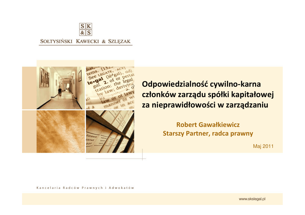 Odpowiedzialność cywilno-karna członków zarządu spółki kapitałowej za nieprawidłowości w zarządzaniu Robert Gawałkiewicz Starszy Partner, radca prawny Maj 2011 Przedmiot prezentacji Członkowie zarządu odpowiadają wobec spółki za szkody spowodowane wadliwym zarządzaniem (art. 293, 483 KSH). Członkowie zarządu ponoszą także odpowiedzialność karną za: Wyrządzenie spółce (znacznej) szkody (art. 296 KK – nadużycie zaufania), a nawet Za samo narażenie spółki na szkodę (art. 585 KSH – działanie na szkodę spółki). Przesłanki odpowiedzialności odszkodowawczej członków zarządu Działanie bądź zaniechanie sprzeczne z prawem lub umową / statutem spółki. Szkoda po stronie spółki. Adekwatny związek przyczynowy pomiędzy bezprawnym zachowaniem członka zarządu a szkodą powstałą w spółce. Wina członka zarządu. Bezprawność – problematyczna kwestia Istota problemu: wykazanie bezprawności w razie zarządzania spółką przy braku dochowania należytej staranności przez członka zarządu Art. 293 § 2 (art. 483 § 2) KSH: „Członek zarządu (…) powinien przy wykonywaniu swoich obowiązków dołożyć staranności wynikającej z zawodowego charakteru swojej działalności” Art. 292 § 2 (art. 474 § 2) KH: „Członek władz spółki (…) powinien przy wykonywaniu swoich obowiązków dokładać staranności sumiennego kupca i odpowiada wobec spółki za szkodę, spowodowaną brakiem takiej staranności”. Funkcja art. 293 § 2 (art. 483 § 2) KSH: miernik staranności dla oceny należytego wykonania obowiązków przez członka zarządu (wina) czy miernik staranności i jednocześnie samoistna podstawa odpowiedzialności odszkodowawczej (podwójna funkcja) Bezprawność – problematyczna kwestia SN: konieczne wykazanie, na czym polega bezprawność postępowania członka zarządu oraz wskazanie konkretnych postanowień prawa lub umowy / statutu spółki, które naruszono, powołanie się ogólnie na zaniedbania w zarządzaniu spółką świadczące o niedochowaniu należytej staranności nie wystarcza. Poglądy literatury: bezprawność to naruszenie przez członka zarządu ogólnego obowiązku prowadzenia spraw spółki w sposób należyty (art. 201 § 1, 208 § 2, 368 § 1, 371 § 1 KSH), przykład: nienależyty nadzór nad pracownikami, podejmowanie lekkomyślnych decyzji. Szkoda i związek przyczynowy Bezprawne i zawinione postępowanie członka zarządu Adekwatny związek przyczynowy Szkoda spółki (majątkowa) Adekwatny związek przyczynowy: szkoda jest normalną, naturalną i oczywistą konsekwencją zachowania członka zarządu. Szkoda to każde umniejszenie majątku spółki (w tym utrata zysku) Konieczna: Wnikliwa analiza stanu faktycznego, Opinia biegłego w razie potrzeby skorzystania z wiedzy specjalistycznej (np. z zakresu rachunkowości). Wina Odpowiedzialność odszkodowawcza zarządu – oparta na koncepcji winy indywidualnej, a nie zbiorowej. Podlega jej nie zarząd in corpore a poszczególni członkowie. KSH statuuje domniemanie winy członków zarządu. Na członkach zarządu ciąży obowiązek wykazania braku winy. Kwestia problematyczna w przypadku decyzji kolegialnych: wina członka zarządu w przypadku głosowania przeciw bądź wstrzymania się od głosu. Odpowiedzialność karna członków zarządu za wadliwe zarządzanie Działanie na szkodę spółki (art. 585 KSH) i nadużycie zaufania (art. 296 KK). Odpowiedzialność karna z art. 585 KSH idzie dalej niż odpowiedzialność cywilnoprawna na gruncie KSH penalizacja obejmuje umyślne narażanie spółki na szkodę (szkoda nie musi nastąpić) Zmiana przepisu art. 585 KSH (na mocy ustawy z 25 marca 2011 r. o ograniczaniu barier administracyjnych dla obywateli i mieszkańców): narażenie spółki na faktyczne bezpośrednie zagrożenie spowodowania znacznej szkody majątkowej niedopełnienie obowiązków bądź nadużycie uprawnień przez członka zarządu przestępstwo ścigane nie z urzędu, a tylko na wniosek pokrzywdzonej spółki, udziałowca lub niezaspokojonego wierzyciela (z oskarżenia prywatnego) Ocena prawna decyzji biznesowych Winna być dokonywana wedle stanu ex ante i jest możliwa tylko w ograniczonym zakresie. Winna koncentrować się na tym, czy decyzja została należycie przygotowana i jest racjonalna w danych okolicznościach. Istotne jest, czy członek zarządu działał w interesie spółki, a nie realizował wyłącznie cudze instrukcje i interesy osób trzecich. Działanie w granicach dozwolonego ryzyka nie może prowadzić do odpowiedzialności prawnej. Rozwiązania mające na celu ograniczenie odpowiedzialności członków zarządu Wewnętrzny podział kompetencji członków zarządu. System kontroli wewnętrznej. Absolutorium. Ubezpieczenie członków zarządu i innych osób sprawujących kierownicze funkcje w spółce (D&O). Regulacje w umowie członka zarządu ze spółką (Indemnification Agreement). Odpowiedzialność członka Zarządu będącego pracownikiem spółki. Wewnętrzny podział kompetencji Podział obowiązków pomiędzy poszczególnych członków zarządu. Regulacja w umowie / statucie spółki. Monitoring sytuacji finansowej spółki przez każdego z członków zarządu (upadłość). System kontroli wewnętrznej Procedury wewnętrzne. Właściwy przepływ informacji i dokumentów. System raportowania. Kontrole. Absolutorium Skutki prawne udzielenia absolutorium → kwestia dyskusyjna (dwie alternatywy): zwolnienie z odpowiedzialności za okres, którego absolutorium dotyczy, dotyczy ujawnionego stanu faktycznego; albo akceptacja działalności zarządu w okresie sprawozdawczym, która nie skutkuje zwolnieniem zarządu z odpowiedzialności lecz jedynie odwraca rozkład ciężaru dowodu co do winy w przypadku zgłoszenia roszczeń. Ograniczenie znaczenia absolutorium – nie wiąże wspólników / akcjonariuszy (w przypadku actio pro socio) a także w przypadku upadłości spółki – art. 486 i 487 KSH). D&O Ube