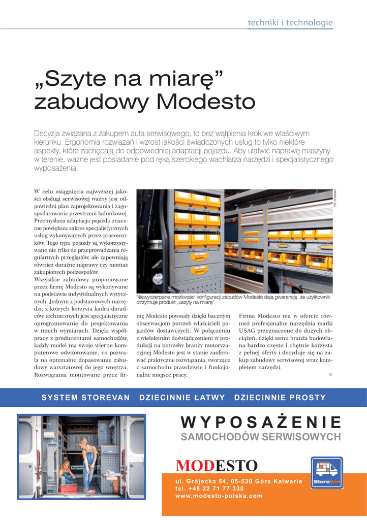 techniki i technologie „Szyte na miarę” zabudowy Modesto W celu osiągnięcia najwyższej jakości obsługi serwisowej ważny jest odpowiedni plan zaprojektowania i zagospodarowania przestrzeni ładunkowej. Przemyślana adaptacja pojazdu znacznie powiększa zakres specjalistycznych usług wykonywanych przez pracowników. Tego typu pojazdy są wykorzystywane nie tylko do przeprowadzania regularnych przeglądów, ale zapewniają również doraźne naprawy czy montaż zakupionych podzespołów. Wszystkie zabudowy proponowane przez firmę Modesto są wykonywane na podstawie indywidualnych wytycznych. Jednym z podstawowych narzędzi, z których korzysta kadra doradców technicznych jest specjalistyczne oprogramowanie do projektowania w trzech wymiarach. Dzięki współpracy z producentami samochodów, każdy model ma swoje wierne komputerowe odwzorowanie, co pozwala na optymalne dopasowanie zabudowy warsztatowej do jego wnętrza. Rozwiązania montowane przez fir- Fot. Modesto Decyzja związana z zakupem auta serwisowego, to bez wątpienia krok we właściwym kierunku. Ergonomia rozwiązań i wzrost jakości świadczonych usług to tylko niektóre aspekty, które zachęcają do odpowiedniej adaptacji pojazdu. Aby ułatwić naprawę maszyny w terenie, ważne jest posiadanie pod ręką szerokiego wachlarza narzędzi i specjalistycznego wyposażenia. Niewyczerpane możliwości konfiguracji zabudów Modesto dają gwarancję, że użytkownik otrzymuje produkt „uszyty na miarę” mę Modesto powstały dzięki bacznym obserwacjom potrzeb właścicieli pojazdów dostawczych. W połączeniu z wieloletnim doświadczeniem w produkcji na potrzeby branży motoryzacyjnej Modesto jest w stanie zaoferować praktyczne rozwiązania, tworzące z samochodu prawdziwie i funkcjonalne miejsce pracy. Firma Modesto ma w ofercie również profesjonalne narzędzia marki USAG przeznaczone do dużych obciążeń, dzięki temu branża budowlana bardzo często i chętnie korzysta z pełnej oferty i decyduje się na zakup zabudowy serwisowej wraz kompletem narzędzi. 6<67(0 6 725 ( 9$ 1 ' =,( &, 11, ( à $7 : < '= , ( &, 11, ( 3 52 67 < : < 3 2 6 $ ĩ ( 1 , ( 6$02&+2'Ï:6(5:,62:<&+ MODESTO XO*UyMHFND*yUD.DOZDULD WHO ZZZPRGHVWRSROVNDFRP