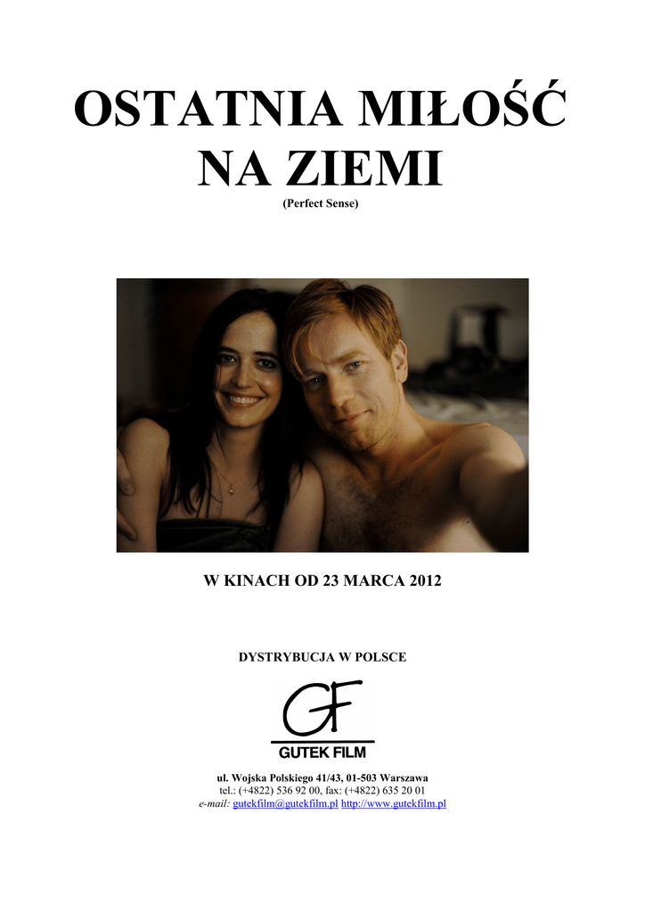 OSTATNIA MIŁOŚĆ NA ZIEMI (Perfect Sense) W KINACH OD 23 MARCA 2012 DYSTRYBUCJA W POLSCE ul. Wojska Polskiego 41/43, 01-503 Warszawa tel.: (+4822) 536 92 00, fax: (+4822) 635 20 01 e-mail: [email protected] http://www.gutekfilm.pl OSTATNIA MIŁOŚĆ NA ZIEMI PERFECT SENSE Reżyseria David MacKenzie („Młody Adam”, „Hallam Foe”) Scenariusz Kim Fupz Aakeson („Pewien dżentelmen”) Muzyka Max Richter (“Nadzieja”, “Walc z Bashirem”) Zdjęcia Giles Nuttgens („Młody Adam”, „Hallam Foe”) W rolach głównych: Ewan McGregor Eva Green Connie Nielsen Ewen Bremner Stephen Dillane Denis Lawson Michael Susan Jenny James Samuel Szef Producent Sigma Films Film i Väst Subotica Entertainment Zentropa Nagrody MFF Edynburg2011 – nagroda dla najlepszego filmu brytyjskiego Wielka Brytania / Niemcy / Szwecja / Dania rok produkcji: 2011 czas trwania: 92 min. 35 mm – Dolby Digital Kolor Ostatnia miłość na Ziemi to oryginalne połączenie zmysłowego romansu i kina katastroficznego. W rolach głównych Ewan McGregor (Trainspotting, Debiutanci, Autor widmo) i Eva Green (Casino Royale) jako nieznajomi, którzy spotykają się przypadkowo i szaleńczo w sobie zakochują. Wkrótce świat stanie w obliczu tajemniczego zagrożenia, mogącego być końcem ludzkości. Ostatnią miłość na ziemi wyreżyserował David Mackenzie, jeden z najciekawszych brytyjskich twórców młodego pokolenia, twórca filmu Młody Adam. Ostatnia miłość na Ziemi zadebiutowała na festiwalu w Sundance w 2011 roku, gdzie stała się jednym z najbardziej dyskutowanych tytułów. Film zdobył także prestiżową nagrodę za najlepszy brytyjski film roku na festiwalu w Edynburgu. GŁOSY PRASY Rewolucyjny! “Box Office Magazine” Pomiędzy McGregorem i Green jest niezwykła chemia. “Gordon & The Whale” Niepokojący, pełen napięcia, a przede wszystkim porusząjący “Screen International” Najlepszy, najbardziej przemawiający i wzruszający film Sundance 2011. Piękny, czuły, ła miący serce i przerażający. Brendan Walsh, “Screencave” *********10/10 Siłą tego filmu jest reżyseria, zdjęcia – obrazy są czystą poezją – oraz dzikie, surowe i przez to bardzo zmysłowe role całej obsady.”Ostatnia miłość na Ziemi” zostanie w was jeszcze dłu go po seansie. Jenni Miller, „Cinematical” Prowokujący do myślenia, pełen suspensu wzruszający film. Ryland Aldwich, “Twitch Film” To film z pięknym i bardzo osobistym przesłaniem do nas wszystkich. Germaine Lussier, “Film Review” O PRODUKCJI Ostatnia miłość na Ziemi to najnowszy owoc współpracy firm producenckich Sigma Films i Zentropa, należącej do Larsa von Triera. Poprzednio pracowały one przy produkcji m.in nagrodzonego w Cannes obrazu Andrei Arnold Red Road oraz przy dwóch filmach von Triera: Dogville i Manderlay. - Przez lata staliśmy się świetnymi partnerami i sojusznikami – mówi reżyser David Mackenzie. - Ufam ich ocenom i kiedy pokazali mi ten scenariusz czułem, że to będzie coś wyjątkowego. Już po 10 stronach wciągnął mnie całkowicie, był fantastyczny. Z jednej strony miał niesamowity rozmach, z drugiej był kameralną, intymną i prostą opowieścią. Jak baśń. Od samego początku był dla mnie afirmacją radości życia. Dawał szansę na film, po którym widzowie zapragną wyciągnąć rękę do drugiego człowieka. W głowie scenarzysty, Kima Fupza Aakesona, ta historia pojawiła się zupełnie nieoczekiwanie. - To najbardziej fantastyczny scenariusz, jaki kiedykolwiek napisałem – twierdzi. - Moje wcześniejsze filmy były mocno zanurzone w rzeczywistości, wymagały dogłębnego przygotowania, jak na przykład przyglądanie się życiu prostytutek przez kilka tygodni. Z kolei w książkach dla dzieci, którymi również się zajmuję, często sięgałem po baśnie i magię. Ostatnia miłość na Ziemi łączy te dwa podejścia, dając w efekcie zupełnie nowy ton w mojej twórczości. Scenariusz Aakesona ma prostotę alegorycznej przypowieści, a jednocześnie jest bardzo współczesny - zderza romans z rozpadającym się światem. Pisarz przyznaje, że ważne dla niego jest mówienie o aktualnych problemach, ale zawsze stara się dać coś więcej niż tylko negatywny obraz. - Jest wiele historii pełnych anarchii, pokazujących ludzi zwracających się przeciwko sobie, ale przecież zachowania pozytywne też są faktem. W obliczu katastrof, ludzie cały czas pracują, jedzą, zakochują się. Chciałem opowiedzieć historię ludzkiej miłości i pokazać jej siłę. Dla Davida Mackenziego to właśnie ta historia miłosna, wkroczenie na teren bardzo skonwencjonalizowanego filmowego gatunku, była największym wyzwaniem. - Bardzo trudno opowiadać o współczesnej miłości, bo łatwo popaść w zgrane klisze. To jak z popową piosenką – jak dzisiaj napisać taką o miłości, żeby było w niej coś świeżego? Moim więc zadaniem stało się odpowiedzieć na pytanie – co tę miłość czyni tak wyjątkową? Czym różni się ona od tysięcy innych miłosnych historii? Jesteśmy dzisiaj tak przeżarci cynizmem, że czasem potrzeba silnego wstrząsu, byśmy spojrzeli na to uczucie z zupełnie innej perspektywy. Piękno naszej historii wynika ze zderzenia jej z ekstremalnymi okolicznościami. Reżyserowi i scenarzyście od początku przyświecał wspólny cel – stworzyć intymny portret pary, która odnajduje się bez względu na wszelkie przeciwności. By tę wyjątkową opowieść powołać do życia potrzebowali obsady największego kalibru. EWAN McGREGOR Mackenzie chciał ponownie pracować z McGregorem od czasu ich wspólnego sukcesu – nagradzanego Młodego Adama. W postaci seksownego i pełnego charyzmy Michaela, głównego męskiego bohatera, widział idealną rolę dla 38-letniego gwiazdora. - Po prostu zakochałem się w scenariuszu, a dodatkowo uważam Davida [Mackenzie] za świetnego reżysera – mówi McGregor, który bardzo szybko zgodził się na ud