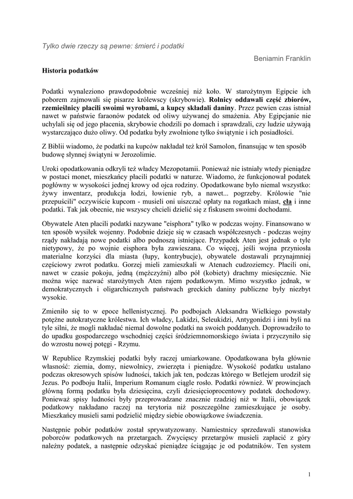 Tylko dwie rzeczy są pewne: śmierć i podatki Beniamin Franklin Historia podatków Podatki wynaleziono prawdopodobnie wcześniej niż koło. W starożytnym Egipcie ich poborem zajmowali się pisarze królewscy (skrybowie). Rolnicy oddawali część zbiorów, rzemieślnicy płacili swoimi wyrobami, a kupcy składali daniny. Przez pewien czas istniał nawet w państwie faraonów podatek od oliwy używanej do smażenia. Aby Egipcjanie nie uchylali się od jego płacenia, skrybowie chodzili po domach i sprawdzali, czy ludzie używają wystarczająco dużo oliwy. Od podatku były zwolnione tylko świątynie i ich posiadłości. Z Biblii wiadomo, że podatki na kupców nakładał też król Samolon, finansując w ten sposób budowę słynnej świątyni w Jerozolimie. Uroki opodatkowania odkryli też władcy Mezopotamii. Ponieważ nie istniały wtedy pieniądze w postaci monet, mieszkańcy płacili podatki w naturze. Wiadomo, że funkcjonował podatek pogłówny w wysokości jednej krowy od ojca rodziny. Opodatkowane było niemal wszystko: żywy inwentarz, produkcja łodzi, łowienie ryb, a nawet... pogrzeby. Królowie "nie przepuścili" oczywiście kupcom - musieli oni uiszczać opłaty na rogatkach miast, cła i inne podatki. Tak jak obecnie, nie wszyscy chcieli dzielić się z fiskusem swoimi dochodami. Obywatele Aten płacili podatki nazywane "eisphora" tylko w podczas wojny. Finansowano w ten sposób wysiłek wojenny. Podobnie dzieje się w czasach współczesnych - podczas wojny rządy nakładają nowe podatki albo podnoszą istniejące. Przypadek Aten jest jednak o tyle nietypowy, że po wojnie eisphora była zawieszana. Co więcej, jeśli wojna przyniosła materialne korzyści dla miasta (łupy, kontrybucje), obywatele dostawali przynajmniej częściowy zwrot podatku. Gorzej mieli zamieszkali w Atenach cudzoziemcy. Płacili oni, nawet w czasie pokoju, jedną (mężczyźni) albo pół (kobiety) drachmy miesięcznie. Nie można więc nazwać starożytnych Aten rajem podatkowym. Mimo wszystko jednak, w demokratycznych i oligarchicznych państwach greckich daniny publiczne były niezbyt wysokie. Zmieniło się to w epoce hellenistycznej. Po podbojach Aleksandra Wielkiego powstały potężne autokratyczne królestwa. Ich władcy, Lakidzi, Seleukidzi, Antygonidzi i inni byli na tyle silni, że mogli nakładać niemal dowolne podatki na swoich poddanych. Doprowadziło to do upadku gospodarczego wschodniej części śródziemnomorskiego świata i przyczyniło się do wzrostu nowej potęgi - Rzymu. W Republice Rzymskiej podatki były raczej umiarkowane. Opodatkowana była głównie własność: ziemia, domy, niewolnicy, zwierzęta i pieniądze. Wysokość podatku ustalano podczas okresowych spisów ludności, takich jak ten, podczas którego w Betlejem urodził się Jezus. Po podboju Italii, Imperium Romanum ciągle rosło. Podatki również. W prowincjach główną formą podatku była dziesięcina, czyli dziesięcioprocentowy podatek dochodowy. Ponieważ spisy ludności były przeprowadzane znacznie rzadziej niż w Italii, obowiązek podatkowy nakładano raczej na terytoria niż poszczególne zamieszkujące je osoby. Mieszkańcy musieli sami podzielić między siebie obowiązkowe świadczenia. Następnie pobór podatków został sprywatyzowany. Namiestnicy sprzedawali stanowiska poborców podatkowych na przetargach. Zwycięscy przetargów musieli zapłacić z góry należny podatek, a następnie odzyskać pieniądze ściągając je od podatników. Ten system 1 prowadził do wielu nadużyć został zlikwidowany przez Oktawiana Augusta, który po okresie wojen domowych w I w. n.e. zlikwidował Republikę i ustanowił Cesarstwo. Za czasów Augusta ściągano 1 proc. podatek od własności i podatek pogłówny od każdego dorosłego człowieka. Nie było to dużo i nie przeszkodziło gospodarczej prosperity. Imperium rozkwitało. Cesarze jednak stopniowo podnosili podatki. Szczególnie uciążliwą daniną stało się aurum corinarium, czyli formalnie dobrowolny trybut od miast i prowincji z okazji szczególnie uroczystych wydarzeń i rzymskich zwycięstw. Wielu cesarzy często i chętnie wyznaczało "ochotników" do płacenia aurum corinarium przy lada okazji. Byłoby przesadą twierdzić, że Imperium upadło z powodu nadmiernych podatków, jednak rosnący nacisk barbarzyńskich plemion wymagał większych nakładów na armię, większe nakłady na armię wymagały większych podatków, podatki rujnowały gospodarkę, a znękana ludność wolała już barbarzyńców, niż rodzimych poborców podatków. Po upadku Rzymu nastał czas feudalnych królestw. Podatki obowiązujące w średniowieczu nie były wysokie - większość dochodów władców pochodziło z ich majątków. Początkowo tylko władca miał prawo nakładać podatki, stopniowo, w wielu krajach te uprawnienia przejął parlament. Nie zawsze szło to gładko - jedną z przyczyn ścięcia angielskiego króla Karola I było nakładanie przezeń podatków bez zgody Parlamentu. Ale po ścięciu króla sami parlamentarzyści nałożyli... jeszcze większe podatki. Między innymi w okresie krótkotrwałej republiki angielskiej wprowadzono akcyzę na zboże i mięso, co doprowadziło do wybuchu niepokojów społecznych. W Anglii też po raz pierwszy wprowadzono podatek dochodowy w celu zebrania funduszy na wojnę z Napoleonem. Najwyższa stawka wynosiła 10 proc., zwolnieni byli wszyscy, którzy zarabiali mniej niż 200 funtów. Średnia płaca wynosiła naówczas 20 funtów. Został on zniesiony w 1816 roku po zesłaniu Bonapartego na Wyspę Św. Heleny. Pomysł jednak chwycił i wkrótce podatki dochodowe wprowadziły kolejno Prusy, Holandia i Szwajcaria. W Stanach Zjednoczonych podatek dochodowy wprowadzono w 1862 w celu sfinansowania wojny domowej. Widać więc, że podatek, który obecnie uważa się za konieczny ma bardzo krótką historię. Podatek dochodowy wprowadzony podczas wojny secesyjnej miał dwie stawki 3% i 5%. Został zni