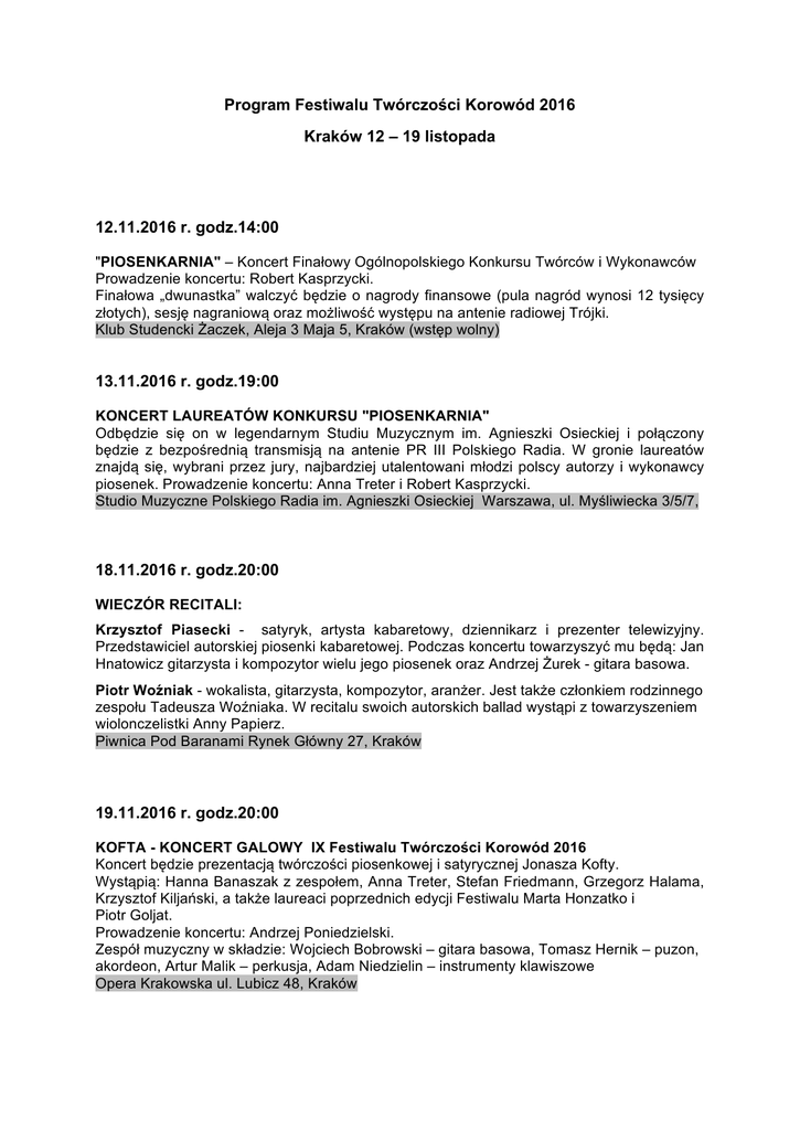 Program Festiwalu Twórczości Korowód 2016 Kraków 12 – 19 listopada 12.11.2016 r. godz.14:00 "PIOSENKARNIA" – Koncert Finałowy Ogólnopolskiego Konkursu Twórców i Wykonawców Prowadzenie koncertu: Robert Kasprzycki. Finałowa „dwunastka” walczyć będzie o nagrody finansowe (pula nagród wynosi 12 tysięcy złotych), sesję nagraniową oraz możliwość występu na antenie radiowej Trójki. Klub Studencki Żaczek, Aleja 3 Maja 5, Kraków (wstęp wolny) 13.11.2016 r. godz.19:00 KONCERT LAUREATÓW KONKURSU "PIOSENKARNIA" Odbędzie się on w legendarnym Studiu Muzycznym im. Agnieszki Osieckiej i połączony będzie z bezpośrednią transmisją na antenie PR III Polskiego Radia. W gronie laureatów znajdą się, wybrani przez jury, najbardziej utalentowani młodzi polscy autorzy i wykonawcy piosenek. Prowadzenie koncertu: Anna Treter i Robert Kasprzycki. Studio Muzyczne Polskiego Radia im. Agnieszki Osieckiej Warszawa, ul. Myśliwiecka 3/5/7, 18.11.2016 r. godz.20:00 WIECZÓR RECITALI: Krzysztof Piasecki - satyryk, artysta kabaretowy, dziennikarz i prezenter telewizyjny. Przedstawiciel autorskiej piosenki kabaretowej. Podczas koncertu towarzyszyć mu będą: Jan Hnatowicz gitarzysta i kompozytor wielu jego piosenek oraz Andrzej Żurek - gitara basowa. Piotr Woźniak - wokalista, gitarzysta, kompozytor, aranżer. Jest także członkiem rodzinnego zespołu Tadeusza Woźniaka. W recitalu swoich autorskich ballad wystąpi z towarzyszeniem wiolonczelistki Anny Papierz. Piwnica Pod Baranami Rynek Główny 27, Kraków 19.11.2016 r. godz.20:00 KOFTA - KONCERT GALOWY IX Festiwalu Twórczości Korowód 2016 Koncert będzie prezentacją twórczości piosenkowej i satyrycznej Jonasza Kofty. Wystąpią: Hanna Banaszak z zespołem, Anna Treter, Stefan Friedmann, Grzegorz Halama, Krzysztof Kiljański, a także laureaci poprzednich edycji Festiwalu Marta Honzatko i Piotr Goljat. Prowadzenie koncertu: Andrzej Poniedzielski. Zespół muzyczny w składzie: Wojciech Bobrowski – gitara basowa, Tomasz Hernik – puzon, akordeon, Artur Malik – perkusja, Adam Niedzielin – instrumenty klawiszowe Opera Krakowska ul. Lubicz 48, Kraków