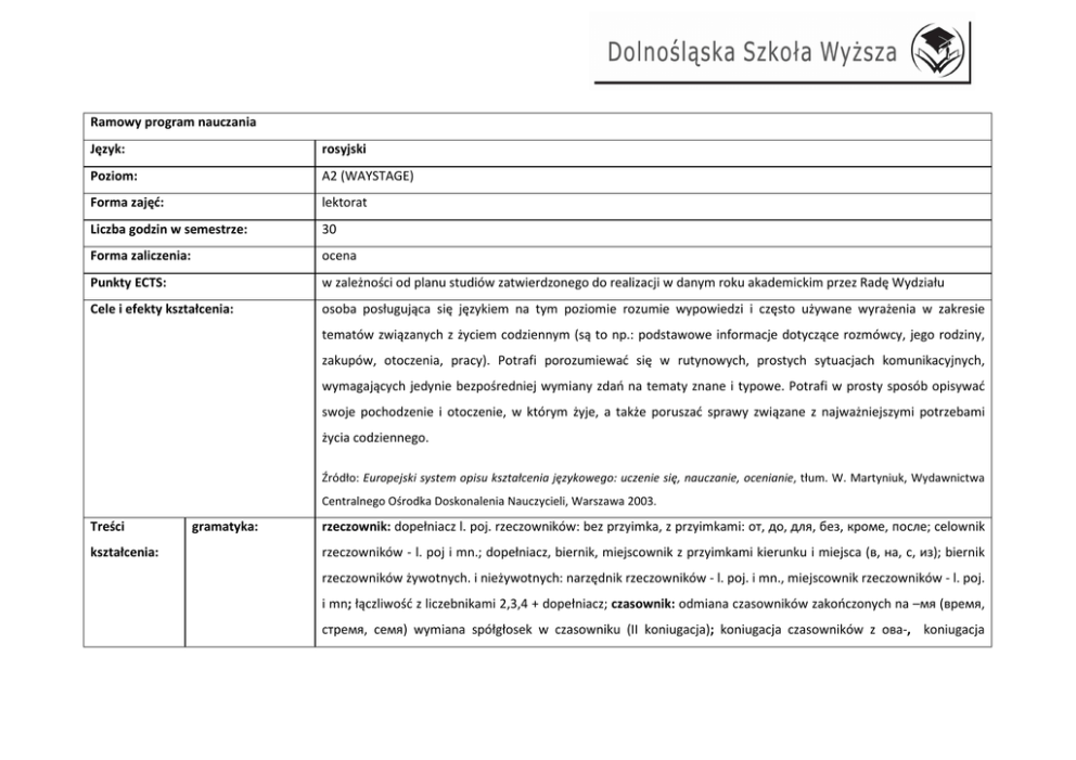 Ramowy program nauczania Język: rosyjski Poziom: A2