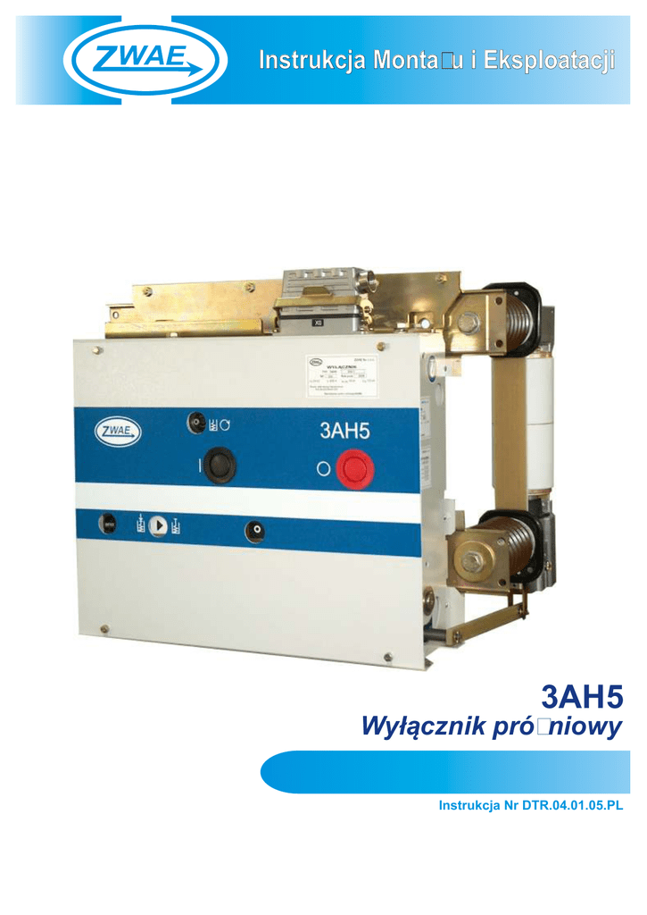 Instrukcja Montażu i Eksploatacji 3AH5 Wyłącznik próżniowy Instrukcja Nr DTR.04.01.05.PL Zakład Wytwórczy Aparatów Elektrycznych Sp. z o.o. ul. Gdańska 60; 84-300 Lębork Tel/Fax: (059) 86-336-15 / 86-333-86 www.zwae.com.pl e-mail: [email protected] OSTRZEŻENIE! W trakcie eksploatacji urządzeń elektrycznych określone części tych urządzeń elektrycznych znajdują się normalnie pod niebezpiecznym napięciem, a części mechaniczne, również zdalnie sterowane, mogą się szybko poruszać. Nieprzestrzeganie zaleceń ostrzegawczych może spowodować ciężkie obrażenia ciała lub szkody materialne. Tylko odpowiednio wykwalifikowany personel może pracować przy tym urządzeniu lub w jego pobliżu. Personel ten musi znać dokładnie wszystkie zasady bezpieczeństwa i reguły utrzymania urządzenia zgodnie z niniejszą instrukcją. Bezproblemowa i bezpieczna eksploatacja tego urządzenia wymaga odpowiedniego transportu, prawidłowego przechowywania, budowy i montażu, jak też starannej obsługi i utrzymania. 1. WSTĘP Wyłączniki próżniowe firmy ZWAE Sp. z o. o. typu 3AH5 są wyłącznikami trójbiegunowymi, wnętrzowymi dla zakresu napięć znamionowych od 12 kV do 36 kV. Łącznie z umieszczonym na tabliczce znamionowej oznaczeniem wykonania, kod produktu umożliwia pełny opis wyłącznika. Znaczenie poszczególnych znaków przedstawiono poniżej: Wyłącznik próżniowy składa się z przedziału napędowego z napędem sprężynowym i elementami sterowania, trzech biegunów łączeniowych z próżniowymi komorami łączeniowymi, izolatorów wsporczych z tworzywa i elementów przeniesienia napędu. W normalnych warunkach eksploatacyjnych wyłącznik próżniowy 3AH5 nie wymaga konserwacji. 1.1. Przepisy Wyłączniki próżniowe 3AH5 spełniają wymagania norm PN-EN 62271-100:2006 i PN-EN 62271-1:2009. 1.2. Zakres stosowania Dzięki specjalnej geometrii styków komory próżniowej, odpowiednio do tego celu opracowanemu materiałowi styków i z odpowiednio dobranym wyposażeniem napędu wyłączniki próżniowe typu 3AH5 firmy ZWAE Sp. z o.o. mogą być uniwersalnie stosowane we wszystkich dziedzinach, np. wszystkie wyłączniki z napędem zasobnikowym są z zasady przystosowane do sekwencji łączeniowej O - 0.3s - CO - 3min - CO (na życzenie Klienta O - 0.3s - CO - 15 s - CO). Ponadto możliwe są szczególne zastosowania jak na przykład wyłączniki dławików zwarciowych, wyłączniki piecowe itp., przy użyciu specjalnych rozwiązań. Oznaczenie podstawowe Napięcie znamionowe, wykonanie Znamionowy prąd zwarciowy wyłączalny Znamionowy prąd roboczy 3AH5 2 8 2 - 1 Podstawowa część kodu produktu jest podana na tabliczce znamionowej wyłącznika (rys. 2.1.), która poza tym zawiera dane odpowiadające skróconemu oznaczeniu. ZWAE Sp. z o.o. TYP 3AH5 NF 001 800 24 282-1 Rok prod. 2005 16 125 O-0,3s-CO-3 min-CO 2. DANE TECHNICZNE 2.1. Opis typu 2.1.1. Oznaczenie typu Wyłączniki próżniowe 3AH5 oznaczane są maszynowym kodem produktu. Składa się on z wieloznakowej kombinacji cyfr i liter, a pierwsze 8 znaków umieszczone jest na tabliczce znamionowej wyłącznika. Strona 2/16 Rysunek 2.1. Tabliczka znamionowa wyłącznika Tabliczka znamionowa znajduje się w prawym górnym rogu panelu czołowego wyłącznika oraz dodatkowo po prawej stronie kasetki napędowej wyłącznika. Uwaga: Przy pytaniach proszę podać oznaczenie typu, oznaczenie wykonania, rok budowy i numer fabryczny. Zakład Wytwórczy Aparatów Elektrycznych Sp. z o.o. ul. Gdańska 60; 84-300 Lębork Tel/Fax: (059) 86-336-15 / 86-333-86 www.zwae.com.pl e-mail: [email protected] 2.1.2. Dane znamionowe Obecnie dostępne są wyłączniki 3AH5 z następującymi danymi technicznymi: Ur kV Isc kA Ima kA PMB* mm Oznaczenie typu I r (uzupełnienie nr zamówieniowego) 800 A 1250 A 2000 A 2500 A 12 Up = 75 kV Ud = 28 kV 13,1 32,8 160 210 3AH5 1213AH5 131- 1 1 16 40 160 210 3AH5 1223AH5 132- 1 1 2 2 20 50 160 210 3AH5 1233AH5 133- 1 1 2 2 25 63 160 210 3AH5 1243AH5 134- 1 1 2 2 31,5 80 210 3AH5 135- 25 63 160 210 3AH5 2043AH5 214- 17,5 Up = 95 kV Ud = 38 kV 24 Up = 125 kV Ud = 50 kV 36 Up = 170 kV Ud = 70 kV 1 1 2 6 2 2 6 2 6 31,5 80 210 3AH5 215- 16 40 210 275 3AH5 2723AH5 282- 20 50 210 275 3AH5 2733AH5 283- 2 2 6 6 25 63 210 275 3AH5 2743AH5 284- 2 2 6 6 16 40 350 3AH5 312- 2 25 63 350 3AH5 314- 2 1 1 2 2 4 * Podziałka międzybiegunowa Ir Prąd znamionowy roboczy Isc Prąd znamionowy zwarciowy wyłączalny Ima Prąd znamionowy zwarciowy załączalny Ur Napięcie znamionowe izolacji Ud Napięcie znamionowe probiercze o częstotliwości sieciowej Up Napięcie znamionowe probiercze udarowe Tabela 2.1. Dane techniczne i oznaczenia typu 2.2. Parametry Definicje: Czas własny przy wyłączaniu (czas otwierania) = okres od rozpoczęcia czynności wyłączania (podanie polecenia) do chwili rozdzielenia styków na ostatnim biegunie. Czas styku przy cyklu ZAŁ-WYŁ = okres przy czynności załączania - wyłączania od chwili zetknięcia styków w pierwszym biegunie przy zamykaniu w chwili, w której przy występującym następnie otwieraniu rozdzielają się styki we wszystkich biegunach. Czas łukowy = okres od pojawienia się łuku do zgaszenia łuku we wszystkich biegunach. Czas przerwy - okres od zakończenia przepływu prądu we wszystkich biegunach do rozpoczęcia przepływu prądu w pierwszym biegunie. Czas wyłączania = okres od rozpoczęcia czynności wyłączania (podanie polecenia) do zgaszenia łuku w ostatnim biegunie wyłącznika (=czas własny przy wyłączaniu + czas łukowy). Czas własny przy załączaniu (czas zamykania) = okres od rozpoczęcia czynności załączania (podanie polecenia) do momentu zetknięcia się styków w ostatnim biegunie. Strona 3/16 Zakład Wytwórczy Aparatów Elektrycznych Sp. z o.o. ul. Gdańska 60; 84-300 Lębork Tel/Fax: (059) 86-336-15 / 86-333-86 www.zwae.com.pl e-mail: [email protected] Dla wyłączników próżniowych 3AH5 obowiązują następujące czasy łącze