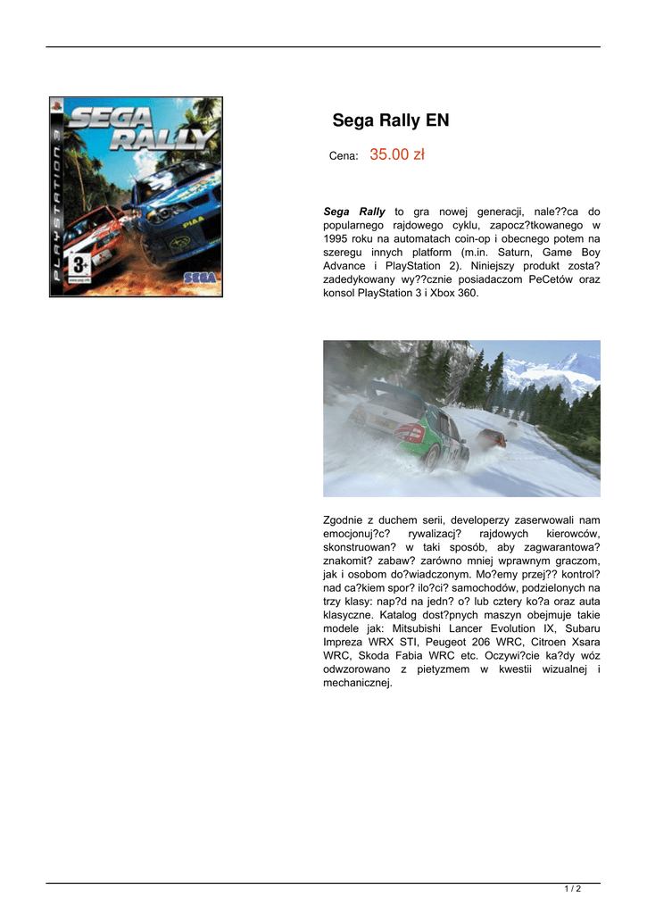 Sega Rally EN Cena: 35.00 zł Sega Rally to gra nowej generacji, nale??ca do popularnego rajdowego cyklu, zapocz?tkowanego w 1995 roku na automatach coin-op i obecnego potem na szeregu innych platform (m.in. Saturn, Game Boy Advance i PlayStation 2). Niniejszy produkt zosta? zadedykowany wy??cznie posiadaczom PeCetów oraz konsol PlayStation 3 i Xbox 360. Zgodnie z duchem serii, developerzy zaserwowali nam emocjonuj?c? rywalizacj? rajdowych kierowców, skonstruowan? w taki sposób, aby zagwarantowa? znakomit? zabaw? zarówno mniej wprawnym graczom, jak i osobom do?wiadczonym. Mo?emy przej?? kontrol? nad ca?kiem spor? ilo?ci? samochodów, podzielonych na trzy klasy: nap?d na jedn? o? lub cztery ko?a oraz auta klasyczne. Katalog dost?pnych maszyn obejmuje takie modele jak: Mitsubishi Lancer Evolution IX, Subaru Impreza WRX STI, Peugeot 206 WRC, Citroen Xsara WRC, Skoda Fabia WRC etc. Oczywi?cie ka?dy wóz odwzorowano z pietyzmem w kwestii wizualnej i mechanicznej. 1/2 Rajdowe zmagania tocz? si? w sze?ciu rozmaitych zak?tkach globu ziemskiego, a poszczególne trasy ró?ni? si? przede wszystkim nawierzchni?. Przyk?adowo gdy trafiamy na obszary b?otniste, mo?emy spodziewa? si? drogi grz?skiej i naszpikowanej koleinami. Kr?c?ce si? ko?a samochodów powoduj? przy okazji deformacj? takiej plastycznej nawierzchni i towarzysz?cy temu efekt wyrzucania w powietrze lepkich fragmentów pod?o?a. Zobacz wideo: 2/2 Powered by TCPDF (www.tcpdf.org)