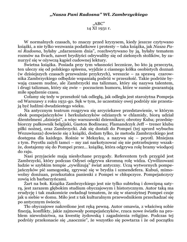 „Nasza Pani Radosna” Wł. Zambrzyckiego „ABC” 14 XI 1931 r. W normalnych czasach, to znaczy przed kryzysem, kiedy jeszcze czytywano książki, a nie tylko wezwania podatkowe i protesty – taka książka, jak Nasza Pani Radosna, byłaby „zdarzeniem dnia”, rozchwytywano by ją, byłaby tematem rozmów na fivach, nawet brydżyści odrywaliby się od zielonych stolików, by zanurzyć się w ożywczą kąpiel cudownej lektury. Świetna książka. Posiada przy tym własności lecznicze, bo kto ją przeczyta, ten uleczy się od polskiego spleenu, wyjdzie z ciasnego kółka osobistych doznań (w dzisiejszych czasach przeważnie przykrych), wreszcie – za sprawą czarownika Zambrzyckiego odbędzie wspaniałą podróż w przeszłość. Takie podróże bywają czasem nudne, ale Zambrzycki ma talizman, który się nazywa talentem, i drugi talizman, który się zwie – poczuciem humoru, które w sumie gwarantują miłe spędzenie czasu. Cofamy się tedy w przeszłość tak odległą, jak odległa jest starożytna Pompeja od Warszawy z roku 1931-go. Sęk w tym, że uczestnicy owej podróży nie przestają być ludźmi dwudziestego wieku. Na antycznym teatrum rozgrywa się arcyciekawe przedstawienie, w którym obok pompejańczyków i herkulańczyków odzianych w chlamidy, biorą udział dżentelmeni „dzisiejsi”, a więc warszawski dziennikarz; obrotny Kuba; przedsiębiorczy pułkownik belgijski, Gaston Bodineau; Flamandczyk Jeff – trener klubu piłki nożnej, oraz Zambrzycki. Jak się dostali do Pompei (tej sprzed wybuchu Wezuwiusza) dowiecie się z książki, dodam tylko, że metoda Zambrzyckiego jest dostępna dla każdego. Rośnie w Meksyku, a nazywa się – peyotl. Mniejsza z tym. Peyotlu zażyli tamci – my zaś narkotyzować się nie potrzebujemy wszakże, dostajemy się do Pompei przez... książkę, która odgrywa rolę bramy wiodącej do raju. Nasi przyjaciele mają niesłychane przygody. Referentem tych przygód jest Zambrzycki, który podczas Odysei odgrywa skromną rolę widza. Cywilizowani ludzie w szybkim tempie „cywilizują” świat antyczny. Uczą wytwornych pompejańczyków pić samogonkę, zgrywać się w brydża i szmendefera. Kubuś, mimowolny donżuan, przekształca panienki z Pompei w chłopczyce. Pompejańczycy zowią ich barbarzyńcami. Żart na bok. Książka Zambrzyckiego jest nie tylko subtelną i dowcipną satyrą, jest zarazem głębokim studium obyczajowym i historycznym. Autor taką ma erudycję i tak znakomicie owładnął tematem, że się w starożytnej Pompei czuje jak u siebie w domu. Miło jest z tak kulturalnym przewodnikiem przechadzać się po antycznym świecie. Tło obyczajowe nakreślone jest ręką pewną. Autor omawia, z właściwą sobie finezją, konflikty, jakie zajmowały pompejańczyków, rzuca nowe światło na problem niewolnictwa, na kwestię żydowską i zagadnienia religijne. Podczas tej podróży przekonacie się „naocznie”, że wszystko się powtarza i że od początku świata ludzie łamali sobie głowy nad rozwikływaniem tych samych zagadek. Najistotniejszą jednak sprawą jest odwieczna tęsknota do religii. Symbolem jej jest ów kapłan Seutes, który.... Ale o tym dowiecie się z książki. Zaznaczam tylko, że nasi przyjaciele powracają żywi z przeszłości w teraźniejszość, zgubiwszy po drodze Jeffa, który jako sportsmen ma zapewnioną karierę w prowincjach rzymskich, natomiast uprowadzają ze sobą kapłana Seutesa. Zambrzycki na szczęście nie został w Pompei. Ponoć przygotowuje pospołu z pułkownikiem Bodineau, Kubusiem i profesorem Herslevenem, kustoszem muzeum w Gandawie, wyprawę do starożytnej Niniwy. Ale to już muzyka przyszłości. Na razie notujemy radosny fakt pojawienia się na rynku księgarskim książki niezwykłej. el-ce
