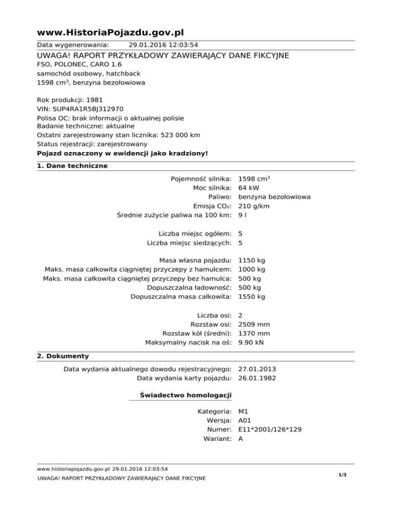 www.HistoriaPojazdu.gov.pl Data wygenerowania: 29.01.2016 12:03:54 UWAGA! RAPORT PRZYKŁADOWY ZAWIERAJĄCY DANE FIKCYJNE FSO, POLONEC, CARO 1.6 samochód osobowy, hatchback 1598 cm3, benzyna bezołowiowa Rok produkcji: 1981 VIN: SUP4RA1R5BJ312970 Polisa OC: brak informacji o aktualnej polisie Badanie techniczne: aktualne Ostatni zarejestrowany stan licznika: 523 000 km Status rejestracji: zarejestrowany Pojazd oznaczony w ewidencji jako kradziony! 1. Dane techniczne Pojemność silnika: Moc silnika: Paliwo: Emisja CO₂: Średnie zużycie paliwa na 100 km: Liczba miejsc ogółem: Liczba miejsc siedzących: Masa własna pojazdu: Maks. masa całkowita ciągniętej przyczepy z hamulcem: Maks. masa całkowita ciągniętej przyczepy bez hamulca: Dopuszczalna ładowność: Dopuszczalna masa całkowita: Liczba osi: Rozstaw osi: Rozstaw kół (średni): Maksymalny nacisk na oś: 1598 cm3 64 kW benzyna bezołowiowa 210 g/km 9l 5 5 1150 kg 1000 kg 500 kg 500 kg 1550 kg 2 2509 mm 1370 mm 9.90 kN 2. Dokumenty Data wydania aktualnego dowodu rejestracyjnego: Data wydania karty pojazdu: 27.01.2013 26.01.1982 Świadectwo homologacji Kategoria: Wersja: Numer: Wariant: M1 A01 E11*2001/126*129 A www.historiapojazdu.gov.pl 29.01.2016 12:03:54 UWAGA! RAPORT PRZYKŁADOWY ZAWIERAJĄCY DANE FIKCYJNE 1/3 3. Oś czasu 1981 Rok produkcji 26.01.1982 Pierwsza rejestracja w Polsce 26.01.1982 Pierwszy właściciel w Polsce Właściciel: osoba fizyczna Województwo, w którym pojazd zarejestrowano: dolnośląskie 19.02.1983 Badanie techniczne(ważne do 19.02.1984) 25.09.1999 Badanie techniczne(ważne do 25.09.2000) 30.09.1999 Zmiana właściciela Właściciel: osoba fizyczna Województwo, w którym pojazd zarejestrowano: kujawsko-pomorskie 09.03.2000 Badanie techniczne(ważne do 09.03.2001) 14.04.2001 Badanie techniczne(ważne do 14.04.2002) 10.04.2002 Badanie techniczne(ważne do 10.04.2003) 01.04.2003 Badanie techniczne(ważne do 01.04.2004) 01.09.2003 Zmiana właściciela Właściciel: osoba fizyczna Województwo, w którym pojazd zarejestrowano: lubelskie 01.09.2003 Dodanie współwłaściciela Współwłaściciel: osoba fizyczna 01.09.2003 Dodanie współwłaściciela Współwłaściciel: firma lub organizacja 30.03.2004 Badanie techniczne(ważne do 30.03.2005) 22.07.2005 Badanie techniczne(ważne do 22.07.2006) 02.04.2014 Badanie techniczne(ważne do 02.04.2015) Stan licznika: 523 000km (Uwaga. Stan licznika gromadzimy od 2014 r) 17.04.2014 Zgłoszenie kradzieży pojazdu! 29.01.2016 12:03:54 Wygenerowanie raportu Podsumowanie zdarzeń: Właściciele (od rejestracji do wygenerowania raportu): 3 Współwłaściciele (od rejestracji do wygenerowania raportu): 2 www.historiapojazdu.gov.pl 29.01.2016 12:03:54 UWAGA! RAPORT PRZYKŁADOWY ZAWIERAJĄCY DANE FIKCYJNE 2/3 Stan aktualny: Województwo, w którym pojazd zarejestrowano: lubelskie Polisa OC: brak informacji o aktualnej polisie Badanie techniczne: aktualne Pojazd oznaczony w ewidencji jako kradziony! Liczba właścicieli: 1 Liczba współwłaścicieli: 1 4. Informacje Uzyskane dane lub informacje (dalej zwane łącznie „danymi”) można wykorzystać tylko na własne ryzyko i na własną odpowiedzialność. Raport został wygenerowany zgodnie z aktualnym stanem Centralnej Ewidencji Pojazdów (CEP). Dane w CEP mogą nie odzwierciedlać stanu rzeczywistego, gdyż m.in.: • Dane gromadzone w Centralnej Ewidencji Pojazdów przekazują w różnym trybie i terminach różne zobowiązane do tego instytucje, w tym organy zajmujące się rejestracją pojazdów, stacje kontroli pojazdów i Policja, • Minister Cyfryzacji nie jest co do zasady uprawniony do samodzielnego: sprawdzania, wprowadzania, uzupełniania, aktualizowania, zmieniania lub usuwania gromadzonych danych, • na dane w CEP mogą mieć wpływ okoliczności związane z ich gromadzeniem (w tym siła wyższa, poziom jakości usług teletransmisyjnych, terminy przekazywania danych). Podstawa prawna: art. 80a ust. 2, art. 80b ust. 2 oraz art. 80c ust. 3e ustawy z dnia 20 czerwca 1997 r. – Prawo o ruchu drogowym (Dz. U. z 2012 r. poz. 1137, z późn. zm.). www.historiapojazdu.gov.pl 29.01.2016 12:03:54 UWAGA! RAPORT PRZYKŁADOWY ZAWIERAJĄCY DANE FIKCYJNE 3/3