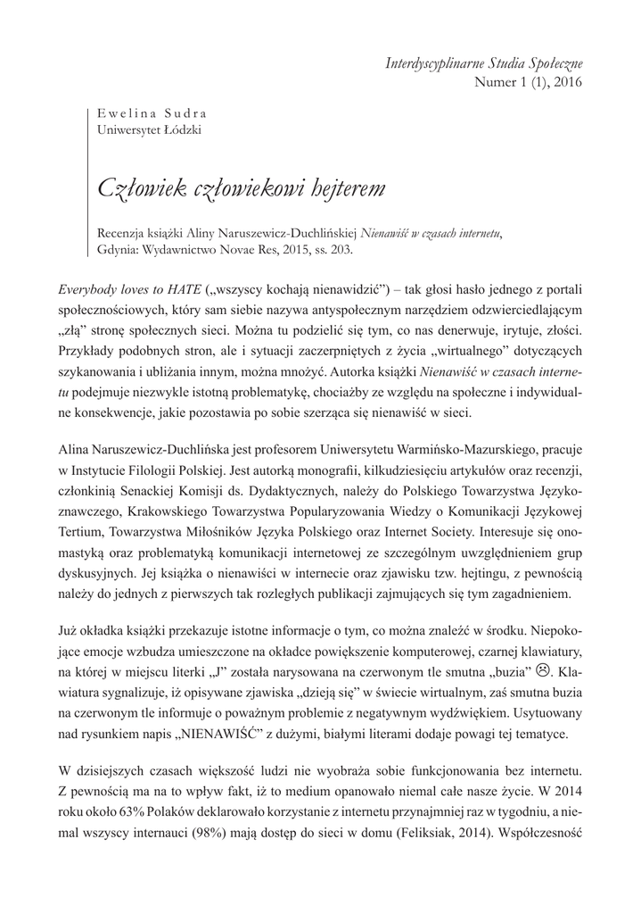 Interdyscyplinarne Studia Społeczne Numer 1 (1), 2016 Ewelina Sudra Uniwersytet Łódzki Człowiek człowiekowi hejterem Recenzja książki Aliny Naruszewicz-Duchlińskiej Nienawiść w czasach internetu, Gdynia: Wydawnictwo Novae Res, 2015, ss. 203. Everybody loves to HATE („wszyscy kochają nienawidzić”) – tak głosi hasło jednego z portali społecznościowych, który sam siebie nazywa antyspołecznym narzędziem odzwierciedlającym „złą” stronę społecznych sieci. Można tu podzielić się tym, co nas denerwuje, irytuje, złości. Przykłady podobnych stron, ale i sytuacji zaczerpniętych z życia „wirtualnego” dotyczących szykanowania i ubliżania innym, można mnożyć. Autorka książki Nienawiść w czasach internetu podejmuje niezwykle istotną problematykę, chociażby ze względu na społeczne i indywidualne konsekwencje, jakie pozostawia po sobie szerząca się nienawiść w sieci. Alina Naruszewicz-Duchlińska jest profesorem Uniwersytetu Warmińsko-Mazurskiego, pracuje w Instytucie Filologii Polskiej. Jest autorką monografii, kilkudziesięciu artykułów oraz recenzji, członkinią Senackiej Komisji ds. Dydaktycznych, należy do Polskiego Towarzystwa Językoznawczego, Krakowskiego Towarzystwa Popularyzowania Wiedzy o Komunikacji Językowej Tertium, Towarzystwa Miłośników Języka Polskiego oraz Internet Society. Interesuje się onomastyką oraz problematyką komunikacji internetowej ze szczególnym uwzględnieniem grup dyskusyjnych. Jej książka o nienawiści w internecie oraz zjawisku tzw. hejtingu, z pewnością należy do jednych z pierwszych tak rozległych publikacji zajmujących się tym zagadnieniem. Już okładka książki przekazuje istotne informacje o tym, co można znaleźć w środku. Niepokojące emocje wzbudza umieszczone na okładce powiększenie komputerowej, czarnej klawiatury, na której w miejscu literki „J” została narysowana na czerwonym tle smutna „buzia” L. Klawiatura sygnalizuje, iż opisywane zjawiska „dzieją się” w świecie wirtualnym, zaś smutna buzia na czerwonym tle informuje o poważnym problemie z negatywnym wydźwiękiem. Usytuowany nad rysunkiem napis „NIENAWIŚĆ” z dużymi, białymi literami dodaje powagi tej tematyce. W dzisiejszych czasach większość ludzi nie wyobraża sobie funkcjonowania bez internetu. Z pewnością ma na to wpływ fakt, iż to medium opanowało niemal całe nasze życie. W 2014 roku około 63% Polaków deklarowało korzystanie z internetu przynajmniej raz w tygodniu, a niemal wszyscy internauci (98%) mają dostęp do sieci w domu (Feliksiak, 2014). Współczesność 100 Ew elina Surda charakteryzuje się, między innymi, dynamicznym postępem i rozwojem nowych technologii. Modernizacja, technicyzacja i informatyzacja wkroczyły w niemal każdą sferę aktywności człowieka. Jednak oprócz pozytywnych zmian związanych z internetem, wskazuje się również na wiele zagrożeń. Co za tym idzie, zmienia się również przestrzeń dla badań społecznych – ulega ona znacznemu rozszerzeniu. W związku z tym można stwierdzić, iż dzięki rozpowszechnianiu się internetu pojawiają się nowe możliwości dla badaczy. Nie muszą być oni ograniczeni jedynie do badania respondentów w przestrzeni realnej, lecz mogą również wykorzystać w tym celu przestrzeń wirtualną. „Internet jest najważniejszym nośnikiem zmiany cywilizacyjnej we współczesnym świecie (…). Dzięki internetowi zachodzi radykalna zmiana przestrzeni społecznej i kontekstu społecznego, w którym znajduje się jednostka. (…) Internet stał się najpełniejszym wyrazem ponowoczesnego, sieciowego społeczeństwa informacyjnego” (Batorski, Marody, Nowak 2006, s. 18). Niektórzy badacze twierdzą, iż mamy już do czynienia z nowym trendem w socjologii, tak zwaną cybersocjologią. Zajmuje się ona komunikacją zapośredniczoną przez komputer, jak również działaniami badawczymi dotyczącymi społecznych aspektów internetu (Kubczak 2002, s. 184). W nurt tego typu badań wpisuje się recenzowana książka. Autorka analizując wypowiedzi internautów próbuje zrozumieć podstawy i uwarunkowania komunikacji internetowej, która przekroczyła normy dobrego zachowania. Komunikacja ta, jak się okazuje, wiele czerpie z możliwości, jakie dostarcza użytkownikom internet. Internet wpływa na zachowania wielu grup społecznych. „Fenomen Internetu polega jednak na tym, że ze społecznego punktu widzenia jest on obecnie czymś znacznie więcej niż jedynie technologią komunikacyjną. Dla wielu grup społecznych stał się naturalnym środowiskiem funkcjonowania społecznego, pozwalającym na zaspokojenie większości społecznych potrzeb i motywacji. Służy nie tylko do poszukiwania informacji, lecz również do zawierania i podtrzymywania znajomości i bliskich związków. Co więcej, sieć jest także środowiskiem tworzenia się nowych społeczności oraz norm społecznych i kulturowych” (Zając, Krejtz 2007, s. 191). Do tego zestawu zjawisk opisujących fenomen internetu należałoby również dodać poszerzenie społecznego przyzwolenia na obrażanie, wyśmiewanie innych w sieci w coraz bardziej wulgarny i agresywny sposób. Naruszewicz-Duchlińska zwraca uwagę, iż przeciętni internauci, wykorzystując anonimowość oraz brak konsekwencji swoich antyspołecznych zachowań, często wchodzą w rolę krytyka wszystkich i wszystkiego. Wpływają oni na przestrzeń komunikacyjną, w której sami funkcjonują. Nazywa się ich „hejterami”, a całe zjawisko „hejtingiem” (od ang. hate). Choć obraźliwe sformułowania w internecie stanowią zaledwie (a może aż) 2,5% wszystkich internetowych wypowiedzi, to jednak, jak słusznie zauważa autorka, mamy do czynienia z inklinacją pozytywną powodującą, że neutralne i pozytywne komentarze pozostają bez echa, a negatywne komunikaty potęgują wzmożoną uwagę i rodzą negatywne emocje na zasadzie kuli śnieżnej. Człowiek człowiekowi 