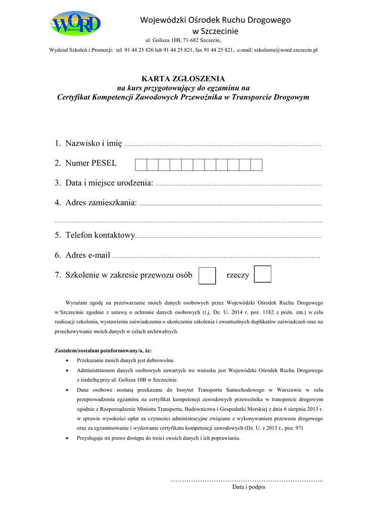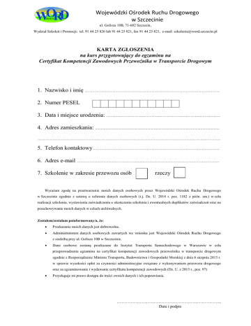 Wojewódzki Ośrodek Ruchu Drogowego w Szczecinie ul. Golisza 10B, 71-682 Szczecin, Wydział Szkoleń i Promocji: tel. 91 44 25 826 lub 91 44 25 821, fax 91 44 25 821, e-mail: [email protected] KARTA ZGŁOSZENIA na kurs przygotowujący do egzaminu na Certyfikat Kompetencji Zawodowych Przewoźnika w Transporcie Drogowym 1. Nazwisko i imię …………………………………………………………………………….………………. 2. Numer PESEL 3. Data i miejsce urodzenia: ……………………………………………………………………………… 4. Adres zamieszkania: ................................................................................................................................... ………………………………………………………………………………………………………………………………. 5. Telefon kontaktowy……………………………………………………………………….………………. 6. Adres e-mail ……………………………………………………………………………………….…………. 7. Szkolenie w zakresie przewozu osób rzeczy Wyrażam zgodę na przetwarzanie moich danych osobowych przez Wojewódzki Ośrodek Ruchu Drogowego w Szczecinie zgodnie z ustawą o ochronie danych osobowych (t.j. Dz. U. 2014 r. poz. 1182 z późn. zm.) w celu realizacji szkolenia, wystawienia zaświadczenia o ukończeniu szkolenia i ewentualnych duplikatów zaświadczeń oraz na przechowywanie moich danych w celach archiwalnych. Zostałem/zostałam poinformowany/a, że: Przekazanie moich danych jest dobrowolne. Administratorem danych osobowych zawartych we wniosku jest Wojewódzki Ośrodek Ruchu Drogowego z siedzibą przy ul. Golisza 10B w Szczecinie. Dane osobowe zostaną przekazane do Instytut Transportu Samochodowego w Warszawie w celu przeprowadzenia egzaminu na certyfikat kompetencji zawodowych przewoźnika w transporcie drogowym zgodnie z Rozporządzenie Ministra Transportu, Budownictwa i Gospodarki Morskiej z dnia 6 sierpnia 2013 r. w sprawie wysokości opłat za czynności administracyjne związane z wykonywaniem przewozu drogowego oraz za egzaminowanie i wydawanie certyfikatu kompetencji zawodowych (Dz. U. z 2013 r., poz. 97) Przysługuje mi prawo dostępu do treści swoich danych i ich poprawiania. ………………………………………………………….. Data i podpis
