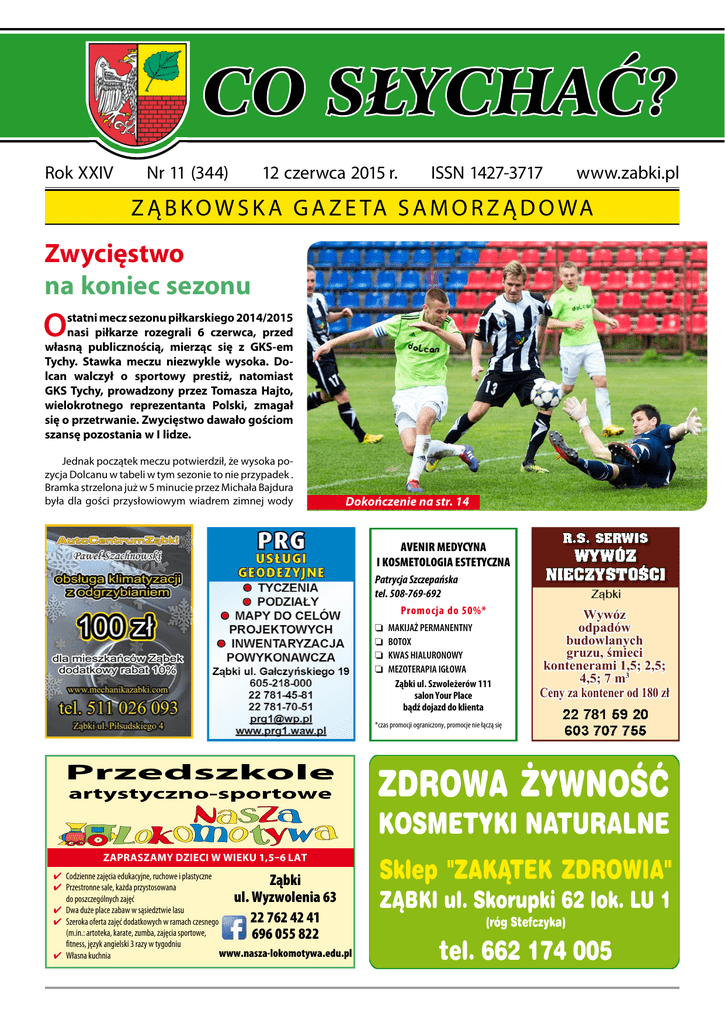 Rok XXIV Nr 11 (344) 12 czerwca 2015 r. ISSN 1427-3717 www.zabki.pl Z ą b k o w s k a G a z e ta S a m o rz ą d o wa Zwycięstwo naY Dkoniec W A R Z E N Isezonu A www.zabki.pl O statni mecz sezonu piłkarskiego 2014/2015 nasi piłkarze rozegrali 6 czerwca, przed własną publicznością, mierząc się z GKS-em Tychy. Stawka meczu niezwykle wysoka. Dolcan walczył o sportowy prestiż, natomiast GKS Tychy, prowadzony przez Tomasza Hajto, wielokrotnego reprezentanta Polski, zmagał się o przetrwanie. Zwycięstwo dawało gościom szansę pozostania w I lidze. Jednak początek meczu potwierdził, że wysoka pozycja Dolcanu w tabeli w tym sezonie to nie przypadek . Bramka strzelona już w 5 minucie przez Michała Bajdura była dla gości przysłowiowym wiadrem zimnej wody Dokończenie na str. 14 AVENIR MEDYCYNA I KOSMETOLOGIA ESTETYCZNA Wywóz odpadów budowlanych gruzu, śmieci kontenerami 1,5; 2,5; 4,5; 7 m3 Ceny za kontener od 180 zł Patrycja Szczepańska tel. 508-769-692 Promocja do 50%* MAKIJAŻ PERMANENTNY BOTOX KWAS HIALURONOWY MEZOTERAPIA IGŁOWA Ząbki ul. Szwoleżerów 111 salon Your Place bądź dojazd do klienta *czas promocji ograniczony, promocje nie łączą się Przedszkole artystyczno-sportowe ZAPRASZAMY DZIECI W WIEKU 1,5–6 LAT Codzienne zajęcia edukacyjne, ruchowe i plastyczne Przestronne sale, każda przystosowana do poszczególnych zajęć Dwa duże place zabaw w sąsiedztwie lasu Szeroka oferta zajęć dodatkowych w ramach czesnego (m.in.: artoteka, karate, zumba, zajęcia sportowe, fitness, język angielski 3 razy w tygodniu www.nasza-lokomotywa.edu.pl Własna kuchnia Ząbki ul. Wyzwolenia 63 22 762 42 41 696 055 822 Wywóz odpadów budowlanych JUuzu ëPLHcL NonWHnHUaPL P3 &Hny za NonWHnHU od zß CO SŁYCHAĆ ZAPOWIEDZI www.zabki.pl Fundacja Instytut Nowoczesnej Edukacji i American Systems mają zaszczyt zaprosić na konferencję KOŁO PRZYJACIÓŁ RADIA MARYJA PRZY PARAFII ŚW. TRÓJCY PIELGRZYMKE AUTOKAROWĄ RADIA MARYJA NA JASNA GÓRĘ „SZYBKI START DAJE PRZEWAGĘ” Szanowni Państwo, serdecznie zapraszamy na konferencję upowszechniającą i promującą projekt „SZYBKI START DAJE PRZEWAGĘ” w ramach Programu Operacyjnego Kapitał Ludzki finansowanego ze środków Unii Europejskiej w ramach Priorytetu III – Wysoka jakość systemu oświaty, Działanie 3.3 – Poprawa jakości kształcenia, Poddziałanie 3.3.4. – Modernizacja treści i metod kształcenia – priorytety konkursowe. W programie m.in.: – Podsumowanie i ewaluacja projektu „SZYBKI START DAJE PRZEWAGĘ”, – Zaprezentowanie gry „SZYBKI START”, – Konkurs z nagrodami. Warunki uczestnictwa: udział w konferencji jest bezpłatny. Liczba miejsc ograniczona. SERDECZNIE ZAPRASZAMY Osoba do kontaktu: Elżbieta Wiśniowska – Asystent Kierownika Projektu, email: [email protected] WYJAZD AUTOKARU W DNIU 12 LIPCA 2015r. (niedziela): spod „AGROMY” o godz. 4:00 spod kościoła Św. Trójcy o godz. 4:15 KOSZT PIELGRZYMKI – 55 ZŁ Osoby chętne i zdecydowane, mogą zgłaszać swój udział do dnia 30 czerwca br. dzwoniąc pod numer telefonu: 535 297 426 DRODZY PRZYJACIELE, SŁUCHACZE I TELEWIDZOWIE, PRAGNĄCY BYĆ PODOBNI DO EWANGELICZNEGO SIEWCY. WSZYSTKICH, KTÓRZY KOCHAJĄ PANA BOGA, MATKĘ NAJŚWIĘTSZĄ, KOŚCIÓŁ I POLSKĘ SERDECZNIE ZAPRASZAMY DO WSPÓLNEJ MODLITWY. UWAGA – ILOŚĆ MIEJSC OGRANICZONA! CO SŁYCHAĆ? Wydawca: Urząd Miasta w Ząbkach Redaktor naczelny: Mirosław Oleksiak e-mail: [email protected], tel. 694 759 987 Redakcja: ul. Wojska Polskiego 10, Ząbki, tel. 22 5109 793 Druk: Drukarnia Rajgraf, ul. Mazowiecka 50B, 05-120 Legionowo, tel. 22 784 86 58 Redakcja nie odpowiada za treść ogłoszeń i reklam. Nakład 6000 egz. 2 organizuje DYŻURY REDAKCYJNE: red. Mirosław Oleksiak Urząd Miasta pok. nr 28 poniedziałki godz. 16.00–18.00 piątki godz. 8.00–10.00 www.zabki.pl Zapowiedzi CO SŁYCHAĆ WARSZTAT DEKARSKI • cięcie i gięcie obróbek do 4 mb • nasady kominowe • orynnowanie z ocynku • zamówienia indywidualne • parapety zewnętrzne • akcesoria dachowe Ząbki, ul. Jana Pawła II 20 tel. 502 073 760 Autoserwis ROMIKA – blacharstwo-lakiernictwo www.romika.com.pl Pielęgniarka z dużym doświadczeniem zaopiekuje się leżącą osobą oraz wykona w domu pacjenta zabiegi: –zastrzyki – zmiana opatrunków – stawianie baniek – podłączenie kroplówki – założenie i wymiana cewnika do pęcherza moczowego (kobieta/ mężczyzna) – założenie sondy żołądkowej tel. 530-372-798 GABINET LEKARSKI ANDRZEJ KACZOREK Ząbki ul. Niepodległości 1A – internista – specjalista med. rodzinnej i medycyny pracy – badania profilaktyczne pracowników (wstępne, okresowe, kontrolne) – badania dla celów sanitarno-epidemiologicznych – badania kierowców wszystkich kategorii – EKG, spirometria (bad. układu oddechowego) – drobne zabiegi (zastrzyki) Gabinet czynny codziennie tylko po uzgodnieniu wizyty telefonicznie w godz. 800–2000 tel. 603 927 323 www.lekarz-zabki.pl 3 CO SŁYCHAĆ ZAPOWIEDZI www.zabki.pl MCS Miejskie Centrum Sportu w Ząbkach ZĄBKI zaprasza wszystkie dzieci ze szkół podstawowych na Zawody Pływackie na basenie w Ząbkach Startujemy 23 czerwca 2015 roku o godzinie 9:00! Zapraszamy wszystkie dzieciaki! Do wygrania atrakcyjne nagrody. Gwarantujemy świetną zabawę i dużo sportowych emocji! ZgłosZenia PrZyjmujemy do 18 cZerwca w biurze obsługi klienta 8:00-16:00 lub w szkołach u nauczycieli WF Pływalnia 4 ul. słowackiego 21 Ząbki Samorząd www.zabki.pl CO SŁYCHAĆ Medal za zasługi dla rzemiosła polskiego W dniu 29 maja br. burmistrz Ząbek Robert Perkowski został odznaczony prestiżowym Złotym Medalem im. Jana Kilińskiego za aktywną działalność w realizacji społeczno-zawodowych i gospodarczych zadań rzemiosła a w szczególności za zaangażowanie we wsparcie procesu wdrażania Programu „Samorządowa Polska”. To bardzo zaszczytne wyróżnienie przyznawane jest tylko raz. Warto dodać, że wyż