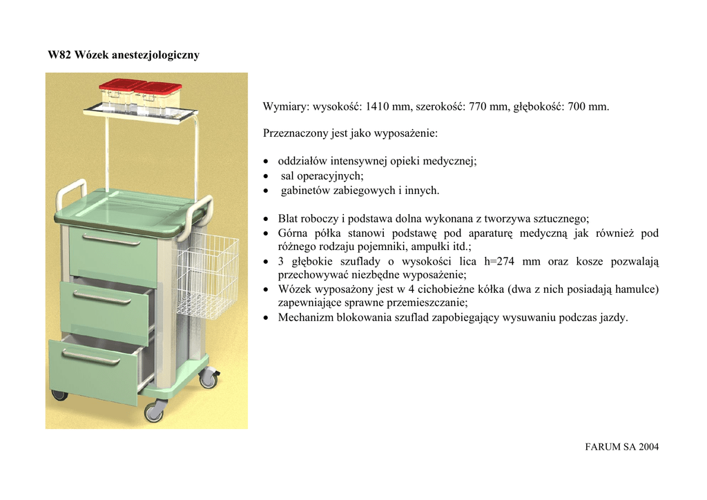 W82 Wózek anestezjologiczny Wymiary: wysokość: 1410 mm, szerokość: 770 mm, głębokość: 700 mm. Przeznaczony jest jako wyposażenie:  oddziałów intensywnej opieki medycznej;  sal operacyjnych;  gabinetów zabiegowych i innych.  Blat roboczy i podstawa dolna wykonana z tworzywa sztucznego;  Górna półka stanowi podstawę pod aparaturę medyczną jak również pod różnego rodzaju pojemniki, ampułki itd.;  3 głębokie szuflady o wysokości lica h=274 mm oraz kosze pozwalają przechowywać niezbędne wyposażenie;  Wózek wyposażony jest w 4 cichobieżne kółka (dwa z nich posiadają hamulce) zapewniające sprawne przemieszczanie;  Mechanizm blokowania szuflad zapobiegający wysuwaniu podczas jazdy. FARUM SA 2004