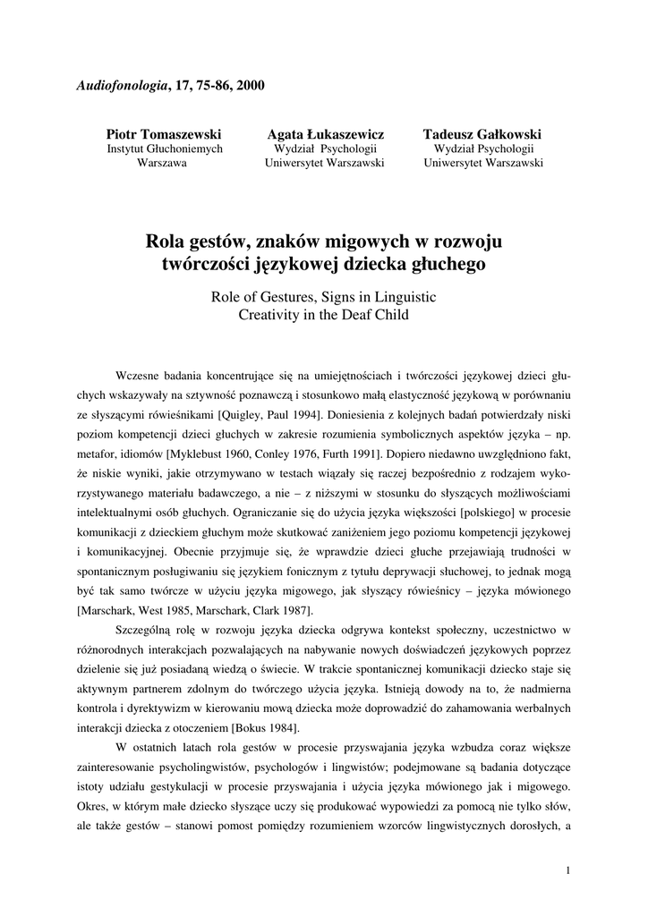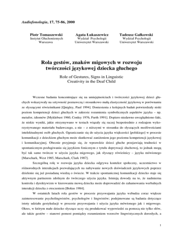Audiofonologia, 17, 75-86, 2000 Piotr Tomaszewski Agata Łukaszewicz Tadeusz Gałkowski Instytut Głuchoniemych Warszawa Wydział Psychologii Uniwersytet Warszawski Wydział Psychologii Uniwersytet Warszawski Rola gestów, znaków migowych w rozwoju twórczości językowej dziecka głuchego Role of Gestures, Signs in Linguistic Creativity in the Deaf Child Wczesne badania koncentrujące się na umiejętnościach i twórczości językowej dzieci głuchych wskazywały na sztywność poznawczą i stosunkowo małą elastyczność językową w porównaniu ze słyszącymi rówieśnikami [Quigley, Paul 1994]. Doniesienia z kolejnych badań potwierdzały niski poziom kompetencji dzieci głuchych w zakresie rozumienia symbolicznych aspektów języka – np. metafor, idiomów [Myklebust 1960, Conley 1976, Furth 1991]. Dopiero niedawno uwzględniono fakt, że niskie wyniki, jakie otrzymywano w testach wiązały się raczej bezpośrednio z rodzajem wykorzystywanego materiału badawczego, a nie – z niższymi w stosunku do słyszących możliwościami intelektualnymi osób głuchych. Ograniczanie się do użycia języka większości [polskiego] w procesie komunikacji z dzieckiem głuchym może skutkować zaniżeniem jego poziomu kompetencji językowej i komunikacyjnej. Obecnie przyjmuje się, że wprawdzie dzieci głuche przejawiają trudności w spontanicznym posługiwaniu się językiem fonicznym z tytułu deprywacji słuchowej, to jednak mogą być tak samo twórcze w użyciu języka migowego, jak słyszący rówieśnicy – języka mówionego [Marschark, West 1985, Marschark, Clark 1987]. Szczególną rolę w rozwoju języka dziecka odgrywa kontekst społeczny, uczestnictwo w różnorodnych interakcjach pozwalających na nabywanie nowych doświadczeń językowych poprzez dzielenie się już posiadaną wiedzą o świecie. W trakcie spontanicznej komunikacji dziecko staje się aktywnym partnerem zdolnym do twórczego użycia języka. Istnieją dowody na to, że nadmierna kontrola i dyrektywizm w kierowaniu mową dziecka może doprowadzić do zahamowania werbalnych interakcji dziecka z otoczeniem [Bokus 1984]. W ostatnich latach rola gestów w procesie przyswajania języka wzbudza coraz większe zainteresowanie psycholingwistów, psychologów i lingwistów; podejmowane są badania dotyczące istoty udziału gestykulacji w procesie przyswajania i użycia języka mówionego jak i migowego. Okres, w którym małe dziecko słyszące uczy się produkować wypowiedzi za pomocą nie tylko słów, ale także gestów – stanowi pomost pomiędzy rozumieniem wzorców lingwistycznych dorosłych, a 1 okresem wytwarzania wypowiedzi poprzez prawidłowe posługiwanie się konwencjonalnymi symbolami [Bates i in. 1989]. Jednak wejście w etap, na którym dziecko staje się kompetentnym użytkownikiem języka znając podstawy prawidłowego operowania strukturami językowymi nie powoduje drastycznego ograniczenia użycia gestów przy jednoczesnym posługiwaniu się słowami. Gesty jako pozawerbalne komponenty komunikacji pozostają na stałe w języku mówionym, tworząc wraz z nim zintegrowany system językowy; ponadto mogą one odzwierciedlać reprezentację rzeczywistości w umyśle [McNeill 1985]. Gesty, jakimi posługują się małe dzieci głuche – zwłaszcza rodziców głuchych – w okresie przedjęzykowym pełnią rolę „kamienia milowego” na drodze nabywania podstaw kompetencji językowej i komunikacyjnej w polskim języku migowym [PJM]. Stadia rozwoju językowego dziecka głuchego rodziców głuchych posługujących się językiem migowym w procesie komunikacji odpowiadają stadiom rozwoju językowego dziecka słyszącego rodziców słyszących – bez względu na rodzaj modalności zmysłowej [Schlesinger, Meadow 1972, Hoffmeister, Wilbur 1980]. Tak więc następują po sobie: okres komunikacji przedjęzykowej [7–10 m. ż.], okres wypowiedzi jednowyrazowych /jednogestowych/ [12–18 m. ż.], okres wypowiedzi dwuwyrazowych /dwugestowych/ [18–22 m. ż.] i okres opanowania podstaw językowych [22–36 m. ż.] [Newport, Meier 1985]. Inaczej przedstawia się sytuacja dzieci głuchych rodziców słyszących. Aby dobrze sklasyfikować aktywność językową każdego dziecka głuchego, należy uwzględnić, że dzieci głuche w większym stopniu stanowią grupę heterogeniczną niż słyszące. Oprócz różnicowania związanego z utratą słuchu, dzieci głuche często mają różne doświadczenia społeczne, językowe i być może także umiejętności poznawcze [Marschark w druku]. Stąd – w ogólnej populacji dzieci głuchych należy wyróżnić podgrupy, które w mniejszym lub większym stopniu różnią się od siebie pod względem językowym: [1] dzieci głuche rodziców głuchych [DGRG] mające wczesny i stały kontakt z językiem migowym [od urodzenia]; [2] dzieci głuche rodziców słyszących [DGRS] mające wczesny kontakt z językiem migowym [od 2, 3 roku życia]; [3] DGRS mające późny kontakt z językiem migowym [od 5 do 7 roku życia]; [4] DGRS nie mające kontaktu z językiem migowym, ale obracające się w środowisku rówieśniczym, gdzie przebywają też inne DGRS. Celem niniejszego referatu jest zaprezentowanie kilka przykładów1 wypowiedzi DGRS wychowanych w różnych warunkach językowych. Obracać się będzie to wokół pytania: czy i w jaki sposób DGRS może stać się twórcze w użyciu języka ? 1 W trakcie badań zastosowano kamerę video rejestrującą zachowania językowe i pozawerbalne dzieci głuchych w sytuacjach swobodnej zabawy, z czego powstał materiał, który umożliwia obserwację strumieni aktywności językowych dzieci w naturalnych sytuacjach. Wykorzystywano również metodę bezpośredniej obserwacji, na podstawie której rozporządzano pisemne zapiski wypowiedzeń DGRS. Materiały w postaci nagrań na video, jak i pisemnych notatek są obecnie wykorzystywane do analizy zapisu wypowiedzi DGRS; wobec tego zademonstrowane tutaj będą niektóre z przypadk