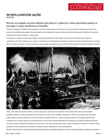 WYSPA ŁOWCÓW GŁÓW 2012-12-28 Borneo ze względu na pola naftowe było jednym z głównych celów japońskiej agresji na początku II wojny światowej na Pacyfiku. Holendrzy i Brytyjczycy podbój Borneo rozpoczęli w XIX wieku. Kolonizatorzy po umocnieniu się na wybrzeżach rozszerzali swą kontrolę nad trzecią co do wielkości wyspą świata. Niemniej jednak w trudno dostępnych miejscach Borneo nadal żyły według swych odwiecznych obyczajów budzące strach plemiona Dajaków – łowców głów. Ta trzecia co do wielkości wyspa świata nabrała znaczenia gospodarczego, kiedy odkryto na niej złoża ropy naftowej (na początku lat czterdziestych XX wieku wydobywano ją zarówno w brytyjskiej, jak i holenderskiej części Borneo). Rządy obu państw miały świadomość, jak istotny jest ten surowiec dla Japonii, co w razie wybuchu wojny oznaczało, że zaatakuje ona te terytoria. Borneo leżało też na ważnych szlakach morskich, a z tamtejszych lotnisk można było uderzyć zarówno na Singapur, jak i Batawię (dzisiejsza Dżakarta) na Jawie. Kiedy w tym regionie doszło do konfliktu z Japonią, Brytyjczycy i Holendrzy nie byli jednak w stanie skutecznie bronić swych azjatyckich posiadłości. Rząd w Londynie postanowił skoncentrować się na obronie Indii i Malajów z Singapurem. Na Borneo rozmieszczono tylko jeden indyjski batalion piechoty, baterię dział 152-milimetrowych i kompanię forteczną – nieco ponad tysiąc żołnierzy. W brytyjskiej części Borneo znajdowały się co prawda lotniska, ale nie stacjonował na nich ani jeden samolot Królewskich Sił Powietrznych. Istniały też miejscowe formacje ochotnicze, jednak dowództwo w Singapurze 7 grudnia 1941 roku, czyli już po wybuchu wojny, wydało instrukcję, by nie brały one udziału w walce, ponieważ nie były wyszkolone ani uzbrojone, by stanąć do walki z zaprawionymi w boju Japończykami. Pierwszy atak sił Imperium Wschodzącego Słońca skierowany był na brytyjską część Borneo. Około 2,5 tysiąca żołnierzy wylądowało 16 grudnia w Autor: Tadeusz Wróbel Strona: 1 rejonie portowego miasta Miri w Sarawaku. Niewielki brytyjski garnizon krótko stawiał opór. Po zajęciu pól naftowych w Miri i Serii (w Brunei) japońska armia postanowiła opanować stolicę regionu Kuching. Najeźdźcy wkroczyli do miasta 24 grudnia. Pozostałości zgrupowania brytyjskohinduskiego wycofały się przed końcem miesiąca z Sarawaku w rejon lotniska Singkawang II w Kalimantanie. Żołnierze dotarli tam tylko z lekką bronią, ponieważ musieli porzucić pojazdy i ciężkie uzbrojenie, gdy skończyła się droga. 19 stycznia Brytyjskie Borneo Północne znalazło się pod całkowitą kontrolą Japończyków. Wcześniej Japończycy rozpoczęli inwazję na holenderską część Borneo. 11 stycznia 1942 roku wylądowali na wysepce Tarakan u wybrzeży północnego Kalimantanu. Najeźdźcy chcieli przejąć kilkaset szybów naftowych, rafinerie i lotniska. Wyspy broniło ponad 1,3 tysiąca żołnierzy mających działa artylerii nadbrzeżnej i przeciwlotnicze oraz kilka samochodów opancerzonych. Dowódca holenderskiego garnizonu podpułkownik Simon de Waal był przygotowany na atak, ponieważ dzień wcześniej łódź latająca Do-24K wykryła flotę inwazyjną. Rozkazał zniszczyć instalacje pól naftowych. Później Japończycy zemścili się za to na holenderskich jeńcach i inżynierach pracujących przy wydobyciu ropy. Kolejnym celem sił japońskich był Balikpapan, położony na wschodnim wybrzeżu Borneo. Zbliżające się do tego miasta wojska agresora były atakowane przez holenderskie lotnictwo i okręt podwodny oraz cztery amerykańskie niszczyciele. Alianci zatopili kilka jednostek przeciwnika. Pomimo poniesionych strat Japończykom udało się wieczorem 24 stycznia 1942 roku wysadzić pierwszy desant, a potem następne. Część z około 1,1 tysiąca żołnierzy pod komendą podpułkownika Cornelisa van den Hoogenbanda, którzy bronili Balikpapanu, się wycofała. Oficer nie czekał na atak i już wcześniej rozkazał niszczyć instalacje naftowe. 22 lutego 1942 roku najeźdźcy zmasakrowali w Balikpapanie 72 holenderskich jeńców i dwóch cywilów – podobnie jak na Tarakanie, była to zemsta. To było ostatnie większe starcie podczas kampanii w Kalimantanie. Od tej pory oddziały holenderskie praktycznie bez walki wycofywały się z kolejnych miast. Wieści o porażkach sił alianckich na Filipinach i innych wyspach południowo-wschodniej Azji oraz o upadku Singapuru działały demoralizująco na obrońców Borneo. Wojskowi wiedzieli, że nie ma szans na odsiecz, a za opór Japończycy mogą zemścić się na holenderskich cywilach. Do tego dochodziły dezercje tubylczych żołnierzy i niechętna lub wręcz wroga postawa większości miejscowej ludności. Holendrzy zbierali gorzkie owoce swej polityki wobec Azjatów. Po zajęciu Balikpapanu głównym celem japońskiej operacji była stolica holenderskiej części Borneo. Japończycy weszli 10 lutego do Banjarmasinu, nie napotkawszy oporu. Oddziały pod komendą podpułkownika Henry’ego T. Halkema wycofały się z miasta w rejon lotniska Kotawarangin w środkowej części wyspy. 6 marca 1942 roku najeźdźcy zajęli miasto Sampit, a trzy dni później, po poddaniu się garnizonu na lotnisku Kotawarangin, wkroczyli do miejscowości Pangkalan Bun. To wydarzenie uznawane jest za koniec holenderskiego oporu na Borneo. Jako ostatni broń złożyli żołnierze alianccy, którzy po upadku w końcu stycznia lotniska Singkawang II wycofali się do dżungli. Ich dowódcy chcieli ewakuować się z Borneo, ale po zajęciu przez Japończyków innych wysp było to niemożliwe. Uznali wówczas, że ich ludzie nie przetrwają długo w lasach deszczowych i 1 kwietnia 1942 roku się poddali. Część Holendrów nie chciała iść do niewoli i mimo braku wsparcia ze strony miejscowej ludności podjęła walkę partyzancką. Z deszczu pod rynnę Za okupację brytyj