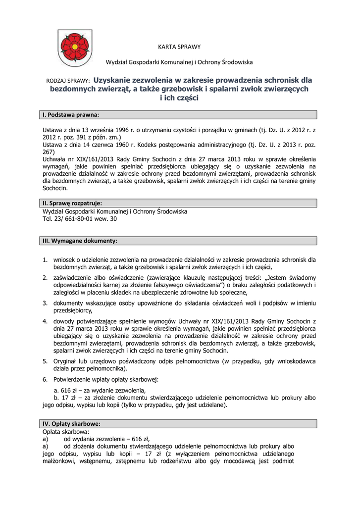 KARTA SPRAWY Wydział Gospodarki Komunalnej i Ochrony Środowiska Uzyskanie zezwolenia w zakresie prowadzenia schronisk dla bezdomnych zwierząt, a także grzebowisk i spalarni zwłok zwierzęcych i ich części RODZAJ SPRAWY: I. Podstawa prawna: Ustawa z dnia 13 września 1996 r. o utrzymaniu czystości i porządku w gminach (tj. Dz. U. z 2012 r. z 2012 r. poz. 391 z późn. zm.) Ustawa z dnia 14 czerwca 1960 r. Kodeks postępowania administracyjnego (tj. Dz. U. z 2013 r. poz. 267) Uchwała nr XIX/161/2013 Rady Gminy Sochocin z dnia 27 marca 2013 roku w sprawie określenia wymagań, jakie powinien spełniać przedsiębiorca ubiegający się o uzyskanie zezwolenia na prowadzenie działalność w zakresie ochrony przed bezdomnymi zwierzętami, prowadzenia schronisk dla bezdomnych zwierząt, a także grzebowisk, spalarni zwłok zwierzęcych i ich części na terenie gminy Sochocin. II. Sprawę rozpatruje: Wydział Gospodarki Komunalnej i Ochrony Środowiska Tel. 23/ 661-80-01 wew. 30 III. Wymagane dokumenty: 1. wniosek o udzielenie zezwolenia na prowadzenie działalności w zakresie prowadzenia schronisk dla bezdomnych zwierząt, a także grzebowisk i spalarni zwłok zwierzęcych i ich części, 2. zaświadczenie albo oświadczenie (zawierające klauzulę następującej treści: „Jestem świadomy odpowiedzialności karnej za złożenie fałszywego oświadczenia”) o braku zaległości podatkowych i zaległości w płaceniu składek na ubezpieczenie zdrowotne lub społeczne, 3. dokumenty wskazujące osoby upoważnione do składania oświadczeń woli i podpisów w imieniu przedsiębiorcy, 4. dowody potwierdzające spełnienie wymogów Uchwały nr XIX/161/2013 Rady Gminy Sochocin z dnia 27 marca 2013 roku w sprawie określenia wymagań, jakie powinien spełniać przedsiębiorca ubiegający się o uzyskanie zezwolenia na prowadzenie działalność w zakresie ochrony przed bezdomnymi zwierzętami, prowadzenia schronisk dla bezdomnych zwierząt, a także grzebowisk, spalarni zwłok zwierzęcych i ich części na terenie gminy Sochocin. 5. Oryginał lub urzędowo poświadczony odpis pełnomocnictwa (w przypadku, gdy wnioskodawca działa przez pełnomocnika). 6. Potwierdzenie wpłaty opłaty skarbowej: a. 616 zł – za wydanie zezwolenia, b. 17 zł – za złożenie dokumentu stwierdzającego udzielenie pełnomocnictwa lub prokury albo jego odpisu, wypisu lub kopii (tylko w przypadku, gdy jest udzielane). IV. Opłaty skarbowe: Opłata skarbowa: a) od wydania zezwolenia – 616 zł, a) od złożenia dokumentu stwierdzającego udzielenie pełnomocnictwa lub prokury albo jego odpisu, wypisu lub kopii – 17 zł (z wyłączeniem pełnomocnictwa udzielanego małżonkowi, wstępnemu, zstępnemu lub rodzeństwu albo gdy mocodawcą jest podmiot zwolniony od opłaty skarbowej). V. Termin załatwienia sprawy: W ciągu miesiąca, a w sprawie szczególnie skomplikowanej w ciągu dwóch miesięcy od dnia złożenia kompletnego wniosku. VI. Forma załatwienia sprawy: Zezwolenie w formie decyzji administracyjnej VII. Miejsce złożenia dokumentów: Osobiste złożenie w Urzędzie Gminy Sochocin, ul. Guzikarzy 9, 09-110 Sochocin Listem na adres Urzędu Gminy Sochocin ul. Guzikarzy 9, 09-110 Sochocin VIII. Informacje: O zezwolenie ubiega się przedsiębiorca, który zamierza prowadzić działalność w zakresie prowadzenia schronisk dla bezdomnych zwierząt, a także grzebowisk i spalarni zwłok zwierzęcych i ich części. Zezwolenie wydaje się na czas oznaczony, nie dłuższy niż 10 lat. Zezwolenie cofa się w przypadku gdy przedsiębiorca, który je uzyskał nie wypełnia określonych w nim warunków (pomimo uprzedniego wezwania).