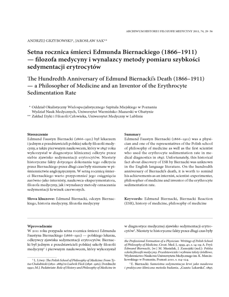 ARCH IW UM HISTORII I FILOZOFII M EDYCYNY 2011, 74, 29-36 A N D R Z E J GRZYBO W SKI*, JARO SŁAW SAK** Setna rocznica śmierci Edmunda Biernackiego (1866-1911) — filozofa medycyny i wynalazcy metody pomiaru szybkości sedymentacji erytrocytów The Hundredth Anniversary o f Edm und Biernacki’s Death (1866-1911) — a Philosopher o f Medicine and an Inventor o f the Erythrocyte Sedimentation Rate * Oddział Okulistyczny Wielospecjalistycznego Szpitala Miejskiego w Poznaniu Wydział Nauk Medycznych, Uniwersytet Warmińsko-Mazurski w Olsztynie ** Zakład Etyki i Filozofii Człowieka, Uniwersytet Medyczny w Lublinie Streszczenie Edmund Faustyn Biernacki (1866-1911) był lekarzem i jednym z przedstawicieli polskiej szkoły filozofii medy cyny, a także pierwszym naukowcem, który w 1897 roku wykorzystał w diagnostyce klinicznej odkryte przez siebie zjawisko sedym entacji erytrocytów. Niestety historyczne fakty dotyczące dokonania tego odkrycia przez Biernackiego przez długi czas były nieznane w pi śmiennictwie anglojęzycznym. W setną rocznicę śmier ci Biernackiego warto przypom nieć jego osiągnięcia zarówno jako internisty, naukowca-eksperymentatora, filozofa medycyny, jak i wynalazcy metody oznaczania sedymentacji krwinek czerwonych. Sum m ary Edmund Faustyn Biernacki (1866-1911) was a physi cian and one of the representatives o f the Polish school o f philosophy of medicine as well as the first scientist who used the erythrocyte sedimentation rate in me dical diagnostics in 1897. Unfortunately, this historical fact about discovery o f ESR by Biernacki was unknown in the English language literature. On the hundredth anniversary of Biernacki’s death, it is worth to remind his achievements as an internist, scientist-experimenter, philosopher o f medicine and inventor of the erythrocyte sedimentation rate. Słowa kluczowe: Edmund Biernacki, odczyn Biernac kiego, historia medycyny, filozofia medycyny K eyw ords: Edm und Biernacki, Biernacki Reaction (ESR), history of medicine, philosophy of medicine Wprowadzenie W 2011 roku przypada setna rocznica śmierci Edmunda Faustyna Biernackiego (1866-1911) — polskiego lekarza, odkrywcy zjawiska sedymentacji erytrocytów. Biernac ki był jednym z przedstawicieli polskiej szkoły filozofii medycyny1 i pierwszym naukowcem, który wykorzystał w diagnostyce medycznej zjawisko sedymentacji erytro cytów2. Niestety te historyczne fakty przez długi czas były 1 L. Lowy: The Polish School o f Philosophy o f Medicine: From Ty tus Chalubinski (1820-1889) to Ludwik Fleck (1896-1961), Dordrecht 1990; M.J. Pedziwiatr: Role o f History and Philosophy o f Medicine in the Professional Formation o f a Physician: Writings o f Polish School o f Philosophy o f Medicine, Croat. Med. J., 1999, 40, s. 14 -19 ; A. Fryś: Edm und Biernacki, [w:] M. Musielak, J. Zam ojski (red.): Polska szkoła filozofii medycyny. Przedstawiciele i wybrane teksty źródłowe, Wydawnictwo Naukowe Uniwersytetu Medycznego im. K. Marcin kowskiego w Poznaniu, Poznań 2010, s. 114 -124 . 2E. Biernacki: Samoistna sedymentacya krwi jako naukowa i praktyczno-kliniczna metoda badania, „Gazeta Lekarska”, 1897, 30 PRACE ORYGINALNE w piśmiennictwie anglojęzycznym niedostatecznie znane. Dopiero w ostatniej dekadzie XX wieku3 oraz w pierwszej dekadzie XXI wieku4 nazwisko Biernackiego pojawia się zarówno przy okazji prezentacji polskiej szkoły filozofii medycyny, jak i omawiania historii odkrycia zjawiska se dymentacji erytrocytów. Wcześniej o uwzględnienie wkła du Biernackiego w to odkrycie sporadycznie apelowali autorzy polscy5. To zapewne przyczyniło się do stopniowej „rehabilitacji” w piśmiennictwie anglojęzycznym wkładu Biernackiego w odkrycie sedymentacji erytrocytów. Nadal jednak, nawet w najnowszych doniesieniach naukowych, pojawiają się niepełne informacje dotyczące historii tego odkrycia zupełnie pomijające dokonania Biernackiego6. Warto zatem w setną rocznicę jego śmierci pokrótce przedstawić drogę życiową i najważniejsze dokonania naukowe Biernackiego, zwłaszcza na tle krótkiej historii odkrycia zjawiska sedymentacji erytrocytów. Życie i działalność naukowo-lekarska Edm unda Biernackiego Życie i działalność zawodowa Edmunda Biernackiego przypadły w okresie zaborów. Urodził się 19 grudnia 17, s. 962-968,996-1004; idem: D ie spontane Blutsedimentirung als eine wissenschaftliche praktisch-klinische untersuchungsmethode, Dtsch. Med. Wschr., 1897, 23, s. 769-772. 3 Y. Tomer, Y. Shoenfeld: The Erythrocyte Sedimentation Rate in M odern Medicine, „Harefuah”, 1991, 120, s. 199-203. 4 M. Zlonis: The M ystique o f the Erythrocyte Sedimentation Rate. A Reappraisal o f One o f the Oldest Laboratory Tests Still in Use, Clin. Lab. Med., 1993, 13, s. 787-800; J. Madrenas, P. Potter, E. Cairns: G iving Credit W here Credit is D ue: John Hunter and the Discovery o f Erythrocyte Sedimentation Rate, „Lancet”, 2005, 366, s. 2140 -2141; J. Kowalczyk: Professor Edm und Biernacki (1866-1911) and the Discovery o f the Erythrocyte Sedimentation Rate, SAM J, 2006, 96, s. 4 0 -4 1; T. Alexy, E. Pais, H.J. M eiselm an: A Rapid M ethod to Estimate Westergren Sedimentation Rates, Rev. Sci. In strum., 2009, 80, 096102. 5 A. Smoluchowski: Edm und Biernacki jako odkrywca metody opadania krwinek czyli tzw. odczynu Biernackiego, Przegl. Lek., 1947 , 3 , s. 656-658, 696-700, 811-815, 852-856; A. Rytel, The Six tieth Anniversary o f the Development o f the Sedimentation Test by Edm und Biernacki, Pol. Med. Hist. and Sci. Bull., 1957, 1, s. 3-7; T. Cienciala: Edm und Biernacki (1866-1911) wybitny patolog i twór ca metody określania szybkości opadania krwinek, Wiad. Lek., 1965, 18, s. 1825-1828; J.W. Guzek: Edm und Biernacki 18 66-1911, Acta Physiol. Pol., 1987, 38, s. 170 -17 6 ; E.J. Kucharz: Edm und Biernacki and the Erythrocyte Sedimentation Rate, „Lancet”, 1987, 329, s. 696; idem: The Forgotten Contribution o f D r Edm und Faustyn Biernacki (186