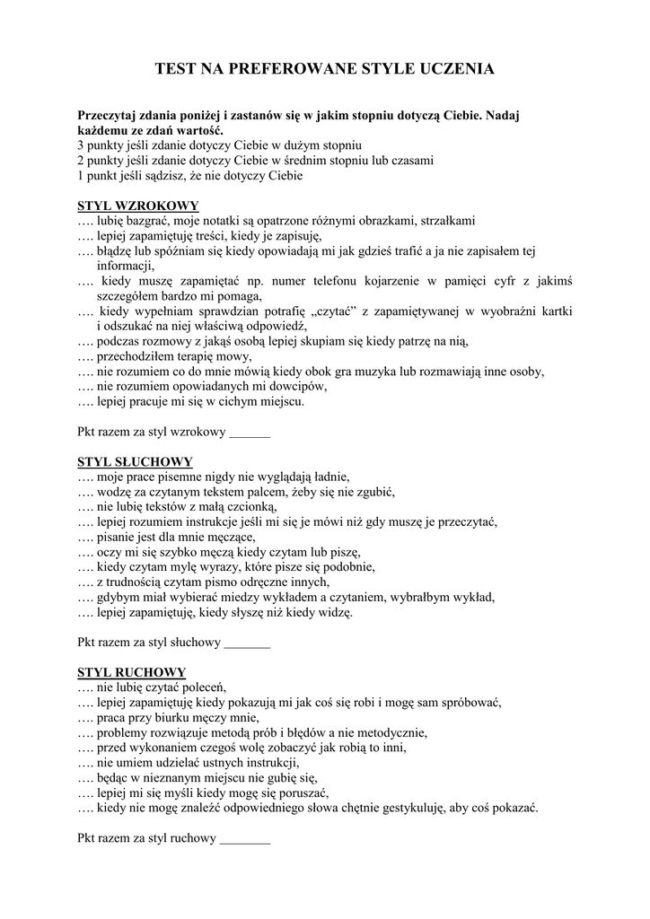 TEST NA PREFEROWANE STYLE UCZENIA Przeczytaj zdania poniŜej i zastanów się w jakim stopniu dotyczą Ciebie. Nadaj kaŜdemu ze zdań wartość. 3 punkty jeśli zdanie dotyczy Ciebie w duŜym stopniu 2 punkty jeśli zdanie dotyczy Ciebie w średnim stopniu lub czasami 1 punkt jeśli sądzisz, Ŝe nie dotyczy Ciebie STYL WZROKOWY …. lubię bazgrać, moje notatki są opatrzone róŜnymi obrazkami, strzałkami …. lepiej zapamiętuję treści, kiedy je zapisuję, …. błądzę lub spóźniam się kiedy opowiadają mi jak gdzieś trafić a ja nie zapisałem tej informacji, …. kiedy muszę zapamiętać np. numer telefonu kojarzenie w pamięci cyfr z jakimś szczegółem bardzo mi pomaga, …. kiedy wypełniam sprawdzian potrafię „czytać” z zapamiętywanej w wyobraźni kartki i odszukać na niej właściwą odpowiedź, …. podczas rozmowy z jakąś osobą lepiej skupiam się kiedy patrzę na nią, …. przechodziłem terapię mowy, …. nie rozumiem co do mnie mówią kiedy obok gra muzyka lub rozmawiają inne osoby, …. nie rozumiem opowiadanych mi dowcipów, …. lepiej pracuje mi się w cichym miejscu. Pkt razem za styl wzrokowy STYL SŁUCHOWY …. moje prace pisemne nigdy nie wyglądają ładnie, …. wodzę za czytanym tekstem palcem, Ŝeby się nie zgubić, …. nie lubię tekstów z małą czcionką, …. lepiej rozumiem instrukcje jeśli mi się je mówi niŜ gdy muszę je przeczytać, …. pisanie jest dla mnie męczące, …. oczy mi się szybko męczą kiedy czytam lub piszę, …. kiedy czytam mylę wyrazy, które pisze się podobnie, …. z trudnością czytam pismo odręczne innych, …. gdybym miał wybierać miedzy wykładem a czytaniem, wybrałbym wykład, …. lepiej zapamiętuję, kiedy słyszę niŜ kiedy widzę. Pkt razem za styl słuchowy STYL RUCHOWY …. nie lubię czytać poleceń, …. lepiej zapamiętuję kiedy pokazują mi jak coś się robi i mogę sam spróbować, …. praca przy biurku męczy mnie, …. problemy rozwiązuje metodą prób i błędów a nie metodycznie, …. przed wykonaniem czegoś wolę zobaczyć jak robią to inni, …. nie umiem udzielać ustnych instrukcji, …. będąc w nieznanym miejscu nie gubię się, …. lepiej mi się myśli kiedy mogę się poruszać, …. kiedy nie mogę znaleźć odpowiedniego słowa chętnie gestykuluję, aby coś pokazać. Pkt razem za styl ruchowy Właściwa strategia – klucz do powodzenia w nauce Dopasuj techniki uczenia do swojego stylu uczenia: WZROKOWCY: UŜywaj kolorowych pisaków, długopisów i kredek; Kluczowe słowa (wzory, daty, idee) zapisuj na niewielkich kartkach, umieszczanych później na wysokości oczu w miejscu, w którym często przebywasz (np. odrabiasz lekcje, studiujesz, itp.). Korzystaj z wielu kolorów; Stosuj wizualne pomoce naukowe – taśmy wideo, foliogramy, slajdy; Samodzielnie twórz tabele, grafiki, schematy, rysunki, itp.; Układaj krzyŜówki z najwaŜniejszy słów do zapamiętania; Jeśli to moŜliwe wybieraj interesująco zaprojektowane, kolorowe ksiąŜki. Wzrokowcy mogą szczególnie duŜo skorzystać z takich nowych technik umysłowych jak np. mapy pamięci oraz obrazowanie informacji do zapamiętania. SŁUCHOWCY: Głośno powtarzaj najwaŜniejsze fakty do zapamiętania; Informacje, które chcesz szybko przyswoić, czytaj z róŜną intonacją – dystyngowanie, wrzaskliwie, teatralnie, wolno, szybko itp.; Jeśli to moŜliwe śpiewaj, rapuj, rymuj i deklamuj (tak przedstawiana wiedza „sama wejdzie ci do głowy”); MoŜesz samodzielnie ułoŜyć prostą piosenkę lub krótki wierszyk złoŜony z najwaŜniejszych słów do zapamiętania; Monolog, dialog, dyskusja w grupie, minidebata – to techniki najbardziej przydatne w twoim przypadku; Korzystaj z kaset magnetofonowych, takŜe w celu nagrywania i późniejszego odsłuchiwania informacji do zapamiętania. Szczególnie słuchowcy skorzystają wiele z takich naturalnych wzmacniaczy pamięci jak rytm i rym. KINESTETYCY: Ucząc się, wykorzystuj dynamikę całego działa – stosowanie mimiki i pantomimy bardzo ci pomoŜe w szybkim przyswajaniu wiedzy; Demonstruj pojęcia za pomocą ruchów i gestów; Odegraj krótką scenkę, skecz związany z zadaną lekcją; Powtarzając lekcje w domu, moŜesz chodzić po pokoju; Jeśli to moŜliwe – konstruuj przestrzenne modele, wykonuj doświadczenia angaŜujące ruchowo (wycinanki i lepienie z plasteliny czy modelowanie wcale nie jest głupim pomysłem w twoim przypadku); Chodź lub skacz po dywanie w taki sposób, aby twoje kroki nakreśliły wyimaginowaną linię wzoru chemicznego, datę słowo do zapamiętania, kształt państwa czy mapę szlaku handlowego, itp. Kinestetycy szczególnie duŜo korzystają z wycieczek (do muzeum, na wystawę, do fabryki czy laboratorium, itd.) oraz innych zajęć przeprowadzonych w terenie (ankiety, wywiady, projekty badawcze, itp.). Wiele innych niestandardowych strategii uczenia moŜna znaleźć w ksiąŜce pt. „Sukces w szkole” – M. Łukasiewicz.