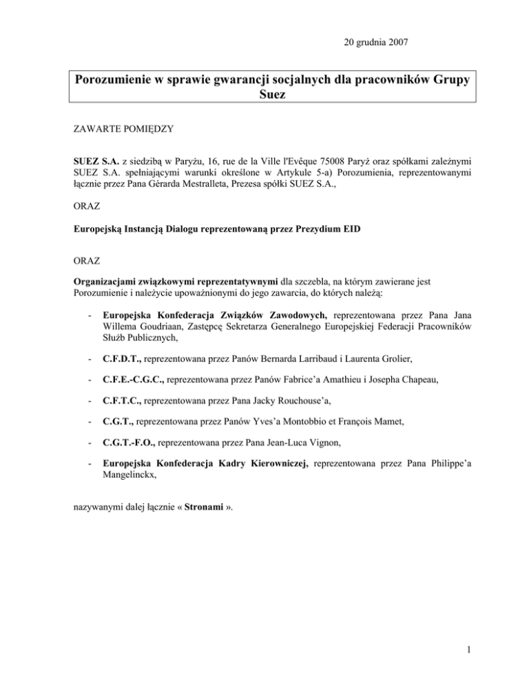 20 grudnia 2007 Porozumienie w sprawie gwarancji socjalnych dla pracowników Grupy Suez ZAWARTE POMIĘDZY SUEZ S.A. z siedzibą w ParyŜu, 16, rue de la Ville l'Evêque 75008 ParyŜ oraz spółkami zaleŜnymi SUEZ S.A. spełniającymi warunki określone w Artykule 5-a) Porozumienia, reprezentowanymi łącznie przez Pana Gérarda Mestralleta, Prezesa spółki SUEZ S.A., ORAZ Europejską Instancją Dialogu reprezentowaną przez Prezydium EID ORAZ Organizacjami związkowymi reprezentatywnymi dla szczebla, na którym zawierane jest Porozumienie i naleŜycie upowaŜnionymi do jego zawarcia, do których naleŜą: - Europejska Konfederacja Związków Zawodowych, reprezentowana przez Pana Jana Willema Goudriaan, Zastępcę Sekretarza Generalnego Europejskiej Federacji Pracowników SłuŜb Publicznych, - C.F.D.T., reprezentowana przez Panów Bernarda Larribaud i Laurenta Grolier, - C.F.E.-C.G.C., reprezentowana przez Panów Fabrice’a Amathieu i Josepha Chapeau, - C.F.T.C., reprezentowana przez Pana Jacky Rouchouse’a, - C.G.T., reprezentowana przez Panów Yves’a Montobbio et François Mamet, - C.G.T.-F.O., reprezentowana przez Pana Jean-Luca Vignon, - Europejska Konfederacja Kadry Kierowniczej, reprezentowana przez Pana Philippe’a Mangelinckx, nazywanymi dalej łącznie « Stronami ». 1 Wstęp: We wrześniu 2007 r. SUEZ i GDF podjęły na nowo dyskusje - rozpoczęte w lutym 2006 - nad projektem połączenia (fuzją). Jedyna zmiana w tym projekcie dotyczy wprowadzenia spółki SUEZ Environnement na giełdę papierów wartościowych. GDF SUEZ będzie posiadał udziały wysokości 35 % kapitału SE, natomiast reszta zostanie rozprowadzona wśród aktualnych akcjonariuszy SUEZU. Wielcy akcjonariusze Suezu zobowiązali się poprzez pakt akcjonariuszy z GDF SUEZ przejąć 47% kapitału SUEZ Environnement przyznając jednocześnie GDF SUEZ kontrolę nad SUEZ Environnement. Zdaniem Prezydium Europejskiej Instancji Dialogu: pakt ten powinien zawierać klauzule uniemoŜliwiające wycofanie się członków z paktu; udział stałego akcjonariatu SUEZ Environnement powinnien być wzmocniony; o poprzez udział w jej kapitale GDF SUEZ powyŜej 50% ; o poprzez poszukiwanie dodatkowych i zarazem stabilnych akcjonariuszy; o poprzez zwiększenie wagi akcjonariatu pracowniczego. Podpisując niniejsze porozumienie, strony pragną nadać charakter oficjalny dodatkowym gwarancjom socjalnym i tym samym odpowiedzieć na niepokój wyraŜony przez członków Europejskiej Instancji Dialogu, jak równieŜ dać wyraz interesom pracowników zatrudnionych w grupie. Za pomocą niniejszego porozumienia, SUEZ potwierdza swoje zaangaŜowanie prowadzenia polityki « odpowiedzialnej społecznie » na rzecz swoich pracowników. W celu zagwarantowania maksymalnej ochrony pracowników, porozumienie dotyczy następujących zagadnień : Środki i działania związane z fuzją Stałe środki i działania ramowe w zakresie socjalnym przy zbywaniu danego przedsiębiorstwa Klauzule w umowach dotyczące spraw socjalnych Postanowienia róŜne 2 Artykuł 1 – Środki i działania związane z fuzją SUEZ gwarantuje, Ŝe nie będzie zwolnień z przyczyn ekonomicznych, będących konsekwencją aktualnego projektu fuzji i planowanych synergii, przez okres 18 miesięcy licząc od rzeczywistej daty fuzji. W przypadku ewentualnej restrukturyzacji, pracownikom zapewnia się przekwalifikowanie na równowaŜne stanowiska pracy przy jednoczesnym zapewnieniu odpowiednich warunków geograficznych co do miejsca zatrudnienia jak i we właściwej branŜy. PowyŜsze zobowiązanie dotyczy między innymi skutków połączenia SES i COFATECH jak równieŜ ich siedzib. Europejska Instancja Dialogu grupy SUEZ, organizacje związkowe, Krajowa Rada Zakładowa Grupy jak i rada zakładowe danego przedsiębiorstwa będą sprawowały nadzór nad przestrzeganiem w/w zobowiązań. Zobowiązania w stosunku do personelu DISTRIGAZ zostały potwierdzone. Europejska Instancja Dialogu grupy SUEZ zostanie, między innymi, poinformowana na temat ewentualnych kandydatów na przejęcie tej spółki. Projekt fuzji GDF SUEZ, który uwzględnia równieŜ wprowadzenie na giełdę spółki SUEZ Environnement nie będzie miał konsekwencji przy zbywaniu spółek zaleŜnych SUEZU przez okres 18 miesięcy licząc od daty fuzji, niezaleŜnie od zobowiazań wynikających z wymogów narzuconych przez Komisję Europejską. Artykuł 2 – Stałe środki i działania ramowe w zakresie socjalnym przy zbywaniu danego przedsiębiorstwa Plany inwestycyjne długoterminowe będą przedstawiane corocznie w ramach informowania na temat strategii zgodnie z artykułem 1.3 umowy o PZZK podpisanej w dniu 3 lipca 2007 r. Zgodnie z tym samym porozumieniem, wprowadzony zostanie plan, którego celem jej zmniejszanie zagroŜenia niepewnego zatrudnienia: zmniejszenie ilości umów o pracę na czas określony jak i zatrudniania pracowników tymczasowych przez agencję pośrednictwa pracy na korzyść umów na czas nieokreślony. W przypadku planowanego zbycia przez SUEZ SA przedsiębiorstwa nienaleŜącego do zakresu działalności Grupy SUEZ, zarząd Grupy i/lub jednostki przejmujacej jak i przedsiębiorstwa, które ma być sprzedane zwołują zebranie kompetentych instancji przedstawicielskich w celu: o poinformowania ich na temat danego projektu, o w celu przedstawienia kandydata na przejęcie danej działalności, jego planów i ewentualnych konsekwencji socjalnych. Przedstawienie kandydata odbywa się zgodnie z obowiązującymi normami prawnymi przy jednoczesnym zachowaniu odpowiednich zasad poufności. Instancje przedstwicielskie dysponują odpowiednim czasem - w zaleŜności od okoliczności - oraz wystarczającymi środkami na przeprowadzenie ekspertyzy (na poziomie jednostki sprzedającej firmę) zanim wydadzą ostateczną opinię lub zajmą określone stanowisko: o w celu przeanalizowania projektu, jego efektywności ekonomicznej, jak i konsekwencji społecznych; o w celu zaproponowania i przedysku