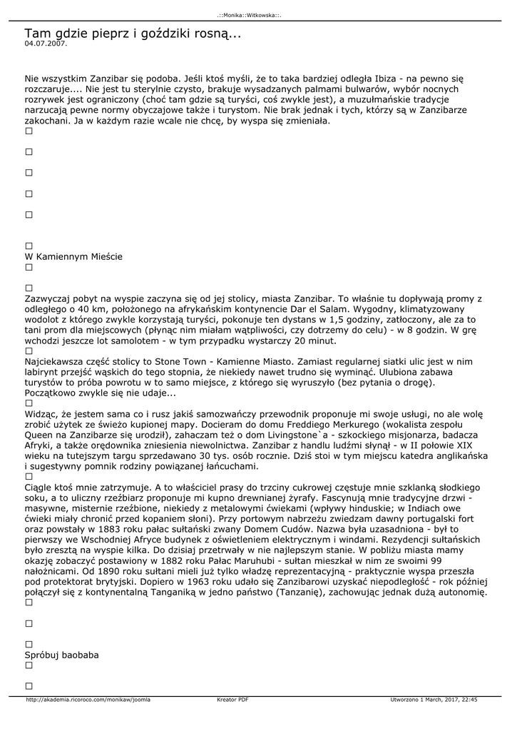 .::Monika::Witkowska::. Tam gdzie pieprz i goździki rosną... 04.07.2007. Nie wszystkim Zanzibar się podoba. Jeśli ktoś myśli, że to taka bardziej odległa Ibiza - na pewno się rozczaruje.... Nie jest tu sterylnie czysto, brakuje wysadzanych palmami bulwarów, wybór nocnych rozrywek jest ograniczony (choć tam gdzie są turyści, coś zwykle jest), a muzułmańskie tradycje narzucają pewne normy obyczajowe także i turystom. Nie brak jednak i tych, którzy są w Zanzibarze zakochani. Ja w każdym razie wcale nie chcę, by wyspa się zmieniała. W Kamiennym Mieście Zazwyczaj pobyt na wyspie zaczyna się od jej stolicy, miasta Zanzibar. To właśnie tu dopływają promy z odległego o 40 km, położonego na afrykańskim kontynencie Dar el Salam. Wygodny, klimatyzowany wodolot z którego zwykle korzystają turyści, pokonuje ten dystans w 1,5 godziny, zatłoczony, ale za to tani prom dla miejscowych (płynąc nim miałam wątpliwości, czy dotrzemy do celu) - w 8 godzin. W grę wchodzi jeszcze lot samolotem - w tym przypadku wystarczy 20 minut. Najciekawsza część stolicy to Stone Town - Kamienne Miasto. Zamiast regularnej siatki ulic jest w nim labirynt przejść wąskich do tego stopnia, że niekiedy nawet trudno się wyminąć. Ulubiona zabawa turystów to próba powrotu w to samo miejsce, z którego się wyruszyło (bez pytania o drogę). Początkowo zwykle się nie udaje... Widząc, że jestem sama co i rusz jakiś samozwańczy przewodnik proponuje mi swoje usługi, no ale wolę zrobić użytek ze świeżo kupionej mapy. Docieram do domu Freddiego Merkurego (wokalista zespołu Queen na Zanzibarze się urodził), zahaczam też o dom Livingstone`a - szkockiego misjonarza, badacza Afryki, a także orędownika zniesienia niewolnictwa. Zanzibar z handlu ludźmi słynął - w II połowie XIX wieku na tutejszym targu sprzedawano 30 tys. osób rocznie. Dziś stoi w tym miejscu katedra anglikańska i sugestywny pomnik rodziny powiązanej łańcuchami. Ciągle ktoś mnie zatrzymuje. A to właściciel prasy do trzciny cukrowej częstuje mnie szklanką słodkiego soku, a to uliczny rzeźbiarz proponuje mi kupno drewnianej żyrafy. Fascynują mnie tradycyjne drzwi masywne, misternie rzeźbione, niekiedy z metalowymi ćwiekami (wpływy hinduskie; w Indiach owe ćwieki miały chronić przed kopaniem słoni). Przy portowym nabrzeżu zwiedzam dawny portugalski fort oraz powstały w 1883 roku pałac sułtański zwany Domem Cudów. Nazwa była uzasadniona - był to pierwszy we Wschodniej Afryce budynek z oświetleniem elektrycznym i windami. Rezydencji sułtańskich było zresztą na wyspie kilka. Do dzisiaj przetrwały w nie najlepszym stanie. W pobliżu miasta mamy okazję zobaczyć postawiony w 1882 roku Pałac Maruhubi - sułtan mieszkał w nim ze swoimi 99 nałożnicami. Od 1890 roku sułtani mieli już tylko władzę reprezentacyjną - praktycznie wyspa przeszła pod protektorat brytyjski. Dopiero w 1963 roku udało się Zanzibarowi uzyskać niepodległość - rok później połączył się z kontynentalną Tanganiką w jedno państwo (Tanzanię), zachowując jednak dużą autonomię. Spróbuj baobaba http://akademia.ricoroco.com/monikaw/joomla Kreator PDF Utworzono 1 March, 2017, 22:45 .::Monika::Witkowska::. Dumą Zanizbaru są przyprawy. Nic dziwnego, że wycieczką numer jeden zaliczaną niemal przez wszystkich cudzoziemców jest tzw. Spice Tour. Jej główną atrakcją jest... chodzenie po polach. Ale ile przy tym wrażeń - wzrokowych, zapachowych i smakowych! W sumie to doskonała okazja, aby zobaczyć jak w naturze rośnie to co używamy w kuchni - imbir, cynamon, wanilia, kardamon, kakao etc., a przede wszystkim goździki. Właśnie z goździków Zanzibar słynie, pokrywając 80 proc. światowego zapotrzebowania. Większość turystów jest wyraźnie zdziwiona kiedy staje pod wielkim, ponad 10 metrowym drzewem, dowiadując się że goździki to nic innego jak pochodzące z niego nierozwinięte pączki kwiatowe, ręcznie zbierane, a potem suszone. Podobne zaskoczenia są również na widok wielu owoców. Palma kokosowa nikogo nie zaskoczy, ale durian, rambutany, guawy czy owoce baobaba owszem. Przy okazji przyprawowej edukacji mamy też szansę zdobyć najwyższą "górę" wyspy. Ma ona raptem 117 m n.p.m. W jej pobliżu znajdują się odnowiony ostatnio kompleks perskich łaźni - postawił je jeden z sułtanów dla swojej pochodzącej z Persji żony. W berka z delfinem Większość turystów przyjeżdża na Zanzibar oczywiście głównie dla plaż. Ostatnio wyspa jest modna przede wszystkim wśród Włochów. Do najpopularniejszych plaż w pobliżu stolicy należy Bububu - nazwa nawiązuje do odgłosu wydawanego przez jeżdżącą tam niegdyś ciuchcię. Najładniejsze plaże są jednak dalej. Niektóre z nich prezentują się iście pocztówkowo - z palmami, białym paskiem i turkusową wodą. Z oceanem trzeba jednak uważać. W czasie odpływu do głębokiej wody często trzeba dość daleko iść, natomiast kiedy jest przypływ, lepiej pilnować, aby fala nie zabrała nam zostawionych na plaży rzeczy. Ze względu na pobliskie rafy, warto skorzystać z okazji i ponurkować. Koło północnego przylądka Nungwi jest nawet centrum nurkowe w którym instruktorami są Polacy (East Africa Diving Centre). Organizuje ono wyprawy m.in. w okolice wyspy Mnemba, gdzie nurkowie mają okazję zobaczyć wyjątkowo łagodnego w usposobieniu rekina wielorybiego. Z kolei powodem by pojechać na południe Zanzibaru są głównie delfiny, przy czym w tym wypadku nie trzeba już nurkować z butlą - wystarczy zwykły snorkling z masą i fajką. W okolicach wioski Kizimkazi delfiny pojawiają się praktycznie w niemal każde przedpołudnie. Dawniej miejscowi rybacy polowali na te sympatyczne zwierzęta, jako że ich mięso było wykorzystywane jako przynęta na rekiny. Na szczęście czasy się zmieniły - teraz przyjeżdżający turyści stanowią lepszy biznes. Chętni wypływają w morze na 