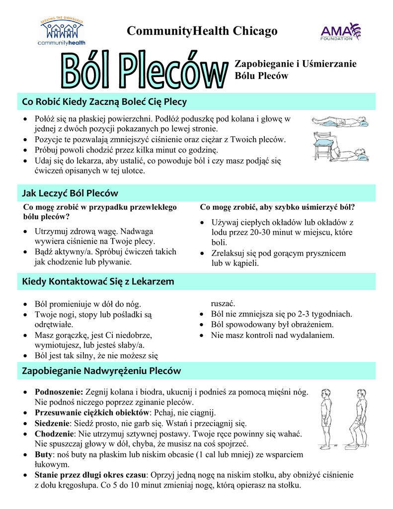 CommunityHealth Chicago Zapobieganie i Uśmierzanie Bólu Pleców Co Robić Kiedy Zaczną Boleć Cię Plecy Połóż się na płaskiej powierzchni. Podłóż poduszkę pod kolana i głowę w jednej z dwóch pozycji pokazanych po lewej stronie. Pozycje te pozwalają zmniejszyć ciśnienie oraz ciężar z Twoich pleców. Próbuj powoli chodzić przez kilka minut co godzinę. Udaj się do lekarza, aby ustalić, co powoduje ból i czy masz podjąć się ćwiczeń opisanych w tej ulotce. Jak Leczyć Ból Pleców Co mogę zrobić w przypadku przewlekłego bólu pleców? Utrzymuj zdrową wagę. Nadwaga wywiera ciśnienie na Twoje plecy. Bądź aktywny/a. Spróbuj ćwiczeń takich jak chodzenie lub pływanie. Co mogę zrobić, aby szybko uśmierzyć ból? Używaj ciepłych okładów lub okładów z lodu przez 20-30 minut w miejscu, które boli. Zrelaksuj się pod gorącym prysznicem lub w kąpieli. Kiedy Kontaktować Się z Lekarzem Ból promieniuje w dół do nóg. Twoje nogi, stopy lub pośladki są odrętwiałe. Masz gorączkę, jest Ci niedobrze, wymiotujesz, lub jesteś słaby/a. Ból jest tak silny, że nie możesz się ruszać. Ból nie zmniejsza się po 2-3 tygodniach. Ból spowodowany był obrażeniem. Nie masz kontroli nad wydalaniem. Zapobieganie Nadwyrężeniu Pleców Podnoszenie: Zegnij kolana i biodra, ukucnij i podnieś za pomocą mięśni nóg. Nie podnoś niczego poprzez zginanie pleców. Przesuwanie ciężkich obiektów: Pchaj, nie ciągnij. Siedzenie: Siedź prosto, nie garb się. Wstań i przeciągnij się. Chodzenie: Nie utrzymuj sztywnej postawy. Twoje ręce powinny się wahać. Nie spuszczaj głowy w dół, chyba, że musisz na coś spojrzeć. Buty: noś buty na płaskim lub niskim obcasie (1 cal lub mniej) ze wsparciem łukowym. Stanie przez długi okres czasu: Oprzyj jedną nogę na niskim stołku, aby obniżyć ciśnienie z dołu kręgosłupa. Co 5 do 10 minut zmieniaj nogę, którą opierasz na stołku. Ważne jest, aby utrzymywać elastyczność mięśni pleców. Twoje mięśnie pleców mogą pomóc Ci w utrzymywaniu dobrej postawy. Nie wykonuj żadnych ćwiczeń, które sprawiają Ci ból. Delikatnie Rozciągnij Mięśnie Pleców: 1) Połóż się na plecach ze zgiętymi kolanami i powoli przyciągnij lewe kolano do piersi tak, by poczuć delikatne napięcie. 2) Bardzo delikatnie dociśnij kręgosłup to podłogi. 3) Utrzymaj tę pozycję przez 3-5 sekund. 4) Rozluźnij się i powtórz ćwiczenie z prawym kolanem. 5) Powtórz ćwiczenie 10 razy z każdą nogą. Rozluźnienie Dolnej Części Kręgosłupa: 1) Usiądź na krześle ze stopami rozstawionymi na podłodze na odległość bioder. 2) Połóż ręce na nogach, przechylając się do przodu, aż Twój brzuch nie spocznie na Twoich udach. Zwieś głowę i ramiona luźno. 3) Jeżeli Twój brzuch nie dotyka ud, oprzyj ręce i łokcie na nogach. Przechylenie Miednicy Wspomaga Elastyczność Dolnej Części Kręgosłupa: 1) Połóż się na plecach ze zgiętymi kolanami; Twoje stopy powinny płasko spoczywać na podłodze na szerokość bioder. 2) Delikatnie dociśnij plecy do podłogi poprzez zrelaksowanie brzucha i żeber, trochę przechylając miednicę tak, aby Twoja kość ogonowa trochę oderwała się od podłogi. 3) Trzymaj tę pozycję przez 3-5 sekund i rozluźnij się. Powtórz ćwiczenie parę razy. Ćwiczenie Na Wzmocnienie Pleców: 1) Połóż się brzuchem na podłodze, z rękami wzdłuż ciała. 2) Powoli podnieś głowę i pozwól, aby górna część tułowia nie dotykała podłogi. Wykonuj to ćwiczenie tylko do takiego stopnia, do którego jest Ci wygodnie. 3) Trzymaj tę pozycję przez 3-5 sekund i rozluźnij się. Powtórz ćwiczenie parę razy. Rozciągnięcie Zginacza Stawu Biodrowego 1) Pochyl się tak, jak na obrazku, zegnij nogę i upewnij się, że kolano zgiętej nogi jest bezpośrednio nad kostką. 2) Połóż ręce na podłodze po obu stronach zgiętej nogi. Zegnij również drugą nogę tak, aby jej kolano spoczywało na podłodze. 3) Poczujesz ciągnięcie, kiedy pochylisz się do przodu. 4) Trzymaj tę pozycję przez 3-5 sekund. Powtórz ćwiczenie parę razy zmieniając nogi.