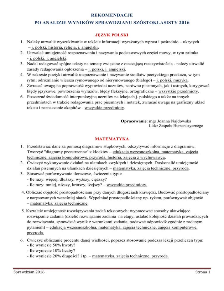 REKOMENDACJE PO ANALIZIE WYNIKÓW SPRAWDZIANU SZÓSTOKLASISTY 2016 JĘZYK POLSKI 1. Należy utrwalić wyszukiwanie w tekście informacji wyrażonych wprost i pośrednio – ukrytych – j. polski, historia, religia, j. angielski. 2. Utrwalać umiejętność rozpoznawania i nazywania podstawowych części mowy, w tym zaimka - j. polski, j. angielski. 3. Nadal redagować spójne teksty na tematy związane z otaczającą rzeczywistością - należy utrwalić zasady redagowania ogłoszenia – j. polski, j. angielski. 4. W zakresie poetyki utrwalić rozpoznawanie i nazywanie środków poetyckiego przekazu, w tym rytm; odróżnianie wiersza rymowanego od nierymowanego (białego) – j. polski, muzyka. 5. Zwracać uwagę na poprawność wypowiedzi uczniów, zarówno pisemnych, jak i ustnych, korygować błędy językowe, powtórzenia wyrazów, błędy fleksyjne, ortograficzne – wszystkie przedmioty. 6. Poszerzać świadomość interpunkcyjną uczniów na lekcjach j. polskiego a także na innych przedmiotach w trakcie redagowania prac pisemnych i notatek, zwracać uwagę na graficzny układ tekstu i zaznaczanie akapitów - wszystkie przedmioty. Opracowanie: mgr Joanna Najdowska Lider Zespołu Humanistycznego MATEMATYKA 1. Przedstawiać dane za pomocą diagramów słupkowych, odczytywać informacje z diagramów. Tworzyć ''diagramy przestrzenne'' z klocków – edukacja wczesnoszkolna, matematyka, zajęcia techniczne, zajęcia komputerowe, przyroda, historia, zajęcia z wychowawcą. 2. Ćwiczyć wykonywanie działań na ułamkach zwykłych i dziesiętnych. Doskonalić umiejętność działań pisemnych na ułamkach dziesiętnych – matematyka, zajęcia techniczne, przyroda. 3. Stosować porównywanie ilorazowe, ćwiczenia typu: - Ile razy: więcej, dłuższy, wyższy, cięższy? - Ile razy: mniej, niższy, krótszy, lżejszy? – wszystkie przedmioty. 4. Obliczać objętość prostopadłościanu przy danych długościach krawędzi. Budować prostopadłościany z narysowanych wcześniej siatek. Wypełniać prostopadłościany np. ryżem, porównywać objętość – matematyka, zajęcia techniczne. 5. Kształcić umiejętność rozwiązywania zadań tekstowych: wypracować sposoby ułatwiające rozwiązanie zadania (dzielić rozwiązanie zadania na etapy, ustalać kolejność działań prowadzących do rozwiązania, sprawdzać wynik z warunkami zadania, podawać odpowiedź zgodnie z zadanym pytaniem) – edukacja wczesnoszkolna, matematyka, zajęcia techniczne, zajęcia komputerowe, przyroda. 6. Ćwiczyć obliczanie procentu danej wielkości, poprzez stosowanie podczas lekcji przeliczeń typu: - Ile wyniesie 50% kwoty? - Ile wyniesie 10% liczby? - Ile wyniesie 20% długości? i tp. – matematyka, zajęcia techniczne, przyroda. Sprawdzian 2016 Strona 1 7. Ćwiczyć czytanie ze zrozumieniem tekstu zawierającego informacje liczbowe (głośne czytanie tekstów zawierających liczby zapisane słowami, zapisywanie przez uczniów liczb słowami ) oraz analizować treści matematyczne – wszystkie przedmioty. Opracowanie: mgr Elżbieta Felczak JĘZYK ANGIELSKI 1. Należy utrwalić wyszukiwanie w tekście informacji szczegółowych. 2. Należy ćwiczyć głośne czytanie i rozwijać umiejętność opowiadania o przeczytanym tekście. 3. Należy utrwalać umiejętność wyszukiwania prostych informacji szczegółowych w tekście pisanym, jak i słuchanym. 4. Kontynuować ćwiczenia znajomości środków językowych. 5. Należy ćwiczyć słuchanie w celu rozumienia ogólnego sensu przekazanej informacji. Opracowanie: mgr Kamila Szczukowska Sprawdzian 2016 Strona 2