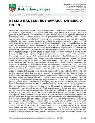 Urząd Gminy Radziechowy-Wieprz 34-381 Radziechowy, Wieprz 700 tel. 33 867 66 10, fax. 33 867 66 13 e-mail: [email protected] www.radziechowy-wieprz.pl Aktualności › BESKID SĄDECKI ULTRAMARATON BIEG 7 DOLIN ! BESKID SĄDECKI ULTRAMARATON BIEG 7 DOLIN ! Deszcz jaki towarzyszył biegaczom odstraszył, kilku śmiałków tej niesamowitej przygody sportowej. Ze zgłoszonych 100 zawodników do tego biegu na starcie w strugach deszczu o godzinie 3 pojawiło się 64 zawodników w tym 9 kobiet. Po sygnale sędziego głównego z Krynickiego Deptaka w towarzystwie kładu z goprowcem i fotoreporterem ulicami Krynicy ruszyła zwarta grupa „ Szaleńców” w ciemną noc wrześniową, już pierwsza górka zrobiła wrażenia i ze zwartej grupy porobiły się kilkunasto osobowe zespoły w zależności od umiejętności i wytrenowania zawodników. Migające punkciki co jakiś czas pojawiały się na otwartych polanach, jednak gdy zawodnicy weszli w las każdy musiał radzić sobie tak by nie potknąć się o zwalone drzewo, korzeń czy nie wpaść w błotnistą bryje czy dużą kałuże wody. Od początku tępo biegu było szalone jak na taką trasę i panujące warunki atmosferyczne , na czele biegu znajdował się Jarek Janicki znany w całym świecie ultramaratończyk, 5 krotny Mistrz Europy, na 100 km, zwycięzca wielu prestiżowych biegów na świecie, Adam Długosz znany biegacz górski pochodzący z Rytra znający bardzo dobrze tereny Beskidu Sądeckiego, oraz 3 mniej znanych ultramaratończyków. Do pierwszej góry Jaworzyna Krynicka 1114 m trasa biegła drogą utwardzoną 10 km tej trasy nie sprawiało trudności zawodnikom w oznakowaniu. Na Jaworzynie kilku zawodników miało problemy ze znalezieniem trasy, padający ciągle deszcz i ciemności uniemożliwiały odnalezienie znaków wytyczających szlak biegowy. Już na szczycie okazało się , że moja czołówka zaczyna coraz słabiej świecić, załapałem się do 3 osobowej grupy, która miała sprawne oświetlenie i w ich towarzystwie próbowałem pokonać ciemności wszak do poranka było jeszcze sporo czasu, na podbiegach nie było to trudne gorzej było biec wąskim wąwozem gdzie środkiem płynął strumyk, a brzegi błotniste były bardzo śliskie. Po jakimś czasie towarzysze mojej niedoli poszli do przodu i zostałem w szczerym lesie zupełnie sam. Moja latarka tak świeciła, że znak na drzewie mogłem odczytać tylko z odległości 1,5 m, na dodatek w tym rejonie była znaczna część bagien i zwalonych drzew, co jakiś czas wpadałem do połowy łydki do błota, albo leżałem w mazi potykając się o zwalone drzewo, lub wystający korzeń. Pierwszy bufet mam na 22 km na Łabowskiej Hali. Dochodzę do punktu piję izotonik biorę pół banana, dowiaduję się że jestem na 20 pozycji nie pozostało nic innego jak maszerować do momentu jak się rozjaśni. Po pół godzinie zaczyna świtać więc jestem uratowany zaczynam nadrabiać stracony czas w ciemnościach i to jest mój błąd, to co się straciło nie da się w jednej chwili nadrobić. Dobiegam do Rytra pierwsza dolina i przeprawa przez Poprad dobiegam do hotelu Perła Południa po drodze wyprzedzam dwóch zawodników. Na punkcie przepakowym miłe przyjęcie przez obsługę jest Krysia Łękawska ( była reprezentantka polski w biegach narciarskich). Jest 33 kilometr 1/3 trasy pokonana, 2 km drogi asfaltowej i zaczyna się stroma ściana na Hale Prehyba , na odcinku 8 km trzeba pokonać prawie 900 m wzniesienia. W połowie góry płace „frycowe” (stary wyjadacz biegów ultra wszak 46 lat biegam) to szarpnięcie o świcie teraz daje się we znaki, jestem coraz słabszy fizycznie, a również i psychicznie . Mijają mnie kolejni zawodnicy których już dawno zgubiłem na trasie, jednak się nie poddaje mam nadzieje że dotrę do schroniska tam coś zjem i pobiegnę dalej. W oddali widzę karetkę jest schronisko, miłe przyjęcie jest kolejny narciarz na punkcie siadam jem drożdżówkę z serem, pije http://www.radziechowy-wieprz.pl/aktualnosci/beskid-sadecki-ultramaraton-bieg-7-dolin-,136 Strona 1 Urząd Gminy Radziechowy-Wieprz 34-381 Radziechowy, Wieprz 700 tel. 33 867 66 10, fax. 33 867 66 13 e-mail: [email protected] www.radziechowy-wieprz.pl Aktualności › BESKID SĄDECKI ULTRAMARATON BIEG 7 DOLIN ! gorącą herbatkę zabieram herbatniki i w trasę. Na odchodnym słyszę Edek dasz radę - to kolejny narciarz z Beskidu Sądeckiego. Do schroniska tras wiedzie wahadłowo spotykam kolejnych zawodników mijamy się i pozdrawiamy. Z Prehyby przez Radziejową i Eliaszówkę to znana trasa do Piwnicznej Zdroju, którą niespełna miesiąc wcześniej pokonywałem w Mountain Marathon w dobrym stylu. Piwniczna Zdrój 65 kilometr biegu, kolejna dolina i bufet z przepakiem. Przed wejściem wita mnie serdecznie stary przyjaciel z Wałbrzycha Wiesiek Zieliński, który obsługuje foto-cele. Na punkcie dochodzę kolejnych zawodników, jest Tadek Ruta z Łodzi, z którym nie raz rywalizowaliśmy na trasach. Biorę kanapkę z szynką i herbatę ( później okazało się, że trzeba było zjeść dwie bułki), odżywki z przepaku zostawiam zużytą latarkę. Siedząc rozmyślam czy jest sens biec dalej, do punktu docierają kolejni zawodnicy. Wiesiek robi pamiątkowe zdjęcie, w worku mam czyste rzeczy do przebrania, leje jak z cebra jestem cały w błocie więc decyzja nie ma sensu się przebierać. Do mety bardzo daleko Wiesiek pociesza mnie i dodaje otuchy Edek „ przecież ty nigdy się nie poddajesz” ( przed laty byłem reprezentantem Polski i Górnika Wałbrzych w biegach narciarskich). Po chwili ruszam, jeszcze jedna fotka na drogę i po raz drugi mostem przeprawiam się przez Poprad. Po drodze spotykam sympatyczną wolontariuszkę i mieszkańców, którzy mnie dopingują i pocieszają. Po zdobyciu kolejnego wzgórza, zaczął się horror, błotnista droga jak maź, buty tracą przyczepność jeździ się jak na łyżwach, co pewien czas lądując w lepiącej mazi
