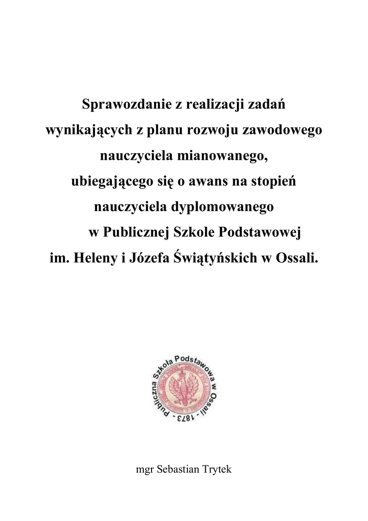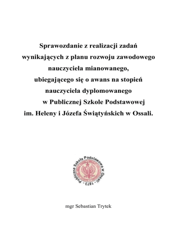 Sprawozdanie z realizacji zadań wynikających z planu rozwoju zawodowego nauczyciela mianowanego, ubiegającego się o awans na stopień nauczyciela dyplomowanego w Publicznej Szkole Podstawowej im. Heleny i Józefa Świątyńskich w Ossali. mgr Sebastian Trytek Jestem nauczycielem mianowanym wychowania fizycznego z 10-letnim staŜem pracy. zatrudnionym na podstawie umowy o pracę na czas nieokreślony. Odbywam staŜ na nauczyciela dyplomowanego długości 2 lata i 9 miesięcy. W dniu 03 sierpnia 2000r. ukazało się rozporządzenie MEN w sprawie uzyskania stopni awansu zawodowego przez nauczycieli, dlatego postanowiłem podnieść jakość pracy własnej i pracy szkoły. W dniu 31.08.2003r. złoŜyłem wniosek o rozpoczęcie staŜu na stopień nauczyciela dyplomowanego. Opracowałem plan rozwoju zawodowego, który został zatwierdzony do realizacji przez Dyrektora Szkoły Podstawowej w Ossali. Plan rozwoju miał w swym załoŜeniu stanowić kontynuację realizowanych wcześniej zadań dydaktyczno – wychowawczych, a zarazem być podstawą do podejmowania nowych działań w ramach pełnionych obowiązków słuŜbowych. Przez cały okres staŜu starałem się, aby realizacja mojego planu przebiegała zgodnie z załoŜonymi wcześniej terminami. Działania szkoły w której pracuję koncentrują się na wprowadzaniu zmian związanych z reformą systemu edukacji, na pracy wychowawczej, współpracy z rodzicami, nauczaniu aktywnym. WaŜnym elementem programu wychowawczego szkoły jest działalność pozalekcyjna, rozwijanie indywidualnych zainteresowań dzieci. W związku z powyŜszym zadania w moim planie rozwoju zawodowego są ściśle powiązane z programem pracy szkoły. Plan mojego rozwoju opierał się na: Planie Rozwoju Szkoły, Statucie, Programie Wychowawczym oraz potrzebach i oczekiwaniach uczniów, rodziców i grona pedagogicznego. W swoim sprawozdaniu skupiłem się na sprawach, moim zdaniem, najwaŜniejszych. W ramach realizacji załoŜeń punktu II ( czynności organizacyjne) planu rozwoju zawodowego zrealizowałem następujące zadania: 2 Poznanie procedury awansu zawodowego • Zapoznałem się z podstawowymi dokumentami prawa oświatowego, a przede wszystkim z ustawami dotyczącymi rozwoju zawodowego nauczyciela, obserwuję istotne zmiany zachodzące na tym polu. • Korzystałem z informacji zamieszczonych na strona internetowych (www.men.waw.pl, www.womkat.edu.pl , www.literk.pl ). • Napisałem plan rozwoju zawodowego nauczyciela, który został przyjęty do realizacji przez dyrektora szkoły, następnie realizowałem na bieŜąco i zgodnie z planem jego załoŜenia. • Na bieŜąco brałem udział w szkoleniach i spotkaniach dotyczących awansu zawodowego nauczycieli przeprowadzanych na terenie Szkoły Podstawowej w Ossali. Poznanie zasad funkcjonowania i organizacji zadań szkoły • Przeanalizowałem zapisy w Statucie szkoły ze szczególnym uwzględnieniem WSO , programu wychowawczego szkoły oraz przeanalizowałem regulaminy obowiązujące w szkole. • Brałem udział w pracach nad powstawaniem , lub wprowadzaniem zmian do podstawowych programów, regulaminów, harmonogramów a takŜe innych dokumentów szkolnych, m.in.: programu profilaktyki, wewnętrzny system oceniania, kryteria oceniania zachowania, regulamin prowadzenia wycieczek szkolnych, itd. • Z początkiem roku szkolnego opracowuję, ewentualnie koryguję kryteria i sposoby oceniania na poszczególne oceny z przedmiotu w klasach IV-VI. Następnie rodzice, uczniowie oraz wychowawcy zapoznają się z tymi kryteriami. Kryteria oceniania, a takŜe regulamin sali gimnastycznej i pracowni komputerowej zawsze na początku roku szkolnego uczniowie przepisują do swoich zeszytów, a rodzice swoim podpisem oznajmiają, Ŝe zapoznali się z ich treścią. 3 Wstępna ocena własnych umiejętności • Po zakupieniu komputera oraz podłączeniu stałego łącza internetowego wykorzystuję moŜliwości z niego płynące - opracowuje dokumenty osobiste, przygotowuję pomoce dydaktyczne, prowadzę dokumentację szkolną itd. Przykładem wykorzystania przeze mnie komputera mogą być dokumenty pisane przeze mnie, czy teczka awansu zawodowego. RównieŜ wiele razy wykorzystywałem w pracy dydaktycznej ciekawe konspekty, czy osnowy pobrane ze stron internetowych. • Ukończyłem Studia Podyplomowe z informatyki co umoŜliwiło mi usystematyzować wiedzę i umiejętności posługiwania się komputerem. Dokumentowanie realizacji planu rozwoju zawodowego • Przez cały okres staŜu zbierałem informacje o realizacji zadań • Gromadziłem dokumenty, sprawozdania, programy, dyplomy, zaświadczenia, konspekty Przygotowanie sprawozdania z realizacji planu rozwoju zawodowego • Po upłynięciu okresu staŜu na podstawie wszystkich zgromadzonych dokumentów opracowałem sprawozdanie z realizacji planu rozwoju zawodowego, sprawozdanie to zamieściłem w internecie. III.CZYNNOŚCI REALIZACJI ZADAŃ DYDAKTYCZNYCH METODYCZNYCH WYCHOWAWCZYCH ORAZ DZIAŁAŃ NA RZECZ SZKOŁY 1. Podejmowanie działań mających na celu uzyskanie pozytywnych efektów w pracy dydaktycznej i wychowawczej, oraz doskonalenie pracy własnej i podniesienie jakości pracy szkoły § 8 ust. 2 pkt. 1 rozporządzenia W ramach załoŜeń punktu III - planu rozwoju zawodowego zrealizowałem następujące zadania: 4 Poszerzenie wiedzy i umiejętności w procesie aktywnego udziału w wewnątrzszkolnym i zewnątrzszkolnym doskonaleniu zawodowym • Byłem kierownikiem zespołu podczas prac nad wewnętrznym mierzeniem jakości pracy szkoły oraz opracowałem z niego raport. W szkole co rok odbywa się wewnętrzne mierzenie jakości jej pracy, w którym zawsze biorę udział jako kierownik zespołu. Mierzenie odbywa się w róŜnych obszarach i ma na celu określenie słabych i mocnych stron organizacji i funkcjonowania szkoły. Zawsze opracowuję raport, natomiast wyniki z mierzenia są przedstawiane na posiedzeniach rady pedagogicznej • Jestem kierownikiem sam