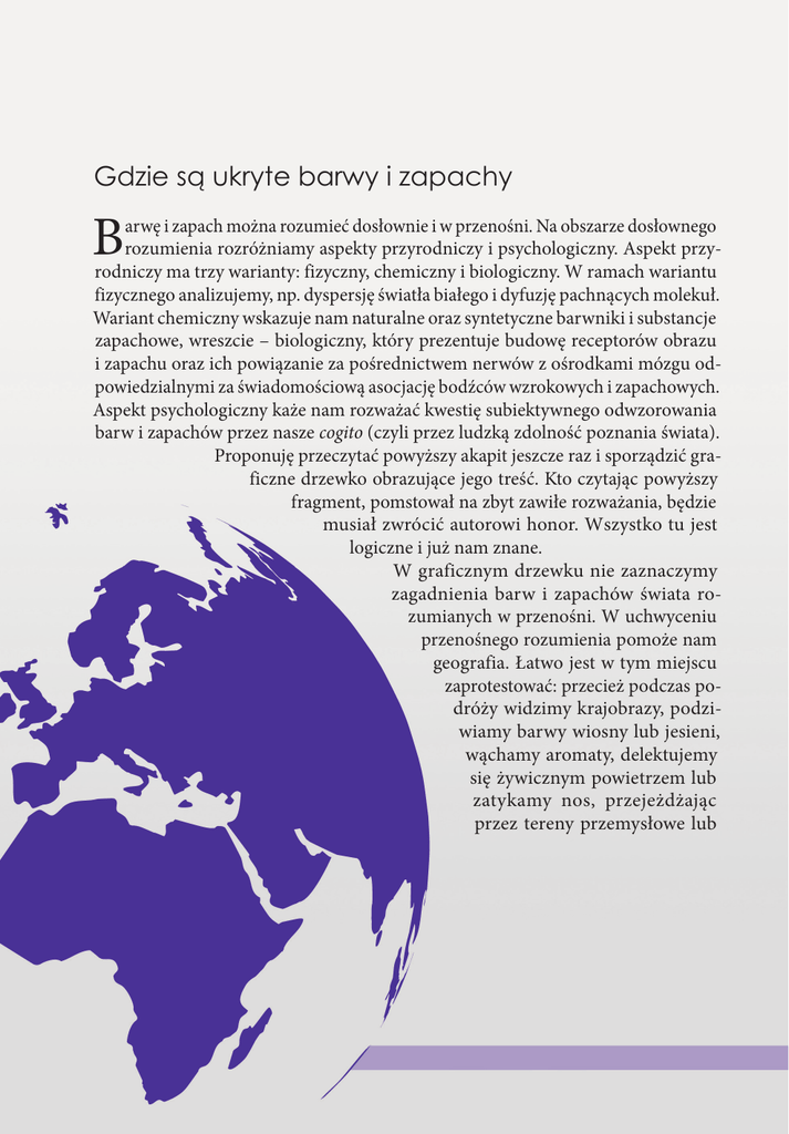 Gdzie są ukryte barwy i zapachy B arwę i zapach można rozumieć dosłownie i w przenośni. Na obszarze dosłownego rozumienia rozróżniamy aspekty przyrodniczy i psychologiczny. Aspekt przyrodniczy ma trzy warianty: fizyczny, chemiczny i biologiczny. W ramach wariantu fizycznego analizujemy, np. dyspersję światła białego i dyfuzję pachnących molekuł. Wariant chemiczny wskazuje nam naturalne oraz syntetyczne barwniki i substancje zapachowe, wreszcie – biologiczny, który prezentuje budowę receptorów obrazu i zapachu oraz ich powiązanie za pośrednictwem nerwów z ośrodkami mózgu odpowiedzialnymi za świadomościową asocjację bodźców wzrokowych i zapachowych. Aspekt psychologiczny każe nam rozważać kwestię subiektywnego odwzorowania barw i zapachów przez nasze cogito (czyli przez ludzką zdolność poznania świata). Proponuję przeczytać powyższy akapit jeszcze raz i sporządzić graficzne drzewko obrazujące jego treść. Kto czytając powyższy fragment, pomstował na zbyt zawiłe rozważania, będzie musiał zwrócić autorowi honor. Wszystko tu jest logiczne i już nam znane. W graficznym drzewku nie zaznaczymy zagadnienia barw i zapachów świata rozumianych w przenośni. W uchwyceniu przenośnego rozumienia pomoże nam geografia. Łatwo jest w tym miejscu zaprotestować: przecież podczas podróży widzimy krajobrazy, podziwiamy barwy wiosny lub jesieni, wąchamy aromaty, delektujemy się żywicznym powietrzem lub zatykamy nos, przejeżdżając przez tereny przemysłowe lub w pobliżu wysypisk śmieci. Film podróżniczy lub album ukazują nam równie dosłowne obrazy. To wszystko prawda, ale oddalam protest, gdyż wizualny kształt innych miast i regionów wraz z odczuwanym lub wyobrażonym aromatem tamtejszego powietrza to tylko powierzchniowa warstwa zagadnienia. Tak naprawdę barwy i zapachy świata są ukryte w kulturze: w poezji, muzyce, kuchni, mentalności, strojach, zabawach, wierzeniach, ambicjach, zbiorowych doświadczeniach, wyznawanych wartościach. Aby to wszystko pochwycić, trzeba znać nie tylko geografię, ale też języki i historię, trzeba mieć nieco wiedzy z dziedziny sztuki, etnografii, religioznawstwa i filozofii. Trzeba przy tym kierować się dwoma – pozornie sprzecznymi – dążeniami. Jednym z nich jest właśnie wniknięcie w odrębność sposobu życia innych (aby nie byli już obcy), a drugim – umiejętność dostrzeżenia faktu, że wszędzie ludzie tak samo się rodzą i tak samo umierają, podobnie się cieszą i z analogicznych powodów cierpią. Nie trzeba się miotać po świecie, by mieć wrażenie, że było się już wszędzie. W jednych szerokościach geograficznych (realny lub tylko wirtualny) podróżnik zaobserwuje nadmiar wody, w innych – deficyt. Tu przygnębi go noc polarna, a tam oślepi równikowe Słońce. W jednych miejscach zatęskni za morskim wybrzeżem, a w innych poczuje strach przed sztormową falą. Tu znuży go monotonna równina, gdzie indziej przytłoczy potęga górskich szczytów. Te wszystkie kontrasty przypomną mu myśl Arystotelesa, że tylko złoty środek jest właściwą miarą rzeczy. W sumie, by rozumieć świat, nie wystarczy być geografem w ściśle przyrodniczym sensie. Poznanie barw i zapachów świata to program dla człowieka o renesansowych horyzontach. Realizacji takiego programu należy życzyć każdemu humaniście. Jerzy Pilikowski