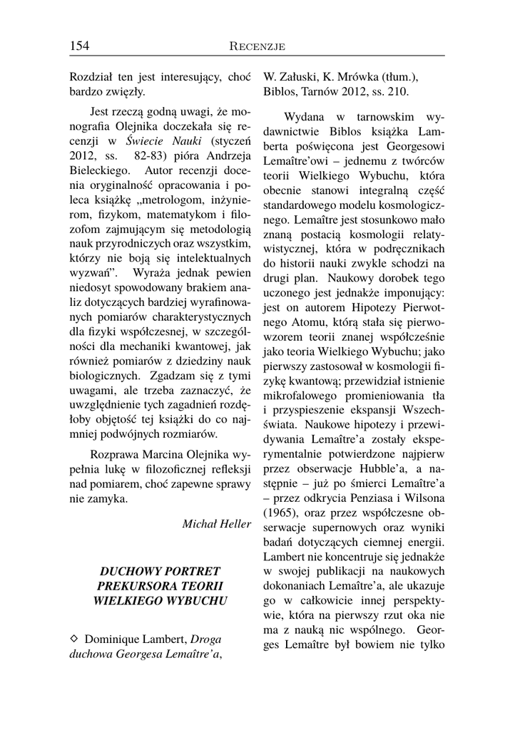 154 Recenzje Rozdział ten jest interesujący, choć W. Załuski, K. Mrówka (tłum.), bardzo zwięzły. Biblos, Tarnów 2012, ss. 210. Jest rzeczą godną uwagi, że monografia Olejnika doczekała się recenzji w Świecie Nauki (styczeń 2012, ss. 82-83) pióra Andrzeja Bieleckiego. Autor recenzji docenia oryginalność opracowania i poleca książkę „metrologom, inżynierom, fizykom, matematykom i filozofom zajmującym się metodologią nauk przyrodniczych oraz wszystkim, którzy nie boją się intelektualnych wyzwań”. Wyraża jednak pewien niedosyt spowodowany brakiem analiz dotyczących bardziej wyrafinowanych pomiarów charakterystycznych dla fizyki współczesnej, w szczególności dla mechaniki kwantowej, jak również pomiarów z dziedziny nauk biologicznych. Zgadzam się z tymi uwagami, ale trzeba zaznaczyć, że uwzględnienie tych zagadnień rozdęłoby objętość tej książki do co najmniej podwójnych rozmiarów. Wydana w tarnowskim wydawnictwie Biblos książka Lamberta poświęcona jest Georgesowi Lemaı̂tre’owi – jednemu z twórców teorii Wielkiego Wybuchu, która obecnie stanowi integralną część standardowego modelu kosmologicznego. Lemaı̂tre jest stosunkowo mało znaną postacią kosmologii relatywistycznej, która w podręcznikach do historii nauki zwykle schodzi na drugi plan. Naukowy dorobek tego uczonego jest jednakże imponujący: jest on autorem Hipotezy Pierwotnego Atomu, którą stała się pierwowzorem teorii znanej współcześnie jako teoria Wielkiego Wybuchu; jako pierwszy zastosował w kosmologii fizykę kwantową; przewidział istnienie mikrofalowego promieniowania tła i przyspieszenie ekspansji Wszechświata. Naukowe hipotezy i przewidywania Lemaı̂tre’a zostały ekspeRozprawa Marcina Olejnika wy- rymentalnie potwierdzone najpierw pełnia lukę w filozoficznej refleksji przez obserwacje Hubble’a, a nanad pomiarem, choć zapewne sprawy stępnie – już po śmierci Lemaı̂tre’a – przez odkrycia Penziasa i Wilsona nie zamyka. (1965), oraz przez współczesne obMichał Heller serwacje supernowych oraz wyniki badań dotyczących ciemnej energii. Lambert nie koncentruje się jednakże w swojej publikacji na naukowych DUCHOWY PORTRET dokonaniach Lemaı̂tre’a, ale ukazuje PREKURSORA TEORII go w całkowicie innej perspektyWIELKIEGO WYBUCHU wie, która na pierwszy rzut oka nie ma z nauką nic wspólnego. Geor Dominique Lambert, Droga ges Lemaı̂tre był bowiem nie tylko duchowa Georgesa Lemaı̂tre’a, Recenzje uczonym zaangażowanym w rozwijanie teorii wyjaśniającej ewolucję Wszechświata w ramach kosmologii relatywistycznej; był również księdzem katolickim. Jeśli nawet z dostępnych współcześnie publikacji można dowiedzieć się o naukowym dorobku Lemaı̂tre’a, to nie ma tam żadnych informacji o życiu duchowym i kapłańskim tego uczonego, ani o tym, w jaki sposób on sam ujmował relacje pomiędzy swoją wiarą religijną i swoją wiedzą naukową. Lambert przybliża czytelnikowi w swojej książce właśnie te zagadnienia. Książka składa się z ośmiu rozdziałów uzupełnionych o galerię fotografii i indeksy, a także o zapis niepublikowanego wykładu Lemaı̂tre’a z 23 czerwca 1963 r. („Wszechświat i atom”), który stanowi jeden z ostatnich tekstów tego uczonego dotyczących jego koncepcji kosmologicznych. W pierwszym rozdziale książki Lambert przedstawia krótko życiorys Lemaı̂tre’a i koncentruje się na zaprezentowaniu najważniejszych etapów jego naukowego rozwoju – przede wszystkim zaś ukazuje, w jaki sposób ewoluowały kosmologiczne idee Lemaı̂tre’a (zwłaszcza jego hipoteza atomu pierwotnego), i z jakim spotkały się przyjęciem w świecie naukowym. W rozdziale drugim Lambert przechodzi do właściwego tematu swojej książki, to znaczy do duchowej drogi Lemaı̂tre’a. Przyjmując kryterium chronologiczne, omawia najpierw czynniki które wpłynęły na osobowość i duchowość dorastają- 155 cego Georgesa; prezentuje jego młodzieńcze fascynacje religią; wskazuje na lektury kształtujące światopogląd przyszłego kosmologa, a także na jego przyjaźnie (Leon Bloy, Joris Van Severen) z okresu I wojny światowej, w czasie której Lemaı̂tre pełnił służbę wojskową w stopniu adiunkta artylerii. W rozdziale trzecim Lambert zajmuje się „teologiczną” genezą hipotezy kosmologicznej Lemaı̂tre’a, to znaczy jego analizami z zakresu egzegezy biblijnej przeprowadzanymi w czasach seminaryjnych, w których można się dopatrywać odległych inspiracji teologicznych dla późniejszej hipotezy atomu pierwotnego. W rozdziale czwartym i piątym Lambert koncentruje się na duchowości Lemaı̂tre’a, ukazując go jako gorliwego i rozmodlonego księdza, będącego członkiem Fraterni Kapłańskiej nazywanej „Przyjaciółmi Jezusa”, który nawet wtedy, gdy był zaangażowany w nauczanie i pracę badawczą na uniwersytecie Louvain, nie zaniedbywał życia modlitwy i aktywności apostolskiej (np. opiekował się studentami z Chin). Na szczególną uwagę zasługują rozdziały szósty i siódmy, w których autor zajmuje się zagadnieniem wzajemnej relacji pomiędzy hipotezą pierwotnego atomu i teologiczną koncepcją stworzenia świata przez Boga. Lemaı̂tre był świadomy tego, że jego hipotezę wyjaśniającą powstanie Wszechświata w bardzo wielu środowiskach – zarówno kościelnych jak i świeckich – interpretowano jako koncepcję 156 Recenzje sformułowaną w celach apologetycznych. Nic dziwnego, że uczony ten przykładał ogromną wagę do tego, by w swoich publikacjach i wystąpieniach podkreślać metodologiczną odrębność kosmologii i teologii; odrębność, która nie pozwala na traktowanie hipotezy ściśle naukowej w kategoriach „dowodu” na stworzenie świata przez Boga. To m.in. interwencja Lemaı̂tre’a spowodowała, że papież Pius XII zrezygnował z odwoływania się do hipotez kosmologicznych (a zwłaszcza do hipotezy atomu pier