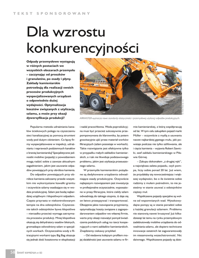 T E KST SP O N S O R O WA NY Odpady przemysłowe występują w różnych postaciach we wszystkich obszarach przemysłu – zaczynając od proszków i granulatów, po osady i płyny. Zakłady kamieniarskie potrzebują dla realizacji swoich procesów produkcyjnych wyspecjalizowanych urządzeń o odpowiednio dużej wydajności. Optymalizacja kosztów związanych z utylizacją szlamu, a może przy okazji dywersyfikacja produkcji? 58 Fot. Müller Polska Sp. z o.o. Dla wzrostu konkurencyjności AIRMASTER wyznacza nowe standardy elastyczności i przemysłowej utylizacji odpadów produkcyjnych. Popularna metoda udrażniania kana- i nadal pracochłonna. Woda poprodukcyj- mie kamieniarskiej, z którą współpracuję łów ściekowych polega na czyszczeniu na musi być przecież sukcesywnie prze- od lat. W tym celu zakupiłem pojazd marki sieci kanalizacyjnej za pomocą strumieni pompowywana do klarownika, by potem Müller – oczywiście z myślą o usuwaniu wody pod dużym ciśnieniem. Co łączy fir- grawitacyjnie ujść przez materiał worków nawet najbardziej gęstego mułu, jaki po- my wyspecjalizowane w inspekcji, udraż- filtracyjnych (szlam pozostaje w workach). wstaje podczas nie tylko szlifowania, ale nianiu i naprawach podziemnych kanałów Takie rozwiązanie jest efektywne tylko i cięcia kamienia – wyjawia Robert Sawic- z branżą kamieniarską? Specjalistyczne jed- w przypadku małych zakładów kamieniar- ki, szef zakładu kamieniarskiego w Piła- nostki mobilne (pojazdy) z powodzeniem skich, a i tak nie likwiduje podstawowego wie Górnej. mogą radzić sobie z zawsze aktualnym problemu, jakim jest utylizacja przesuszo- zagadnieniem, jakim jest usuwanie odpa- nego szlamu. – Zakupu dokonałem „z drugiej ręki”, a największa zaleta pojazdu, czyli pom- dów powstających przy obróbce kamienia. W przemyśle kamieniarskim pożąda- pa, liczy sobie ponad 20 lat. Już wiem, Do odpadów powstających przy ob- ne są dedykowane urządzenia odwad- że przydałaby się nowocześniejsza i więk- róbce kamienia zaliczamy przede wszyst- niające osady produkcyjne. Oczywiście szej wydajności, bo o ile świetnie sobie kim nie wykorzystane kawałki granitu najlepszym rozwiązaniem jest inwestycja radzimy z mułem pośrednim, to nie je- i oczywiście szlamy osadzające się w wo- w profesjonalne oczyszczalnie, wyposażo- steśmy w stanie usuwać z odstojników dzie produkcyjnej. Szlam jest bodaj najbar- ne w prasy filtracyjne, które ciekły szlam cięższy muł. dziej uciążliwym i kłopotliwymi odpadem. odwadniają do takiego stopnia, iż daje się Współczesne pojazdy specjalne są wol- Często przyrasta w niekontrolowanym on łatwo przesypywać i transportować. ne od wspomnianych wad. Wysokowy- tempie na dna odstojników. Czyszcze- Obojętnie jakie rozwiązanie przyjmiemy, dajne pompy są w stanie poradzić sobie nie takich odstojników bywa kłopotliwe optymalizując koszty związane z zagospo- z każdej granulacji szlamem. Problemu – nierzadko przecież wymaga zatrzyma- darowaniem odpadów we własnej firmie, nie stanowią nawet kruszywa! Już kilka- nia procesów produkcji. Mniej kłopotliwe warto przy okazji rozważyć pomysł świad- dziesiąt lat temu na rynku przemysłowym okazują się dehydratory osadów błotnych, czenia podobnych usług na rzecz koope- zadebiutowały mobilne urządzenia do od- gromadzące odwodniony szlam w specjal- rujących z nami zakładów kamieniarskich. wadniania szlamu, ale dopiero techniczne nych workach. Oczyszczalnia wody z fil- Znajdziemy ciekawy przykład. innowacje ostatnich lat zagwarantowały tracyjnymi workami typu Big Bag okazuje – Od niedawna kolejnym profilem mo- im niesamowitą wszechstronność. Nic się jednak dość kosztowna w eksploatacji jej działalności jest usuwanie szlamu w fir- dziwnego. Współczesne pojazdy są dzie- ŚWIAT KAMIENIA nr 83 łem inżynierów różnych dziedzin, nie tyl- a najnowsze agregaty powstały wybit- ko sektora komunalnego. nie w odpowiedzi na rosnące wymagania profesjonalistów. To właśnie wysokiej Innowacyjne rozwiązania klasy inwerter jest pierwszorzędnym walorem agregatów prądotwórczych marki Honda, bo zabezpiecza czułe na wahania Współczesny zestaw wyposażenia spe- prądu odbiorniki. – O bezkompromisowym podejściu in- kim najnowocześniejsze odbiorniki… żynierów firmy Honda przy projektowaniu elektroniczne i agregat prądotwórczy. serii nowych agregatów świadczy zasto- W najnowocześniejsze zestawy urządzeń sowanie inteligentnego automatycznego służących do badań sieci infrastruktury stabilizatora napięcia – w skrócie: i-AVR. podziemnej, w szczególności zaś sieci Ten w sposób ciągły kontroluje prędkość kanalizacyjnej, wyposażone są dziś: Za- obrotową silnika oraz parametry wyjścio- kład Inżynierii Miejskiej działający przy we napięcia i częstotliwości – przybliża EU30iS – najczęściej spotykany agregat Instytucie Inżynierii Lądowej Politechni- nowe rozwiązania agregatów serii EM prądotwórczy Honda w kamerowozach. ki Wrocławskiej i podobna jednostka na- marki Honda Marcin Wodzyński, mene- ukowo-badawcza przy Politechnice Świę- dżer produktu z firmy Aries Power Equ- towne odbiorniki. Kamery jako narzędzie tokrzyskiej. ipment Sp. z o.o., generalnego przedsta- dokumentacji prac w podziemiach i nie- wiciela koncernu Honda Motor Co. Ltd. odzowne wyposażenie współczesnych w Polsce. pojazdów do inspekcji podziemi współ- – Obie uczelnie dysponują zestawem kamer do inspekcji wideo podziemnych Fot. www.mojahonda.pl cjalistycznego pojazdu to przede wszyst- kanałów firmy Rausch. Inspekcja dokony- Silnik nowej generacji iGX390 to gwa- pracują z laserami. Technologia lasero- wana jest za każdym razem zdalnie, a spe- rancja wydłużonego czasu pracy agregatu, wa, znane narzędzie wspomagające po- cjalnej konstrukcji robotem wszędołazem zmniejszenia zużycia paliwa oraz redukcji miary w branży kamieniarskiej, przydaje