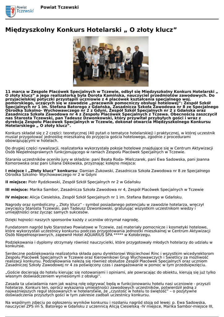 Powiat Tczewski Międzyszkolny Konkurs Hotelarski „ O złoty klucz” 11 marca w Zespole Placówek Specjalnych w Tczewie, odbył się Międzyszkolny Konkurs Hotelarski „ O złoty klucz” a jego realizatorką była Dorota Kamińska, nauczyciel przedmiotów zawodowych. Do przyjacielskiej potyczki przystąpili uczniowie z 4 placówek kształcenia specjalnego woj. pomorskiego, uczących się w zawodzie „pracownik pomocniczy obsługi hotelowej”: Zespół Szkół Specjalnych nr 1 im. Stefana Batorego z Gdańska, Zasadnicza Szkoła Zawodowa nr 8 ze Specjalnego Ośrodka Szkolno- Wychowawczego nr 2 z Gdyni, Zespół Szkół Specjalnych nr 2 z Gdańska oraz Zasadnicza Szkoła Zawodowa nr 4 z Zespołu Placówek Specjalnych z Tczewa. Obecnością zaszczycił nas Starosta Tczewski, pan Tadeusz Dzwonkowski, który przywitał przybyłych gości i wraz z dyrekcją Zespołu Placówek Specjalnych w Tczewie, dokonał otwarcia Międzyszkolnego Konkursu Hotelarskiego „ O złoty klucz”. Konkurs składał się z 2 części: teoretycznej (40 pytań o tematyce hotelarskiej) i praktycznej, w której uczestnik musiał przygotować jednostkę mieszkalną do przyjęcia gościa hotelowego, zgodnie z procedurami obowiązującymi w hotelach. Do drugiej części rywalizacji, realizatorka wykorzystała pokoje hotelowe znajdujące się w Centrum Aktywizacji Osób Niepełnosprawnych funkcjonującego w ramach Zespołu Placówek Specjalnych w Tczewie. Starania uczestników oceniło jury w składzie: pani Beata Roda- Mielczarek, pani Ewa Sadowska, pani Joanna Komorowska oraz pani Liliana Dekowska, przyznając kolejno miejsca: I miejsce i „Złoty klucz” konkursu: Damian Żukowski, Zasadnicza Szkoła Zawodowa nr 8 ze Specjalnego Ośrodka Szkolno- Wychowawczego nr 2 w Gdyni II miejsce: Piotr Rydzkowski, Zespół Szkół Specjalnych nr 2 w Gdańsku III miejsce: Marika Sambor, Zasadnicza Szkoła Zawodowa nr 4, Zespół Placówek Specjalnych w Tczewie IV miejsce: Alicja Ciesielska, Zespół Szkół Specjalnych nr 1 im. Stefana Batorego w Gdańsku. Nagrody oraz symboliczny „ Złoty klucz” - symbol posiadanego potencjału w zawodzie hotelarza, wręczył zwycięzcy Starosta Tczewski, pan Tadeusz Dzwonkowski, gratulując wszystkim uczestnikom wiedzy i umiejętności oraz życząc samych sukcesów. Dzięki hojności naszych sponsorów każdy z uczniów otrzymał nagrodę. Fundatorem nagród było Starostwo Powiatowe w Tczewie, zaś materiały pomocnicze i kosmetyki hotelowe, które wykorzystali uczestnicy konkursu podczas przygotowania jednostki mieszkalnej w Centrum Aktywizacji Osób Niepełnosprawnych, zapewnił Hotel AQUARIUS SPA ***** w Kołobrzegu. Podziękowania i dyplomy otrzymały również nauczycielki, które przygotowały młodych hotelarzy do udziału w konkursie. Serdeczne podziękowania realizatorka składa panu dyrektorowi Wojciechowi Rinc i wszystkim wicedyrektorom Zespołu Placówek Specjalnych w Tczewie oraz Kierownikowi Grup Wychowawczych i Świetlicy za możliwość realizacji konkursu. Podziękowania należą się również obsłudze Zespół Placówek Specjalnych oraz uczniom Zasadniczej Szkoły Zawodowej nr 4 za poświęcony czas i zaangażowanie w pomoc w tym przedsięwzięciu. „Goście docierają do hotelu kierując się notowaniami i opiniami, ale powracając do obiektu, kierują się już tylko własnym doświadczeniem wyniesionym z obsługi”. Zasada ta uświadamia nam jak ważną rolę odgrywać będą w funkcjonowaniu hotelu nasi uczniowie - przyszli hotelarze. Konkurs ten, oprócz wykazania umiejętności zawodowych uczestników, potwierdził jedną z najważniejszych reguł stosowanych w hotelarstwie, że „czystość w hotelu to świętość” – o pozytywne doświadczenia przyszłych gości w tym zakresie zadbali uczestnicy konkursu. Na wspólnym zdjęciu po ogłoszeniu wyników konkursu i rozdaniu nagród stoją od lewej: p. Ewa Sadowska, nauczyciel ZPS im S. Batorego w Gdańsku z uczennicą Alicją Ciesielską -IV miejsce, Marika Sambor-miejsce III, Powiat Tczewski uczennica ZSZ nr 4 z ZPS w Tczewie, p. Liliana Dekowska, pedagog ZPS w Tczewie, za nią p. Beata RodaMielczarek z uczniem Piotrem Rydzkowskim - miejsce II z ZSS nr 2 w Gdańsku, w środku p. Joanna Komorowska ze zwycięzcą konkursu - Damianem Żukowskim z ZSZ nr 8 z SOSW nr 2 w Gdyni oraz realizatorka konkursu p. Dorota Kamińska, nauczyciel ZSZ nr 4 w ZPS w Tczewie i Starosta Tczewski p. Tadeusz Dzwonkowski. Załączniki Wspólne zdjęcie po ogłoszeniu wyników konkursu i rozdaniu nagród.jpg [zdjęcie - pobierz] Starosta Tczewski p Tadeusz Dzwonkowski przekazuje zwycięzcy konkursu - Damianowi Żukowskiemu symboliczny złoty klucz konkursu.jpg [zdjęcie - pobierz] Ogłoszenie wyników konkursu.jpg [zdjęcie - pobierz] Uczeń Piotr Rydzkowski w trakcie prac porządkowych pod czujnym okiem komisji w osobie p. Ewy Sadowskiej, nauczyciela ZSS im Stefana Batorego w Gdańsku.jpg [zdjęcie - pobierz] Uczennica Marika Sambor z ZSZ nr 4 z ZPS w Tczewie przygotowuje jednostkę higieniczno-sanitarną na przybycie gościa(po lewej p. Joanna Komorowska, nauczyciel ZSZ nr 8 z SOSW nr 2w Gdyni).jpg [zdjęcie - pobierz] Piotr Rydzkowski - uczeń ZSS nr 2 w Gdańsku w trakcie wypełniania druku środków czystości i sprzętu..jpg [zdjęcie - pobierz] Damian Żukowski - uczeń ZSZ nr 8 z SOSW nr 2 w Gdyni w trakcie II etapu konkursu - wypełnianie karty kontroli wyposażenia węzła higieniczno-sanitarnego.jpg [zdjęcie - pobierz] Prezentacja zasad II etapu konkursu (od lewej-wicedyrektor ZPS w Tczewie p. Marlena ModrzejewskaTrocha, Kierownik p. Jacek Wojcieszak, Starosta Tczewski p. Tadeusz Dzwonkowski.jpg [zdjęcie - pobierz] Pierwszy etap konkursu-uczniowie przystępują do rozwiązywania testu wiedzy hotelarskiej.jpg [zdjęcie pobierz] Rozpoczęcie konkursu, przywitanie gości(od lewej dyrektor ZPS p. Wojciech Rinc, Starosta Tczewski, w głębi uczestnicy konkursu z opiekunami, po prawej realizatorka p. Dorota Kamińska.jp