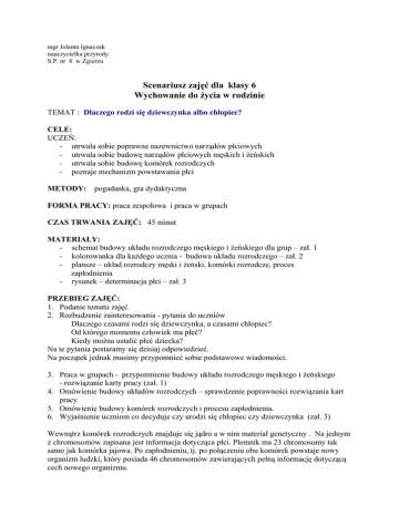 mgr Jolanta Ignaczak nauczycielka przyrody S.P. nr 8 w Zgierzu Scenariusz zajęć dla klasy 6 Wychowanie do życia w rodzinie TEMAT : Dlaczego rodzi się dziewczynka albo chłopiec? CELE: UCZEŃ: - utrwala sobie poprawne nazewnictwo narządów płciowych - utrwala sobie budowę narządów płciowych męskich i żeńskich - utrwala sobie budowę komórek rozrodczych - poznaje mechanizm powstawania płci METODY: pogadanka, gra dydaktyczna FORMA PRACY: praca zespołowa i praca w grupach CZAS TRWANIA ZAJĘĆ: 45 minut MATERIAŁY: - schemat budowy układu rozrodczego męskiego i żeńskiego dla grup – zał. 1 - kolorowanka dla każdego ucznia - budowa układu rozrodczego – zał. 2 - plansze – układ rozrodczy męski i żeński, komórki rozrodcze, proces zapłodnienia - rysunek – determinacja płci – zał. 3 PRZEBIEG ZAJĘĆ: 1. Podanie tematu zajęć 2. Rozbudzenie zainteresowania - pytania do uczniów Dlaczego czasami rodzi się dziewczynka, a czasami chłopiec? Od którego momentu człowiek ma płeć? Kiedy można ustalić płeć dziecka? Na te pytania postaramy się dzisiaj odpowiedzieć. Na początek jednak musimy przypomnieć sobie podstawowe wiadomości. 3. Praca w grupach - przypomnienie budowy układu rozrodczego męskiego i żeńskiego - rozwiązanie karty pracy (zał. 1) 4. Omówienie budowy układów rozrodczych – sprawdzenie poprawności rozwiązania kart pracy 5. Omówienie budowy komórek rozrodczych i procesu zapłodnienia. 6. Wyjaśnienie uczniom co decyduje czy urodzi się chłopiec czy dziewczynka (zał. 3) Wewnątrz komórek rozrodczych znajduje się jądro a w nim materiał genetyczny . Na jednym z chromosomów zapisana jest informacja dotycząca płci. Plemnik ma 23 chromosomy tak samo jak komórka jajowa. Po zapłodnieniu, tj. po połączeniu obu komórek powstaje nowy organizm ludzki, który posiada 46 chromosomów zawierających pełną informację dotyczącą cech nowego organizmu. Istnieją dwa rodzaje plemników: 1) z okrąglejszą główką i krótszą witką, zawierający chromosom X 2) z dłuższą główką i witką, zawierający chromosom Y. Komórka jajowa zawiera zawsze chromosom X. Jeżeli z komórką jajową połączy się plemnik z chromosomem X, to powstanie nowy organizm mający zestaw chromosomów XX i urodzi się dziewczynka. Jeżeli z komórką jajową połączy się plemnik z chromosomem Y, to powstanie nowy organizm mający zestaw XY i urodzi się chłopiec. Tak więc o tym, czy rodzice będą mieli chłopca, czy dziewczynkę decyduje tato. 7. Podsumowanie - Uświadomienie uczniom, że płeć mamy ustaloną do momentu poczęcia. - Kiedy rodzice mogą dowiedzieć się jakiej płci jest ich dziecko? Badanie USG pozwala z dużym prawdopodobieństwem określić płeć dziecka w 5 miesiącu ciąży. Choć nie zawsze się to sprawdza. - Kiedy przestajemy mieć płeć? – płeć mamy do końca życia. 8. Zakończenie zajęć – utrwalenie nazewnictwa poszczególnych elementów układu rozrodczego męskiego i żeńskiego - karta dla każdego ucznia (zał. 2) Literatura: Alina Lichtarowicz (2003) Kiedy jestem płodna a kiedy nie Wydawnictwo Unia, Katowice J.S. Turner, D.B. Helms (1999)Rozwój człowieka WSiP Warszawa Zał. 1a UKŁAD ROZRODCZY MĘSKI Podpiszcie elementy układu rozrodczego męskiego. Zał. 1b UKŁAD ROZRODCZY ŻEŃSKI Podpiszcie elementy układu rozrodczego żeńskiego. Zał. 3 DETERMINACJA PŁCI Rysunek zaczerpnięty z książki Aliny Lichtarowicz Kiedy jestem płodna a kiedy nie Zał. 2 UKŁAD ROZRODCZY MĘSKI Pomaluj odpowiednim kolorem poszczególne elementy układu rozrodczego męskiego. Zielony – jądra Żółty – prącie, penis Niebieski – nasieniowód Pomarańczowy – moszna Granatowy – cewka moczowa UKŁAD ROZRODCZY ŻEŃSKI Pomaluj odpowiednim kolorem poszczególne elementy układu rozrodczego żeńskiego. Zielony – jajniki Żółty – macica Niebieski –jajowody Pomarańczowy – pochwa Granatowy – komórka jajowa