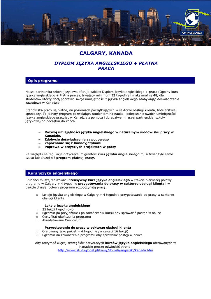 CALGARY, KANADA DYPLOM JĘZYKA ANGIELSKIEGO + PŁATNA PRACA Opis programu Nasza partnerska szkoła językowa oferuje pakiet: Dyplom języka angielskiego + praca (Ogólny kurs języka angielskiego + Płatna praca), trwający minimum 32 tygodnie i maksymalnie 48, dla studentów którzy chcą poprawić swoje umiejętności z języka angielskiego zdobywając doświadczenie zawodowe w Kanadzie. Stanowiska pracy są płatne, na poziomach początkujących w sektorze obsługi klienta, hotelarstwie i sprzedaży. To jedyny program pozwalający studentom na naukę i polepszanie swoich umiejętności języka angielskiego pracując w Kanadzie z pomocą i doradztwem naszej partnerskiej szkoły językowej od początku do końca. • • • • Rozwój umiejętności języka angielskiego w naturalnym środowisku pracy w Kanadzie. Zdobycie doświadczenia zawodowego Zapoznanie się z Kanadyjczykami Poprawa w przyszłych projektach w pracy Ze względu na regulacje dotyczące imigrantów kurs języka angielskiego musi trwać tyle samo czasu lub dłużej niż program płatnej pracy. Kurs języka angielskiego Studenci muszą realizować intensywny kurs języka angielskiego w trakcie pierwszej połowy programu w Calgary + 4 tygodnie przygotowania do pracy w sektorze obsługi klienta i w trakcie drugiej połowy programu rozpoczynają pracę. • Lekcje języka angielskiego w Calgary + 4 tygodnie przygotowania do pracy w sektorze obsługi klienta • • • • Lekcje języka angielskiego 25 lekcji tygodniowo Egzamin po przyjeździe i po zakończeniu kursu aby sprawdzić postęp w nauce Certyfikat ukończenia programu Akredytowane Curriculum • • Przygotowanie do pracy w sektorze obsługi klienta Oferowany jako pakiet = 4 tygodnie /w całości 16 lekcji) Egzamin na zakończenie programu aby sprawdzić postęp w nauce Aby otrzymać więcej szczegółów dotyczących kursów języka angielskiego oferowanych w Kanadzie prosze odwiedzić stronę: http://www.studyglobal.pl/kursy/dorosli/angielski/kanada.htm Wymagania • • • • • • • • • Minimalny wiek: 19 lat Maksymalny wiek: 45 lat Minimalny poziom języka angielskiego: Upper intermediate (B2) w momencie rozpoczęcia pracy Minimum 1 rok studiów Wypełniony formularz zgłoszeniowy Egzamin początkowy & rozmowa kwalifikacyjna List motywacyjny i CV w języku angielskim Pomyślne ukończenie mínimum 16 tygodni kursu & kursu obsługi klienta Wcześniejsze doświadczenie zawodowe Szczegóły dotyczące płatnej pracy Istnieje ogromne zróżnicowanie pomiędzy rodzajami pracy. Jednak studenci powinni być elastyczni i przygotowani na podjęcie pracy na jakimkowiek stanowisku. Stanowisko pracy studenta będzie zależne od dostępności, czasu trwania programu, poziomu języka angielskiego, wcześniejszego doświadczenia oraz nastawienia. Studenci będą stosować swoje umiejętności językowe we wszystkich dostępnych stanowiskach pracy jako, że będą oni mieli kontakt z klientami. Ważna jest elastyczność. Rodzaje pracy: • • • • sprzedaż gastronomia hotelarstwo turystyka Pensja: Pensja zależna jest od rodzaju wykonywanej pracy, ale zazwyczaj w Calgary oferuje się pomiędzy $8.00 a $10.00 za godzinę. Ilość godzin pracy zależna jest od rodzaju pracy zaoferowanego studentowi. Godziny: Student zostanie poinformowany o godzinach pracy przed rozpoczęciem. Większość oferowanych stanowisk pracy wymaga pracy zmianowej; zmiany są poranne, popołudniowe lub wieczorne. Zmiany mogą być dzienne lub tygodniowe. Zazwyczaj pracownicy, którzy mają większy staż pracy w firmie mają większą możliwość wybrania zmian najbardziej im odpowiadających niż nowi pracownicy. Studenci powinni być przygotowani na elastyczne godziny pracy. Praca, w której konieczna byłaby również zmiana nocna nie będzie oferowana studentowi. Ceny Całkowity koszt programu: Pakiet kursu intensywnego języka angielskiego + program płatnej pracy + koszt programu pracy • • Koszt programu pracy: 1100 CAD Koszt programu (poszukiwanie pracy na własną rękę): 495 CAD Pakiety: 16 tygodni kursu intensywnego (25 lekcji w tygodniu) + 16 tygodni płatnej pracy: CAD 4096 20 tygodni kursu intensywnego (25 lekcji w tygodniu) + 20 tygodni płatnej pracy: CAD 5120 24 tygonie kursu intensywnego (25 lekcji w tygodniu) + 24 tygodnie płatnej pracy: CAD 5928 Cena obejmuje: kurs języka angielskiego, program pracy Cena nie obejmuje: opłaty rejestracyjnej, opłaty rejestracyjnej za zakwaterowanie, transferu z lotniska, zakwaterowania, ubezpieczenia, wysyłki dokumentu potwierdzającego uczestnictwo (wiza)… Aby uzyskać więcej informacji dotyczących cen prosze odwiedzić stronę: http://www.studyglobal.pl/kursy/dorosli/angielski/kanada/calgary/gv-calgary/ceny.htm Zakwaterowanie (opcjonalne) Podczas trwania kursu szkoła oferuje zakwaterowanie w rodzinie goszczącej, apartamencie lub rezydencji studenckiej. Podczas trwania programu pracy w Calgary studenci mogą zarezerwować zakwaterowanie za pośrednictwem szkoły lub poszukać zakwaterowania na własną rękę. Aby uzyskać więcej informacji na temat zakwaterowania prosze odwiedzić: http://www.studyglobal.pl/kursy/dorosli/angielski/kanada/calgary/gv-calgary/zakwaterowanie.htm Students Must have*: Informacje dotyczące wizy Nasza partnerska szkoła językowa po opłaceniu całkowitej należnej kwoty za program wydaje odpowiednie potwierdzenie niezbędne do otrzymania wizy. List ten potwierdza, że student został zapisany do programu, który obejmuje praktyki jako część wspólną programu. Studenci powinni posiadać*: 1. 2. 3. 4. Pozwolenie na pracę w Kanadzie & COOP Work Permit lub Working Holiday Visa lub SWAP (Student Work Abroad Program) lub wizę studencką * WHV, SWAP & YWE dostępne tylko dla niektórych narodowości. Prosze skonsutlować się z ambasadą lub konsulatem w Pańskim kraju. • • • Studenci powinni ubiegać się o POZWOLENIE DLA STUDENTÓW, nawet jeżeli wyjeżdżają na 24 tygodnie. B