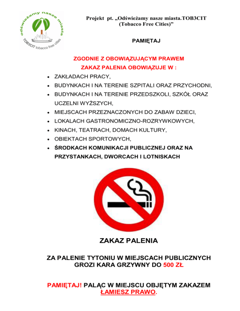 Projekt pt. „Odświeżamy nasze miasta.TOB3CIT (Tobacco Free Cities)” PAMIĘTAJ ZGODNIE Z OBOWIĄZUJĄCYM PRAWEM ZAKAZ PALENIA OBOWIĄZUJE W : ZAKŁADACH PRACY, BUDYNKACH I NA TERENIE SZPITALI ORAZ PRZYCHODNI, BUDYNKACH I NA TERENIE PRZEDSZKOLI, SZKÓŁ ORAZ UCZELNI WYŻSZYCH, MIEJSCACH PRZEZNACZONYCH DO ZABAW DZIECI, LOKALACH GASTRONOMICZNO-ROZRYWKOWYCH, KINACH, TEATRACH, DOMACH KULTURY, OBIEKTACH SPORTOWYCH, ŚRODKACH KOMUNIKACJI PUBLICZNEJ ORAZ NA PRZYSTANKACH, DWORCACH I LOTNISKACH ZAKAZ PALENIA ZA PALENIE TYTONIU W MIEJSCACH PUBLICZNYCH GROZI KARA GRZYWNY DO 500 ZŁ PAMIĘTAJ! PALĄC W MIEJSCU OBJĘTYM ZAKAZEM ŁAMIESZ PRAWO. Czym jest Projekt pt. „Odświeżamy nasze miasta. TOB3CIT (Tobacco Free Cities)”? Jest to ogólnopolski Projekt realizowany przez Państwową Inspekcję Sanitarną finansowany przez Międzynarodową Unię ds. Walki z Gruźlicą i Chorobami Płuc - organizację założoną przez prowadzącego działalność filantropijną Michaela Bloomberga, burmistrza Nowego Jorku. OGÓLNYM CELEM PROJEKTU JEST: Ochrona mieszkańców Polski przed szkodliwym działaniem dymu tytoniowego. CELE SZCZEGÓŁOWE PROJEKTU: Wzmocnienie realizacji ustawy z dnia 9 listopada 1995r. o ochronie zdrowia przed następstwami używania tytoniu i wyrobów tytoniowych(Dz. U. z 1996r. ,Nr 10, poz.55 z późn.zm.) poprzez egzekucję zapisów w zakresie przestrzegania zakazu palenia oraz oznakowania stref bezdymnych, prowadzoną w ramach nadzoru bieżącego przez funkcjonariuszy Państwowej Inspekcji Sanitarnej, Straży Miejskiej w Chorzowie i Policji w Chorzowie Wzmocnienie przestrzegania ustawy poprzez kampanię społeczną informującą o obowiązujących regulacjach w zakresie miejsc wolnych od dymu tytoniowego oraz konsekwencjach zdrowotnych używania tytoniu (bierne i czynne palenie). ADRESATAMI PROJEKTU SĄ: Osoby dorosłe CZAS TRWANIA PROJEKTU Od 1 października 2011r . do 30 września 2013r. Polska jest krajem, w którym palenie tytoniu od lat stanowi jedną z największych pojedynczych przyczyn utraty zdrowia. Poprzez odpowiednie działania możemy temu zapobiec. Zgodnie z najnowszym ogólnopolskim badaniem Głównego Inspektoratu Sanitarnego z 2011r. do codziennego palenia przyznaje się co trzeci (31 %) Polak w wieku 15 lat i więcej. Zarówno osoby palące, jak i niepalące dostrzegają istnienie miejsc w których zakaz palenia nie jest przestrzegany. Najczęściej jako takie miejsca wskazywane są przystanki i obiekty komunikacji miejskiej, bary puby, dyskoteki, kluby muzyczne oraz zakłady pracy. Najrzadziej zakaz palenia łamany jest w centrach handlowych, obiektach kulturalnych oraz obiektach rekreacyjnowypoczynkowych.
