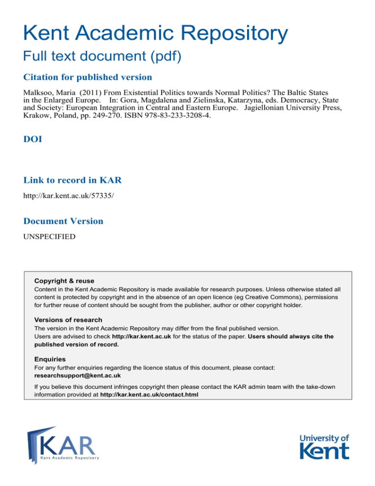 Kent Academic Repository Full text document (pdf) Citation for published version Malksoo, Maria (2011) From Existential Politics towards Normal Politics? The Baltic States in the Enlarged Europe. In: Gora, Magdalena and Zielinska, Katarzyna, eds. Democracy, State and Society: European Integration in Central and Eastern Europe. Jagiellonian University Press, Krakow, Poland, pp. 249-270. ISBN 978-83-233-3208-4. DOI Link to record in KAR http://kar.kent.ac.uk/57335/ Document Version UNSPECIFIED Copyright & reuse Content in the Kent Academic Repository is made available for research purposes. Unless otherwise stated all content is protected by copyright and in the absence of an open licence (eg Creative Commons), permissions for further reuse of content should be sought from the publisher, author or other copyright holder. Versions of research The version in the Kent Academic Repository may differ from the final published version. Users are advised to check http://kar.kent.ac.uk for the status of the paper. Users should always cite the published version of record. Enquiries For any further enquiries regarding the licence status of this document, please contact: [email protected] If you believe this document infringes copyright then please contact the KAR admin team with the take-down information provided at http://kar.kent.ac.uk/contact.html (CEE) came to be widely used as a synonym for the group of ten countries from the former Eastern Bloc aspiring to EU membership. This book is an attempt to demonstrate and assess the changes resulting from the EU enlargements of 2004 and 2007 and European integration processes, identifying both the similarities and the differences in the countries of the region. This volume is addressed to those interested in Central and Eastern Europe. It has two main aims: rst, to present the recent alterations in the region resulting from the processes of European integration; second, to offer an account of the process of Europeanisation in the countries occurring after accession to the EU that goes beyond just conditionality mechanisms. The collection also attempts to re ect on and contribute to the discussion on how the changes taking place in CEE in uence theorisation on Europeanisation a concept initially constructed in order to tackle the changes taking place in response to the processes of European integration in the old member states. The book is divided into four parts, each concentrating on an area where the changes seem to be most profound and most interesting from the point of view of theorising on the impact of the European integration processes: democratic consolidation in the region, collective identity construction, functioning of civil society and studies on foreign policy and international relations. Magdalena Góra is Assistant Professor at the Institute of European Studies, Jagiellonian University, Kraków. Her academic interests include processes of collective identity formation in the context of EU enlargement, the European Union as an actor in international relations, contemporary Polish foreign policy, and Polish-Jewish and Polish-Israeli relations. Katarzyna Zielińska is Assistant Professor at the Institute of Sociology and International Programmes Coordinator at the Centre for European Studies of the Jagiellonian University, DEMOCRACY, STATE AND SOCIETY In the years after the breakthrough events of 1989, the concept of Central and Eastern Europe DEMOCRACY, STATE AND SOCIETY European Integration in Central and Eastern Europe Kraków. Her academic interests include gender issues in the EU as well as religion and politics in modern societies. www.wuj.pl Edited by Magdalena Góra and Katarzyna Zielińska Jagiellonian University Press Publikacja obj ta jest prawem autorskim. Wszelkie prawa zastrze one. Kopiowanie i rozpowszechnianie zabronione. Publikacja przeznaczona jedynie dla klientów indywidualnych. Zakaz rozpowszechniania i udost pniania serwisach bibliotecznych Democracy_Gora.indd 1 2011-08-29 12:10:18 '(02&5$&< 67$7( $1'62&,(7< Publikacja obj ta jest prawem autorskim. Wszelkie prawa zastrze one. Kopiowanie i rozpowszechnianie zabronione. Publikacja przeznaczona jedynie dla klientów indywidualnych. Zakaz rozpowszechniania i udost pniania serwisach bibliotecznych Publikacja obj ta jest prawem autorskim. Wszelkie prawa zastrze one. Kopiowanie i rozpowszechnianie zabronione. Publikacja przeznaczona jedynie dla klientów indywidualnych. Zakaz rozpowszechniania i udost pniania serwisach bibliotecznych '(02&5$&< 67$7( $1'62&,(7< (XURSHDQ,QWHJUDWLRQ LQ&HQWUDODQG(DVWHUQ(XURSH (GLWHGE\0DJGDOHQD*öUDDQG.DWDU]\QD=LHOLñVND -DJLHOORQLDQ8QLYHUVLW\3UHVV Publikacja obj ta jest prawem autorskim. Wszelkie prawa zastrze one. Kopiowanie i rozpowszechnianie zabronione. Publikacja przeznaczona jedynie dla klientów indywidualnych. Zakaz rozpowszechniania i udost pniania serwisach bibliotecznych The publication of this volume was financed as a part of the project “Europeanisation and Governance in Central and Eastern Europe”. This project was completed with the support granted by Iceland, Liechtenstein and Norway by means of co-financing from the European Economic Area Financial Mechanism and the Norwegian Financial Mechanism as part of the Scholarship and Training Fund. REVIEWER prof. dr hab. Dariusz Milczarek COVER DESIGN Agnieszka Winciorek © Copyright by Magdalena Góra, Katarzyna Zielińska & Jagiellonian University Press All rights reserved No part of the book may be reprinted or reproduced or utilized in any form or by electronic, mechanical or other means, now known or hereafter invented, including photocoping and recording, or in any information storage or retrival system, without permission in writing from the publisher. ISBN 978-83-233-3208-4 www.wuj.pl Wydawnictwo Uniwersytetu Jagiellońskiego Redakcja: ul. Michałowskiego 9/2, 31-126 Kraków tel. 12-631-18-81, tel./fax 12-631-18-83 Dystrybucja: tel. 12-631-01-97, tel./fax 12-631-01-98 tel. ko