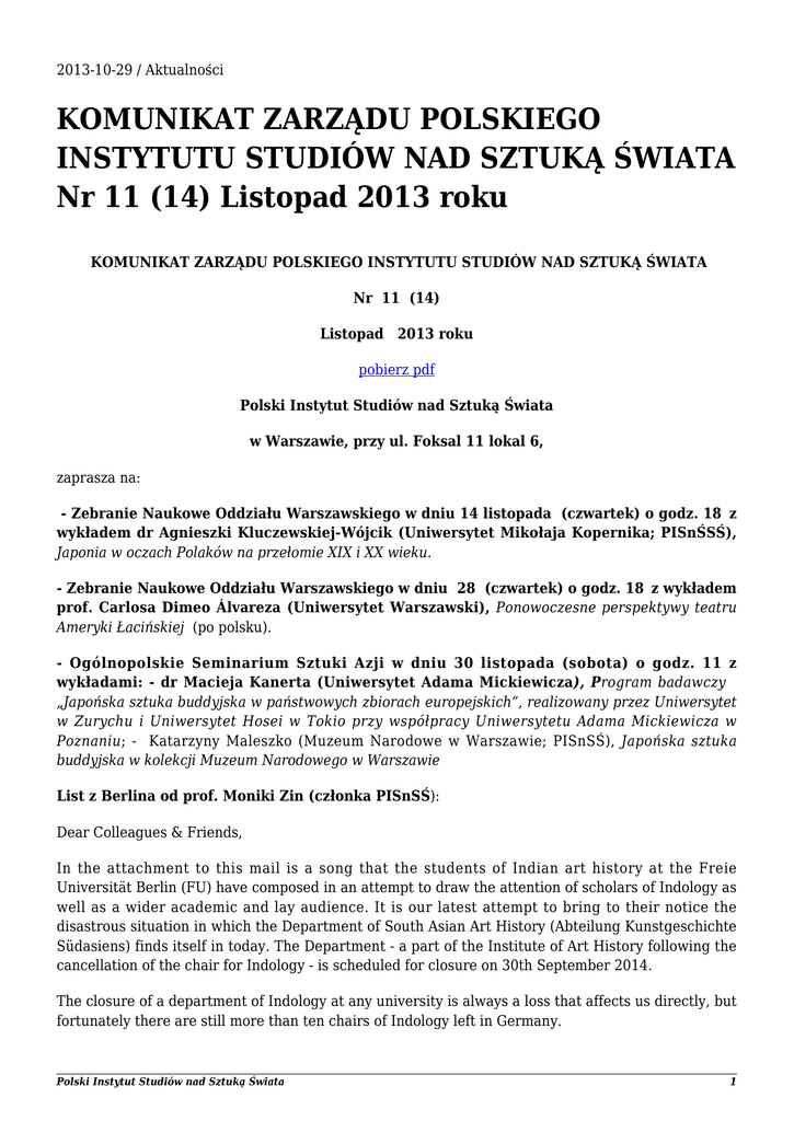 2013-10-29 / Aktualności KOMUNIKAT ZARZĄDU POLSKIEGO INSTYTUTU STUDIÓW NAD SZTUKĄ ŚWIATA Nr 11 (14) Listopad 2013 roku KOMUNIKAT ZARZĄDU POLSKIEGO INSTYTUTU STUDIÓW NAD SZTUKĄ ŚWIATA Nr 11 (14) Listopad 2013 roku pobierz pdf Polski Instytut Studiów nad Sztuką Świata w Warszawie, przy ul. Foksal 11 lokal 6, zaprasza na: - Zebranie Naukowe Oddziału Warszawskiego w dniu 14 listopada (czwartek) o godz. 18 z wykładem dr Agnieszki Kluczewskiej-Wójcik (Uniwersytet Mikołaja Kopernika; PISnŚSŚ), Japonia w oczach Polaków na przełomie XIX i XX wieku. - Zebranie Naukowe Oddziału Warszawskiego w dniu 28 (czwartek) o godz. 18 z wykładem prof. Carlosa Dimeo Álvareza (Uniwersytet Warszawski), Ponowoczesne perspektywy teatru Ameryki Łacińskiej (po polsku). - Ogólnopolskie Seminarium Sztuki Azji w dniu 30 listopada (sobota) o godz. 11 z wykładami: - dr Macieja Kanerta (Uniwersytet Adama Mickiewicza), Program badawczy „Japońska sztuka buddyjska w państwowych zbiorach europejskich”, realizowany przez Uniwersytet w Zurychu i Uniwersytet Hosei w Tokio przy współpracy Uniwersytetu Adama Mickiewicza w Poznaniu; - Katarzyny Maleszko (Muzeum Narodowe w Warszawie; PISnSŚ), Japońska sztuka buddyjska w kolekcji Muzeum Narodowego w Warszawie List z Berlina od prof. Moniki Zin (członka PISnSŚ): Dear Colleagues & Friends, In the attachment to this mail is a song that the students of Indian art history at the Freie Universität Berlin (FU) have composed in an attempt to draw the attention of scholars of Indology as well as a wider academic and lay audience. It is our latest attempt to bring to their notice the disastrous situation in which the Department of South Asian Art History (Abteilung Kunstgeschichte Südasiens) finds itself in today. The Department - a part of the Institute of Art History following the cancellation of the chair for Indology - is scheduled for closure on 30th September 2014. The closure of a department of Indology at any university is always a loss that affects us directly, but fortunately there are still more than ten chairs of Indology left in Germany. Polski Instytut Studiów nad Sztuką Świata 1 However, according to an official survey (“Kleine Fächer”), there are only 1.33 professorships, i.e. departments of South Asian art history at German universities (the “0.33” refers to the chair of oriental art history at Bonn University; this professorship covers the art of South Asia, East Asia and the Islamic world). Cancelling the last full-fledged professorship for the art of South Asia would therefore be tantamount to killing an entire discipline. That this decision has been taken in a city which – with much public support – has just embarked on the implementation of a project to build the ‘Humboldt-Forum’ makes it all the more startling. Art history institutes of all the universities in Berlin are anxious to be involved in the planning of this project and their respective universities are projecting themselves - in South Asia among other regions - as globally established think tanks that welcome and promote cultural diversity and the multifaceted histories of their prospective students and faculty members. At the same time, a subject focussing on the material testimonies of a region inhabited by one-seventh of world's population is simply struck off without much ado. This not only severs a long-standing scholarly tradition that has won international acclaim for its ground breaking contributions to both South and Central Asian art history; it also makes it impossible to provide training for the very specialists whom, not just the Humboldt-Forum, but also other museums and institutions like the German Archaeological Institute will require in the coming decades to handle the collections of these institutions, research their material and present it to a wider audience in a wholly scientific manner. The FU’s present approach in this matter, together with the level of ignorance encountered in other official institutions in Berlin and across Germany, serve as evidence of both economic and intellectual inadequacy. The makers of this momentous decision have still not fully realized the import of the step they have taken. Your letters of appeal to the President of the Freie Universität and / or Senate Administration for Education, Youth and Science [[email protected] / [email protected]], expressing your disapproval of the proposed closure may help change the situation. As would your gesture of support by signing the enclosed petition: https://www.change.org/de/Petitionen/an-das-pr%C3%A4sidium-der-freien-universit%C3%A4t-berlinto-the-executive-committee-of-the-freie-universit%C3%A4t-berlin-nein-zur-streichung-der-s%C3%BC dasiatischen-kunstgeschichte-saying-no-to-the-planned-abolishment-of-the-subject-of-art-history-of-so uth-asia Thanking you, Sincerely, Monika Zin Temporary Head of Department since 2010 (On behalf of the students & staff of the Department of South Asian Art History, Freie Universität Berlin) Konferencja: SUSTAINABLE ART – FACING THE NEED FOR REGENERATION, RESPONSIBILITY AND RELATIONS Conference Agenda Polski Instytut Studiów nad Sztuką Świata 2 Institute of Art History, University of Wroclaw & Polish Institute of World Art Studies, Instytut Historii Sztuki / Institute of Art History, University of Wroclaw Szewska Street 36, 50-139 Wrocław, November, 20-21, 2013 ROOM 309 – third floor Registration/collection of conference pack: Wednesday and Thursday from 8.30, third floor Wednesday, 20 November 8.50 Welcoming and official opening PANEL I: Social participation Chair: Anna Markowska (University of Wroclaw) ● ● ● ● ● ● 9.00 - 9.20 Mateusz Salwa (University of Warsaw), Garden as sustainable art 9.20 – 9. 40 Michał Kępski (Adam Mickiewicz University, Poznań), Sustainable past in eco-museum 9.40 – 10.00 Sofia Ponte (University of Porto), Musealizing functional art 10.00 – 10.20 Micaela Deiana (University