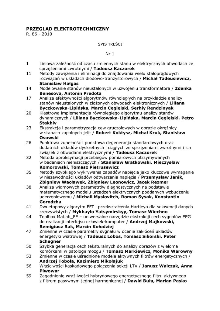 PRZEGLĄD ELEKTROTECHNICZNY R. 86 - 2010 SPIS TREŚCI Nr 1 1 11 14 17 20 23 26 32 35 38 41 44 47 50 53 56 59 Liniowa zaleŜność od czasu zmiennych stanu w elektrycznych obwodach ze sprzęŜeniami zwrotnymi / Tadeusz Kaczorek Metody zawęŜenia i eliminacji do znajdowania wielu stałoprądowych rozwiązań w układach diodowo-tranzystorowych / Michał Tadeusiewicz, Stanisław Hałgas Modelowanie stanów nieustalonych w uzwojeniu transformatora / Zdenka Benesova, Antonin Predota Analiza efektywności algorytmów równoległych na przykładzie analizy stanów nieustalonych w złoŜonych obwodach elektronicznych / Liliana Byczkowska-Lipińska, Marcin Cegielski, Serhiy Rendzinyak Klastrowa implementacja równoległego algorytmu analizy stanów dynamicznych / Liliana Byczkowska-Lipińska, Marcin Cegielski, Petro Stakhiv Ekstrakcja i parametryzacja cew gruczołowych w obrazie okręŜnicy w stanach zapalnych jelit / Robert Koktysz, Michał Kruk, Stanisław Osowski Punktowa zupełność i punktowa degeneracja standardowych oraz dodatnich układów dyskretnych i ciągłych ze sprzęŜeniami zwrotnymi i ich związek z obwodami elektrycznymi / Tadeusz Kaczorek Metoda aproksymacji przebiegów pomiarowych otrzymywanych w badaniach nieniszczących / Stanisław Gratkowski, Mieczysław Komorowski, Tomasz Pietrusewicz Metody szybkiego wykrywania zapadów napięcia jako kluczowe wymaganie w niezawodności układów odtwarzania napięcia / Przemysław Janik, Zbigniew Wacławek, Zbigniew Leonowicz, Jacek Rezmer Analiza widmowych parametrów diagnostycznych na podstawie matematycznego modelu urządzeń elektrycznych poddanych wzbudzeniu uderzeniowemu / Michail Myslovitch, Roman Sysak, Konstantin Gorodzha Dwuetapowy algorytm FFT i przekształcenia Hartleya dla sekwencji danych rzeczywistych / Mykhaylo Yatsymirskyy, Tomasz Wiechno Toolbox Matlab_FE – uniwersalne narzędzie ekstrakcji cech sygnałów EEG do realizacji interfejsu człowiek-komputer / Andrzej Majkowski, Remigiusz Rak, Marcin Kołodziej Zmienne w czasie parametry sygnału w ocenie zakłóceń układów energetyki wiatrowej / Tadeusz Lobos, Tomasz Sikorski, Peter Schegner Szybka generacja cech teksturalnych do analizy obrazów z wieloma komórkami w patologii mózgu / Tomasz Markiewicz, Monika Warowny Zmienne w czasie uśrednione modele aktywnych filtrów energetycznych / Andrzej Toboła, Kazimierz Mikołajuk Właściwości kaskadowego połączenia sekcji LTV / Janusz Walczak, Anna Piwowar Zagadnienie wraŜliwości hybrydowego energetycznego filtru aktywnego z filtrem pasywnym jednej harmonicznej / Dawid Buła, Marian Pasko 62 65 68 71 74 77 80 83 86 89 92 95 98 100 103 106 109 112 115 118 121 Modele matematyczne procesów kardiograficznych / Vsevolod Horyachko, Mariya Howykowycz O praktycznej diagnostyce układów elektronicznych w dziedzinie częstotliwości / Bogdan Blagitko, Volodymyr Brygilewicz, Vasyl Rabyk Wykorzystanie numerycznej odwrotnej transformaty Laplace’a w symulacji nieliniowych układów opisanych przez szereg Volterry / Lubomír Brancik Modele elektryczno-ekonomiczne w sterowaniu lokalnym rejonem elektroenergetycznym / Valery Zhuikov, Julia Petergerya, Olexander Ivanin Obwodowy model łuku elektrycznego w wyłączniku / Mirosław Wołoszyn, Jacek Horiszny Sterowany aktuator termoelastyczny ze sprzęgłem tarciowym do dokładnego pozycjonowania / Ivo Dolezel, Bohus Ulrych, Eva Kronerova Analiza procesu demagnetyzacji obiektów ferromagnetycznych / Mirosław Wołoszyn, Paweł Zimny, Kazimierz Jakubiuk Konstrukcja efektywnych cewek generujących pole do indukcyjnego nagrzewania paramagnetycznych wsadów cylindrycznych / Pavel Karban, Ivo Dolezel, Martina Donatova Pompy magnetohydrodynamiczne z magnesami trwałymi do płynnych metali i soli / Ivo Dolezel, Bohus Ulrych, Vaclav Kotlan, Vaclav Valenta Wpływ ekranu na rozkład pola magnetycznego w trójfazowym torze wielkoprądowym / Zygmunt Piątek, Tomasz Szczegielniak, Dariusz Kusiak Minimalizacja funkcjonału z wykorzystaniem wariacyjnej metody zbiorów poziomicowych w impedancyjnej tomografii komputerowej / Stefan Filipowicz, Jan Sikora, Tomasz Rymarczyk Zastosowanie aproksymacji niezmienniczych do wariacyjnego sformułowania statycznego pola elektrycznego / Vsevolod Horyachko, Mariya Howykowycz Modelowanie dynamiki urządzeń elektromechanicznych za pomocy metody polowo-obwodowej / Volodymyr Maday, Nataliya Musykhina Estymacja rozkładu temperatury w ciała ludzkiego przy zastosowaniu zewnętrznej hipertermii o częstotliwościach radiowych / Eugeniusz Kurgan, Piotr Gas Wpływ geometrii elektrod na siły działające na cząsteczki w dielektroforezy polem sinusoidalnie zmiennym / Eugeniusz Kurgan, Piotr Gas Zakłócenia elektromagnetyczne samolocie na skutek prądów wirowych indukowane w elementach metalowych / Mirosław Wołoszyn Chaos w obwodach ułamkowego rzędu / Zdzisław Trzaska Makromodelowanie komponentów systemów elektromechanicznych / Bohdan Melnyk, Yuriy Kozak, Ivanna Nadych Modelowanie systemów elektroenergetycznych z wykorzystaniem nowoczesnego, równoległego oprogramowania bazującego na podejściu diakoptycznym / Oksana Hoholyuk, Petro Stakhiv, Serhiy Rendzinyak Graficzna analiza obciąŜeń Polskiego Systemu Elektroenergetycznego przy pomocy PCA i mapy Kohonena / Krzysztof Siwek Selekcja cech diagnostycznych w zastosowaniu do rozpoznania róŜnych uszkodzeń prętów maszyny indukcyjnej / Jarosław Kurek, Stanisław Osowski 124 127 130 133 136 139 141 144 147 150 152 155 158 161 164 166 169 172 175 178 180 183 Analiza jakości elementów radio-elektronicznych w systemach produkcji wieloetapowej / Leonid Nedostup, Iuri Bobalo, Myroslav Kiselychnyk Niekompletna kolumnowo-węzłowa faktoryzacja macierzy rzadkich / Sergiy Saukh Wielopunktowy ekran dotykowy – alternatywny interfejs człowiekkomputer / Marcin Augustynowicz Komputerowe modelowanie procesów korozyjnych metodą elektrochemicznej spektroskopii impedancyjnej / Maria Trzaska Wpływ struktury mode