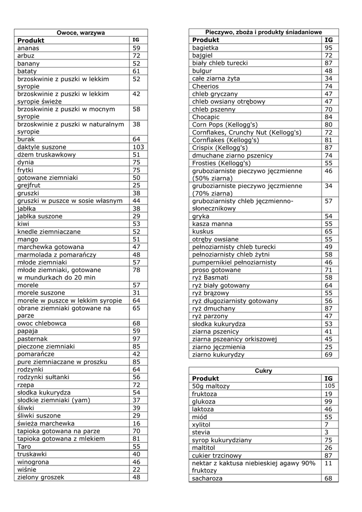 Owoce, warzywa Produkt ananas arbuz banany bataty brzoskwinie z puszki w lekkim syropie brzoskwinie z puszki w lekkim syropie świeże brzoskwinie z puszki w mocnym syropie brzoskwinie z puszki w naturalnym syropie burak daktyle suszone dżem truskawkowy dynia frytki gotowane ziemniaki grejfrut gruszki gruszki w puszce w sosie własnym jabłka jabłka suszone kiwi knedle ziemniaczane mango marchewka gotowana marmolada z pomarańczy młode ziemniaki młode ziemniaki, gotowane w mundurkach do 20 min morele morele suszone morele w puszce w lekkim syropie obrane ziemniaki gotowane na parze owoc chlebowca papaja pasternak pieczone ziemniaki pomarańcze pure ziemniaczane w proszku rodzynki rodzynki sułtanki rzepa słodka kukurydza słodkie ziemniaki (yam) śliwki śliwki suszone świeża marchewka tapioka gotowana na parze tapioka gotowana z mlekiem Taro truskawki winogrona wiśnie zielony groszek IG 59 72 52 61 52 42 58 38 64 103 51 75 75 50 25 38 44 38 29 53 52 51 47 48 57 78 57 31 64 65 68 59 97 85 42 85 64 56 72 54 37 39 29 16 70 81 55 40 46 22 48 Pieczywo, zboża i produkty śniadaniowe Produkt bagietka bajgiel biały chleb turecki bulgur całe ziarna żyta Cheerios chleb gryczany chleb owsiany otrębowy chleb pszenny Chocapic Corn Pops (Kellogg's) Cornflakes, Crunchy Nut (Kellogg's) Cornflakes (Kellogg's) Crispix (Kellogg's) dmuchane ziarno pszenicy Frosties (Kellogg's) gruboziarniste pieczywo jęczmienne (50% ziarna) gruboziarniste pieczywo jęczmienne (70% ziarna) gruboziarnisty chleb jęczmiennosłonecznikowy gryka kasza manna kuskus otręby owsiane pełnoziarnisty chleb turecki pełnoziarnisty chleb żytni pumpernikiel pełnoziarnisty proso gotowane ryż Basmati ryż biały gotowany ryż brązowy ryż długoziarnisty gotowany ryż dmuchany ryż parzony słodka kukurydza ziarna pszenicy ziarna pszeanicy orkiszowej ziarno jęczmienia ziarno kukurydzy Cukry Produkt 50g maltozy fruktoza glukoza laktoza miód xylitol stevia syrop kukurydziany maltitol cukier trzcinowy nektar z kaktusa niebieskiej agawy 90% fruktozy sacharoza IG 95 72 87 48 34 74 47 47 70 84 80 72 81 87 74 55 46 34 57 54 55 65 55 49 58 46 71 58 64 55 56 87 47 53 41 45 25 69 IG 105 19 99 46 55 7 3 75 26 87 11 68 Ciasta, ciastka, wypieki, przekąski i słodycze Produkt babka z polewą truskawkową batonik muesli (z suszonymi owocami) biała czekolada bezy biszkopt bułeczki drożdżowe chipsy ziemniaczane solone chrupki kukurydziane ciasteczka owsiane ciasteczka ryżowe ciasto bananowe bez cukru ciasto bananowe z cukrem ciasto czekoladowe z polewą czekoladową ciasto waniliowe z polewą waniliową crumpet (rodzaj naleśnika) Digestives LU petitki M&M's orzechowe Mars mleczna czekolada mufinki naleśniki Nutella orzeszki cashew solone orzeszki ziemne paszteciki pączki Petit Beurre (LU) placek z owocami popcorn precelki Skittles rogalik tort Twisties Twix wafle wafle ryżowe wafle waniliowe żelki IG 73 61 44 67 54 92 54 63 57 78 55 47 38 46 67 59 49 33 65 43 67 85 33 22 14 59 69 51 76 72 83 70 42 87 74 44 76 64 77 78 Makarony Produkt makaron instant (zalewany wrzątkiem) IG 47 makaron rurki makaron ryżowy makaron z serem 47 40 64 Ravioli z mięsem Spaghetti z mąki białej Spaghetti z mąki białej gotowane 10-15 min 39 42 44 Spaghetti z mąki białej gotowane 20 min Spaghetti z mąki białej gotowane 5 min 61 38 Spaghetti z mąki razowej Źródło: Medycyna Praktyczna 37 Soki i napoje Produkt Coca Cola Fanta orange Isostar sok ananasowy bez cukru IG 58 68 70 46 sok grejfrutowy bez cukru 48 sok jabłkowy niesłodzony 40 sok pomarańczowy 52 sok pomidorowy bez cukru 38 sok pomidorowy bez cukru 38 świeży sok z marchwi 43 Rośliny strączkowe Produkt ciecierzyca gotowana czarna fasola czarna fasola namoczona przez noc, gotowana 45 min fasola "czarne oczko" gotowana fasola gotowana fasola Mung gotowana pod ciśnieniem fasola Mung kiełkująca fasola Mung moczona, gotowana 20 min fasola nerkowa gotowana fasola nerkowa z puszki fasola Pinto gotowana fasola Pinto z puszki fasola Romano groch gotowany soczewica czerwona gotowana soczewica zielona gotowana soja gotowana soja z puszki zielony groszek z puszki IG 28 64 20 42 29 42 25 31 28 52 39 45 46 22 26 30 18 14 66