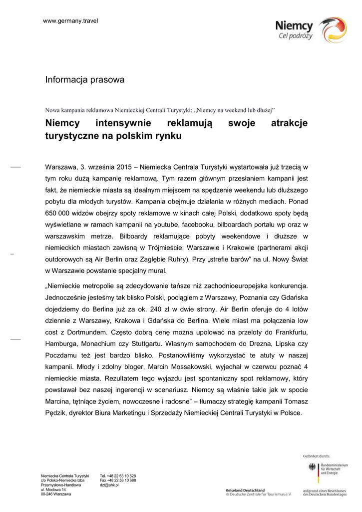 www.germany.travel Informacja prasowa Nowa kampania reklamowa Niemieckiej Centrali Turystyki: „Niemcy na weekend lub dłużej” Niemcy intensywnie reklamują turystyczne na polskim rynku swoje atrakcje Warszawa, 3. września 2015 – Niemiecka Centrala Turystyki wystartowała już trzecią w tym roku dużą kampanię reklamową. Tym razem głównym przesłaniem kampanii jest fakt, że niemieckie miasta są idealnym miejscem na spędzenie weekendu lub dłuższego pobytu dla młodych turystów. Kampania obejmuje działania w różnych mediach. Ponad 650 000 widzów obejrzy spoty reklamowe w kinach całej Polski, dodatkowo spoty będą wyświetlane w ramach kampanii na youtube, facebooku, bilboardach portalu wp oraz w warszawskim metrze. Bilboardy reklamujące pobyty weekendowe i dłuższe w niemieckich miastach zawisną w Trójmieście, Warszawie i Krakowie (partnerami akcji outdorowych są Air Berlin oraz Zagłębie Ruhry). Przy „strefie barów” na ul. Nowy Świat w Warszawie powstanie specjalny mural. „Niemieckie metropolie są zdecydowanie tańsze niż zachodnioeuropejska konkurencja. Jednocześnie jesteśmy tak blisko Polski, pociągiem z Warszawy, Poznania czy Gdańska dojedziemy do Berlina już za ok. 240 zł w dwie strony. Air Berlin oferuje do 4 lotów dziennie z Warszawy, Krakowa i Gdańska do Berlina. Wiele miast ma połączenia low cost z Dortmundem. Często dobrą cenę można upolować na przeloty do Frankfurtu, Hamburga, Monachium czy Stuttgartu. Własnym samochodem do Drezna, Lipska czy Poczdamu też jest bardzo blisko. Postanowiliśmy wykorzystać te atuty w naszej kampanii. Młody i zdolny bloger, Marcin Mossakowski, wyjechał w czerwcu poznać 4 niemieckie miasta. Rezultatem tego wyjazdu jest spontaniczny spot reklamowy, który powstawał bez naszej ingerencji w scenariusz. Niemcy są właśnie takie jak w spocie Marcina, tętniące życiem, nowoczesne i radosne” – tłumaczy strategię kampanii Tomasz Pędzik, dyrektor Biura Marketingu i Sprzedaży Niemieckiej Centrali Turystyki w Polsce. Niemiecka Centrala Turystyki c/o Polsko-Niemiecka Izba Przemysłowo-Handlowa ul. Miodowa 14 00-246 Warszawa Tel. +48 22 53 10 528 Fax +48 22 53 10 688 [email protected] Polacy zarezerwowali w 2014 r. w sumie 2,44 mln noclegów. W I półroczu 2015 r. Federalny Urząd Statystyczny zanotował 1,18 mln noclegów Polaków (+2,1% w stosunku do tego samego okresu roku poprzedniego). Polska jest w 10 najważniejszych rynków dla niemieckiego Incomingu. Spot reklamowy: https://www.youtube.com/user/germanytourism O DZT Niemiecka Centrala Turystyki (DZT) to narodowa „izba turystyki” Niemiec z siedzibą główną we Frankfurcie nad Menem. Centrala zajmuje się promowaniem Niemiec jako kraju turystycznego na zlecenie Federalnego Ministerstwa Gospodarki i Technologii (BMWi), które wspiera ją na mocy uchwały niemieckiego Bundestagu. DZT zajmuje się tworzeniem strategii i produktów oraz działaniami marketingowymi w celu dalszego umocnienia pozytywnego wizerunku Niemiec za granicą jako celu podróży oraz wspierania turystyki niemieckiej. DZT posiada 30 przedstawicielstw zagranicznych na całym świecie. Bliższe informacje można znaleźć w naszym internetowym centrum prasowym na stronie www.germany.travel/presse. Niemiecka Centrala Turystyki c/o Polsko-Niemiecka Izba Przemysłowo-Handlowa ul. Miodowa 14 00-246 Warszawa Tel. +48 22 53 10 528 Fax +48 22 53 10 688 [email protected]