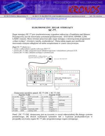www.kronos.poznet.pl [email protected] ELEKTRONICZNY ZEGAR STERUJĄCY SC-77. Zegar sterujący SC-77 jest synchronizowany sygnałem radiowym z Frankfurtu nad Menem. Przeznaczony jest do sterowania systemami pomiarowymi: DATAPAF, KWMS, LZM, LZQM i innymi. Może również pracować jako zegar sterujący z dziewięcioma programami „włącz-wyłącz”, również z taryfą „weekendową”. Dużą zaletą zegara jest możliwość sterowania różnymi odległymi od siebie urządzeniami w czasie rzeczywistym. Zegar SC-77 składa się z: • anteny z odbiornikiem sygnału radiowego DCF-77, • panelu [SC 77-2M] z programowanym układem logicznym i wskaźnikiem cyfrowym LCD, • panelu [SC 77-1M] z układem zasilająco-wykonawczym. ANTEN A - z odbiornikiem sygnału radiowego DCF -77 kier unek -FR ANKFURT Ekran 23 EIN DAT AUS 8 : 3 7 02 9. 4. MO DI MI DO FR SA SO 25 + _ P.W. “KRONOS” ZEG AR S TERU JĄCY SC 77-1M wyjścia MOD E M A P SC 77-2M 1 3 11 230 V ~ Oznaczenie zacisków paneli SC 77-2M i SC 77-1M: Panel SC 77-2M nr zacisku opis kolor przewodu 15 ekran ekran 16 sygnał biały 17 +12V czerwony 18 +12V czerwony 19 0V 20 wyjście 23 LED zasilanie czerwony LED 25 LED DCF zielony LED nr zacisku 15 16 17 1 3 11 12 13 Panel SC 77-1M opis kolor przewodu 0V +12V czerwony wejście 230V zasilanie 230V sieciowe masa wyjście (+) wyjście (+) Panel [SC 77-1M] dostarczany jest na życzenie w wersji odpowiedniej dla danego systemu pomiarowego, dla dwóch wybranych systemów lub z wyjściem przekaźnikowym w przypadku używania zegara SC-77 jako programowanego zegara sterującego. www.kronos.poznet.pl [email protected] Dostarczony zegar jest włączony, wyświetlacz wskazuje bieżącą godzinę, aktualną datę, dzień tygodnia, stan wyjścia oraz informację o zsynchronizowaniu z nadajnikiem DCF-77. Po podłączeniu napięcia sieciowego w panelu [SC 77-2M] zaświeci się dioda 23 sygnalizująca ładowanie wewnętrznego ogniwa akumulatorowego, a po chwili zacznie pulsować dioda 25 informująca o sygnałach przychodzących z anteny. Montaż zegara: 1. Zamocować obudowę typu 8M wraz z znajdującymi się wewnątrz panelami odbiornika radiowego pamiętając, aby była ona usytuowany z dala od źródeł zakłóceń takich jak: komputer, styczniki, transformatory, CB, telefony bezprzewodowe itp. Strzałka umieszczona na obudowie anteny powinna być skierowana w stronę Frankfurtu nad Menem. Prawidłowe ustawienie anteny sygnalizuje dioda świecąca 25. Jej błyski powinny być „czyste” i powtarzać się co 1 sekundę. 2. Podłączyć przewody do zacisków wyjściowych panelu SC 77-1M zgodnie z opisem zacisków. 3. Podłączyć (w razie potrzeby) przewody od anteny. 4. Podłączyć przewody zasilania sieciowego. 5. Po paru godzinach pracy na wyświetlaczu powinien pojawić się symbol anteny świadczący o prawidłowym odbiorze sygnału radiowego. Jeśli przez dłuższy czas (dwa, trzy dni) symbol ten nie pojawi się należy zmienić usytuowanie anteny. W przypadku gdy wskaźnik anteny nie świeci się zegar pracuje z wewnętrznym generatorem kwarcowym. Obsługa i programowanie zegara. Pod wyświetlaczem znajduje się przełącznik posiadający trzy pozycje: M, A, P. W pozycji: M A P -Zegar wskazuje wszystkie parametry lecz nie realizuje programów. -Ręcznie można załączyć i wyłączyć sygnał wyjściowy przez wciskanie przycisków [+] lub [-]. Aktualny stan wyjścia sygnalizowany jest na wyświetlaczu opisem: EIN - włączony, AUS - wyłączony. -Położenie robocze. Podobnie jak w pozycji M możemy przyciskami [+] i [-] ręcznie sterować wyjściem. Jeżeli w dowolnym momencie wciśniemy przycisk [+] lub [-] załączając lub wyłączając wyjście i pozostawimy zegar to stan taki będzie się utrzymywał, aż do najbliższego wyłączenia lub włączenia zgodnego z programem. -W tej pozycji wprowadzamy programy. Dokładny opis poniżej. Wprowadzanie do pamięci zegara programów działania przeprowadza się następująco: Obok przedstawiono widok wyświetlacza po przestawieniu przełącznika w pozycję P. -Wciskając krótko przycisk [MODE] wybieramy numer programu (od P1 do P9). www.kronos.poznet.pl [email protected] Wciskając dłużej przycisk [MODE] przechodzimy do programowania czasu włączenia (EIN), górne kreski zaczynają pulsować, przyciskami [+] i [-] ustawiamy godzinę. Wciskamy przycisk [MODE], zaczynają pulsować dolne kreski, przyciskami: [+] i [-] ustawiamy godzinę wyłączenia (AUS), Wciskamy przycisk [MODE], dzień tygodnia zaczyna pulsować, przyciskami: [+] i [-], ustawiamy właściwy dzień lub dni działania dla danego programu. Uwaga! - można wybrać następujące kombinacje czasu działania: [MO, DI, MI, DO, FR, SA ,SO], [MO, DI, MI, DO, FR], [SA, SO], [MO], [DI], [MI], [DO], [FR], [SA], [SO]. Oznaczenie dni tygodnia: MO -poniedziałek -wtorek DI MI -środa DO -czwartek FR -piątek SA -sobota SO -niedziela Po wprowadzeniu programu przestawiamy przełącznik w pozycję A i wówczas zegar przechodzi do normalnej pracy lub wciskamy przycisk [MODE], aby zmienić numer programu i wprowadzić następny program działania. Przeglądanie zawartość pamięci programów, korekta i kasowanie. • przestawić przełącznik pod wyświetlaczem w pozycję P, zostanie wyświetlona zawartość programu P1 • wciskając każdorazowo przycisk [MODE] uzyskamy wskazania dla kolejnych programów (od P1 do P9), • wyświetlając zawartość danego programu można dokonać korekty jego parametrów poprzez wprowadzenie przyciskami [+] i [-] prawidłowych ustawień, można również skasować dowolny program poprzez ustawienie godziny 23:59 i jedno krótkie naciśnięcie przycisku [+], zamiast godziny pojawią się poziome kreski (ten sposób dotyczy zarówno godziny włączenia jak i wyłączenia; • po zakończeniu przeglądania pamięci przełącznik pod wyświetlaczem ustawić ponownie w pozycję A. UWAGA !! - ważne W przypadku stosowania zegara do synchronizacji systemów pomiar