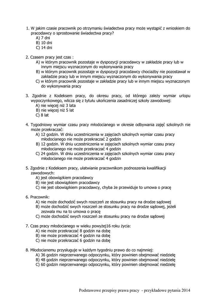 1. W jakim czasie pracownik po otrzymaniu świadectwa pracy może wystąpić z wnioskiem do pracodawcy o sprostowanie świadectwa pracy? A) 7 dni B) 10 dni C) 14 dni 2. Czasem pracy jest czas : A) w którym pracownik pozostaje w dyspozycji pracodawcy w zakładzie pracy lub w innym miejscu wyznaczonym do wykonywania pracy B) w którym pracownik pozostaje w dyspozycji pracodawcy chociażby nie pozostawał w zakładzie pracy lub w innym miejscu wyznaczonym do wykonywania pracy C) w którym pracownik pozostaje w zakładzie pracy lub w innym miejscu wyznaczonym do wykonywania pracy 3. Zgodnie z Kodeksem pracy, do okresu pracy, od którego zależy wymiar urlopu wypoczynkowego, wlicza się z tytułu ukończenia zasadniczej szkoły zawodowej: A) nie więcej niż 3 lata B) nie więcej niż 5 lat C) 8 lat 4. Tygodniowy wymiar czasu pracy młodocianego w okresie odbywania zajęć szkolnych nie może przekraczać: A) 12 godzin. W dniu uczestniczenia w zajęciach szkolnych wymiar czasu pracy młodocianego nie może przekraczać 2 godzin B) 12 godzin. W dniu uczestniczenia w zajęciach szkolnych wymiar czasu pracy młodocianego nie może przekraczać 4 godzin C) 24 godzin. W dniu uczestniczenia w zajęciach szkolnych wymiar czasu pracy młodocianego nie może przekraczać 4 godzin 5. Zgodnie z Kodeksem pracy, ułatwianie pracownikom podnoszenia kwalifikacji zawodowych: A) jest obowiązkiem pracodawcy B) nie jest obowiązkiem pracodawcy C) nie jest obowiązkiem pracodawcy, chyba że przewiduje to umowa o pracę 6. Pracownik: A) nie może dochodzić swych roszczeń ze stosunku pracy na drodze sądowej B) może dochodzić swych roszczeń ze stosunku pracy na drodze sądowej, jeżeli zezwala mu na to umowa o pracę C) może dochodzić swych roszczeń ze stosunku pracy na drodze sądowej 7. Czas pracy młodocianego w wieku powyżej16 roku życia: A) nie może przekraczać 8 godzin na dobę B) nie może przekraczać 4 godzin na dobę C) nie może przekraczać 6 godzin na dobę 8. Młodocianemu przysługuje w każdym tygodniu prawo do co najmniej: A) 36 godzin nieprzerwanego odpoczynku, który powinien obejmować niedzielę B) 48 godzin nieprzerwanego odpoczynku, który powinien obejmować niedzielę C) 60 godzin nieprzerwanego odpoczynku, który powinien obejmować niedzielę Podstawowe przepisy prawa pracy - przykładowe pytania 2014 9. Pracodawca jest obowiązany na wniosek młodocianego, ucznia szkoły dla pracujących, udzielić mu w okresie ferii szkolnych urlopu bezpłatnego w wymiarze nie przekraczającym łącznie z urlopem wypoczynkowym: A) 2 miesięcy B) 3 miesięcy C) 6 tygodni 10. Pracownik młodociany jest obowiązany dokształcać się do ukończenia: A) 16 lat B) 18 lat C) 21 lat 11. Pracownikiem jest osoba zatrudniona na podstawie: A) umowy o pracę lub spółdzielczej umowy o pracę B) umowy o pracę, powołania, wyboru, mianowania lub spółdzielczej umowy o pracę C) umowy o pracę, umowy o dzieło i umowy zlecenia 12. System prawny (prawo) to: A) pojedyncze przepisy prawne B) zbiór norm ustanowionych lub uznanych przez państwo C) system jednakowych norm obowiązujących we wszystkich krajach 13. Kodeks pracy to: A) zbiór przepisów regulujących tylko prawa objęte stosunkiem pracy B) zbiór przepisów regulujących tylko obowiązki objęte stosunkiem pracy C) zbiór przepisów regulujących prawa i obowiązki objęte stosunkiem pracy 14. Pracownikiem może być osoba, która ukończyła: A) 15 lat B) 18 lat C) 21 lat 15. Umowa na okres próbny nie może przekraczać: A) 3 miesięcy B) 4 miesięcy C) 5 miesięcy 16. Za śmiertelny wypadek przy pracy uważa się wypadek, w wyniku którego nastąpiła śmierć w okresie nieprzekraczającym: A) 6 miesięcy od dnia wypadku B) 9 miesięcy od dnia wypadku C) 12 miesięcy od dnia wypadku 17. W jakiej wysokości wynagrodzenie za pracę przysługuje młodocianemu w trzecim roku nauki? A) nie mniej niż 4% przeciętnego miesięcznego wynagrodzenia w gospodarce narodowej w poprzednim kwartale B) nie mniej niż 5% przeciętnego miesięcznego wynagrodzenia w gospodarce narodowej w poprzednim kwartale C) nie mniej niż 6% przeciętnego miesięcznego wynagrodzenia w gospodarce narodowej w poprzednim kwartale Podstawowe przepisy prawa pracy - przykładowe pytania 2014 18. Regulamin pracy ustala : A) organizację i porządek w procesie pracy oraz związane z tym prawa i obowiązki pracodawcy i pracowników , a także wynagrodzenie pracowników B) prawa i obowiązki pracodawcy i pracowników C) organizację i porządek w procesie pracy oraz związane z tym prawa i obowiązki pracodawcy i pracowników 19. Młodociany uzyskuje z upływem: A) 6 miesięcy od rozpoczęcia pierwszej pracy prawo do urlopu w wymiarze 12 dni roboczych B) 6 miesięcy od rozpoczęcia pierwszej pracy prawo do urlopu w wymiarze 6 dni roboczych C) 12 miesięcy od rozpoczęcia pierwszej pracy prawo do urlopu w wymiarze 6 dni roboczych 20. Umowa o pracę w celu przygotowania zawodowego powinna określać: A) wyłącznie wysokość wynagrodzenia B) sposób dokształcania teoretycznego i wysokość wynagrodzenia C) w szczególności: rodzaj przygotowania zawodowego (nauka zawodu lub przyuczenie do wykonywania określonej pracy), czas trwania i miejsce odbywania przygotowania zawodowego, sposób dokształcania teoretycznego, wysokość wynagrodzenia 21. Istotnych zmian treści stosunku pracy może dokonywać: A) tylko pracodawca B) tylko pracownik C) pracownik lub pracodawca tylko za zgodą drugiej strony, zgodnie z zasadą równości stron 22. Zmiana warunków umowy o pracę: A) wymaga formy pisemnej B) wymaga formy ustnej C) żadne z powyższych 23. Umowę o pracę rozwiązać może: A) tylko pracodawca B) tylko pracownik C) pracodawca lub pracownik 24. W czasie gdy pracownik przebywa na urlopie: A) pracodawca może wypowiedzieć umowy o pracę pracownikowi B) pracodawca nie może wypowiedzieć umowy o pracę pracownikowi C) pracodawca powinien wypowiedzieć umowę o pracę pracownikow