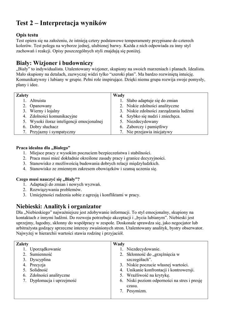 Test 2 – Interpretacja wyników Opis testu Test opiera się na założeniu, że istnieją cztery podstawowe temperamenty przypisane do czterech kolorów. Test polega na wyborze jednej, ulubionej barwy. Każda z nich odpowiada za inny styl zachowań i reakcji. Opisy poszczególnych styli znajdują się poniżej. Biały: Wizjoner i budowniczy „Biały” to indywidualista. Utalentowany wizjoner, skupiony na swoich marzeniach i planach. Idealista. Mało skupiony na detalach, zazwyczaj widzi tylko “szeroki plan”. Ma bardzo rozwiniętą intuicję. Komunikatywny i lubiany w grupie. Pełni role inspirujące. Dzięki niemu grupa rozwija swoje pomysły, plany i idee. Zalety 1. Altruista 2. Opanowany 3. Wierny i lojalny 4. Zdolności komunikacyjne 5. Wysoki iloraz inteligencji emocjonalnej 6. Dobry słuchacz 7. Przyjazny i sympatyczny Wady 1. 2. 3. 4. 5. 6. 7. Słabo adaptuje się do zmian Niskie zdolności analityczne Niskie zdolności zarządzania ludźmi Szybko się nudzi i zniechęca. Niezdecydowany Zaborczy i pamiętliwy Nie przejawia inicjatywy Praca idealna dla „Białego” 1. Miejsce pracy z wysokim poczuciem bezpieczeństwa i stabilności. 2. Praca musi mieć dokładnie określone zasady pracy i granice decyzyjności. 3. Stanowisko z możliwością budowania dobrych relacji międzyludzkich. 4. Stanowisko ze zmiennym zakresem obowiązków i szansą uczenia się. Czego musi nauczyć się „Biały”? 1. Adaptacji do zmian i nowych wyzwań. 2. Rozwiązywania problemów. 3. Umiejętności radzenia sobie z agresją i konfliktami w pracy. Niebieski: Analityk i organizator Dla „Niebieskiego” najważniejsze jest zdobywanie informacji. To styl emocjonalny, skupiony na kontaktach z innymi ludźmi. Do rozwoju potrzebuje akceptacji i „bycia lubianym”. Niebieski jest uprzejmy, łagodny, skłonny do współpracy w zespole. Doskonale sprawdza się, jako negocjator lub arbitrażysta godzący sprzeczne interesy zwaśnionych stron. Utalentowany analityk, bystry obserwator. Najwyżej w hierarchii wartości stawia rodzinę i przyjaciół. Zalety 1. Uporządkowanie 2. Sumienność 3. Dyscyplina 4. Precyzja 5. Solidność 6. Zdolności analityczne 7. Dyplomacja i uprzejmość Wady 1. Niezdecydowanie. 2. Skłonność do „grzęźnięcia w szczegółach”. 3. Niskie poczucie własnej wartości. 4. Unikanie konfrontacji i kontrowersji. 5. Wrażliwość na krytykę. 6. Niski poziom odporności na stres i presję czasu. 7. Pesymizm. Praca idealna dla „Niebieskiego” 1. Stabilne otoczenie i procedury. 2. Praca wymagająca zdolności myślenia analitycznego i krytycznego spojrzenia na występujące problemy. 3. Możliwości do krytyki. 4. Stanowisko wymagające planowania i myślenia strategicznego. 5. Praca bez presji czasu i w warunkach maksymalnie bez-stresowych. 6. Stanowisko niewymagające częstych kontaktów międzyludzkich. 7. Dokładny opis pracy, oczekiwania. Czego musi nauczyć się „Niebieski”? 1. Szybkiego podejmowania decyzji. 2. Optymizmu. 3. Komunikatywności i otwartości na innych ludzi. Czerwony: Przywódca „Czerwony” to silna, zdecydowana osobowość. Jest logiczny, praktyczny i zamknięty w sobie. Trudny w kontaktach międzyludzkich. Naturalny lider. Dominujący i gwałtowny w reakcjach. Ma potrzebę kontrolowania sytuacji i przewidywania efektów swoich działań. Zalety 1. Samodzielność. 2. Niezależność myślenia. 3. Łatwość podejmowania decyzji. 4. Zdolności zarządcze. 5. Umiejętność rozwiązywania problemów. 6. Umiejętność myślenia strategicznego. Wady 1. 2. 3. 4. 5. 6. 7. Skłonność do ryzyka. Brak cierpliwości. Upór. Nie uznaje zasad i ograniczeń. Gaduła. Mało empatyczny i elastyczny w działaniu. Ma skłonność do manipulacji. Praca idealna dla „Czerwonego” 1. Stanowisko wymagające łączenia wielu zadań i umiejętności. 2. Praca z możliwością awansu i uznania. 3. Praca ze swobodą działania i podejmowania decyzji. 4. Stanowisko pozwalające na pełne kontrolowanie efektów własnej pracy. 5. Praca bez zadań powtarzalnych i rutynowych. Żółty: Pomysłodawca, kreator nowych idei “Żółty” to optymista, radosny i pewny siebie. Lubi dobrą zabawę i nowe wyzwania. Bardzo kreatywny. Innowator. Otwarty na nowe doświadczenia. Nie boi się zmian. Zalety Słabe strony 1. Optymista. 1. Impulsywny. 2. Pełen entuzjazmu. 2. Nie analizuje problemów, nie planuje rozwiązań. 3. Pewny siebie. Działa instynktownie. 4. Bardzo komunikatywny. 3. Chaotyczny w działaniach. 5. Pomocny, radosny i towarzyski. 4. Bałaganiarz. 5. Niskie zdolności analityczne i myślenia krytycznego. 6. Lubi dobrą zabawę. 6. Mało skupiony. 7. Ma tendencje do subiektywnych sądów i oceny sytuacji. Praca idealna dla „Żółtego” 1. Zawody i stanowiska pracy z wysoką ekspozycją społeczną. 2. Stanowiska samodzielne, bez bezpośredniej podległości i nadzoru nad „Żółtym”. 3. Praca wymagająca kreatywności i innowacyjnych rozwiązań. 4. Stanowiska wymagające częstych kontaktów międzyludzkich. Charakterystyka testu Schemat powyższego testu (jest znany, jako The Color Code Personality Profile) jest metodologią opracowaną przez Amerykanina Dr Taylora Hartmana. Hartman dokonał prostego podziału typów osobowości na cztery podstawowe grupy: 1. 2. 3. 4. Niebieski (prywatność, introwertyzm) Biały (współpraca i wspólnota z innymi) Czerwony (władza) Żółty (kreatywność, zabawa) Z badań Hartmana wynika, że osobowość typu “Czerwony” reprezentuje około 25% badanych; Niebieskich – 35%; Białych – 20%; i Żółtych – 20%.