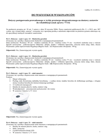 Lublin, 01.12.2014 r. DO WSZYSTKICH WYKONAWCÓW Dotyczy postępowania prowadzonego w trybie przetargu nieograniczonego na dostawy zestawów do rehabilitacji (znak sprawy 77/14) Na podstawie przepisu art. 38 ust. 2 ustawy z dnia 29 stycznia 2004r. Prawo zamówień publicznych (Dz. U. z 2013, poz. 907 z pózn. zm.) zwanej dalej „ustawą”, zwracamy się z uprzejmą prośbą o udzielenie odpowiedzi na poniższe pytania odnoszące się do specyfikacji istotnych warunków zamówienia. Pyt 1. Dotyczy: część A poz. 14 – Huśtawka grzybek Zwracamy się z prośbą o dopuszczenie huśtawki o nastepujacych parametrach: Dane techniczne: Wymiary: 60 cm - średnica siedziska 20 cm - średnica walca 75 cm - wysokość siedziska wraz z walcem Sposób zawieszenia : jednozaczepowo Materiały: sklejka, pianka i włóknina tapicerska, sztuczna skóra |skaj|, linki, okucia Wykonanie: pełne tapicerowanie Regulacja długości linek : nie Dopuszczalne obciążenie : 80 kg Odpowiedź: Nie, Zamawiającynie wyraża zgody. Pyt 2. Dotyczy: część A poz. 14 – Huśtawka grzybek Zwracamy się z prośbą o dopuszczenie huśtawki o nastepujacych parametrach: Dane techniczne: Wymiary: 60 cm - średnica siedziska 20 cm - średnica walca 75 cm - wysokość siedziska wraz z walcem Sposób zawieszenia : jednozaczepowo Materiały: sklejka, pianka i włóknina tapicerska, sztuczna skóra |skaj|, linki, okucia Wykonanie: pełne tapicerowanie Regulacja długości linek : tak Dopuszczalne obciążenie : 80 kg Odpowiedź: Nie, Zamawiającynie wyraża zgody. Pyt 3. Dotyczy: część A poz. 21 – mini masażer Zwracamy się z prośbą o dopuszczenie mini masażera o następujących parametrach: Funkcje: 1. Masaż wibracyjny 2. Peeling ciała dwustronną nakładką bawełnianą - z jednej strony miękka bawełna do delikatnego peelingu, z drugiej strony twardsza bawełna do intensywniejszego peelingu • 12 wytłoczeń masujących • Idealne do masażu pleców, karku, ramion i nóg • Wodoodporność – przeznaczenie pod prysznic i do wanny • W zestawie 2 baterie 1,5 V AAA Odpowiedź: Nie, Zamawiającynie wyraża zgody. Pyt 4. Dotyczy: część A poz. 21 – mini masażer Zwracamy się z prośbą o dopuszczenie mini masażera o następujących parametrach: • Idealny do masażu pleców, karku, ramion i nóg • Mały i poręczny • Z podświetleniem diodą LED • W zestawie 3 baterie 1,5 V AAA 1 Odpowiedź: Zamawiający podtrzymuje wymagania zawarte w SIWZ. Pyt 5. Dotyczy: część B poz. 15 – stołek tapicerowany obrotowy na kółkach z regulowaną wysokością siedziska Zwracamy się z prośbą o dopuszczenie taboretu o następujących parametrach: Średnica podstawy: 62 cm Wysokość (regulowana): 60 - 78 cm Średnica siedziska: 34 cm Waga: 8,6 kg Regulacja podnóżka: 25 - 45 cm Pozostałe parametry bez zmian Odpowiedź: Nie, Zamawiającynie wyraża zgody. Pyt 6. Dotyczy: warunki gwarancji Czy Zamawiajacy dopuści gwarancję min. 12 miesięczną ponieważ tak drobne akcesoria rehabilitacyjne nie ulegają uszkodzeniom podlegającym gwarancji. Zatem zwracamy się z prośbą o dopuszczenie gwarancji producenta. Odpowiedź: Nie, Zamawiającynie wyraża zgody. Pyt 7. Dotyczy: część B poz 1 – Przenośne urządzenie do elektroterapii Zwracamy się z prośbą o dopuszczenie elektrostymulator o następujących parametrach: elektrostymulator osobisty prądów TENS i NMES w zestawie z walizeczką i elektrodami Elektrostymulator prądów EMS i TENS: • 2 niezależne kanały. • Wyświetlacz LCD • Impuls asymetryczny, dwufazowy prostokątny. • Regulacja natężenia: 0-90 mA. • Częstotliwość impulsu: 2 do 150 Hz. • Szerokość impulsu: 2-300µs. • Tryby prądów TENS: tradycyjny, modulowany, burst, tryby zapobiegające akomodacji: modulacja 40%, 70% czasu trwania impulsu i natężenia prądu (gdy jeden parametr rośnie, drugi proporcjonalnie maleje). • Tryby prądów EMS: stały, synchroniczny (jednoczesna stymulacja z obu kanałów), naprzemienny (naprzemienna stymulacja z obu kanałów). • Czas zabiegu: 1-60 min. • Licznik całkowitego czasu terapii pacjenta. • Zasilanie bateryjne. • Osłona panelu, co pomaga w uniknięciu przypadkowego naciśnięcia guzika • Sterowanie natężeniem wyłącznik on/off • Wymiary (dł. X szer x wys) [cm] 10,1 x 6,4 x 2,5 • Waga [g]: 140 (z baterią) • rządzenie może zapisać 60 ustawień terapeutycznych. Maks. czas zapisu 999 godzin • Wskaźnik niskiego poziomu baterii • Wyposażenie 40 X 40 mm elektrody 4 Przewody elektrod 2 bateria 9 V , typ 6F22 1 Instrukcja obsługi 1 Skrzynka transportowa Odpowiedź: Nie, Zamawiającynie wyraża zgody. 2 Pyt 8. Dotyczy: część B poz 1 – Przenośne urządzenie do elektroterapii Zwracamy się z prośbą o dopuszczenie elektrostymulator o następujących parametrach: Dwukanałowy, przenośny elektrostymulator do terapii przeciwbólowej, stymulacji mięśniowej i nerwowej, z zasilaniem bateryjnym. Aparat do elektrostymulacji oferując szeroką gamę zróżnicowanych programów terapeutycznych umożliwiających łatwy wybór odpowiednich parametrów terapii. Posiada 12 wbudowanych programów, z możliwością ustawienia dodatkowych 4 programów z parametrami użytkownika. Stosowany najczęsciej przy: redukcji bólu; stymulacji mięśni i nerwów • • • • • • • • • • • • Przydatna funkcja blokująca programy, dzięki czemu pacjent może używać tylko programu zaleconego przez fizykoterapeutę, Funkcja kontrolowania czasu zabiegu, używanych kanałów, numerów programów oraz średniego natężenia prądu podczas zabiegu, Wbudowany system AKS kontrolujący natężenie prądu na elektrodach - zabezpiecza przed poparzeniem, 12 programów dla prądów: TENS, Burst, modulowanej częstotliwości oraz stymulacji mięśniowej, 4 programy pozwalające na zapisanie ustawień użytkownika, Zastosowane w aparacie nowe parametry dla stymulacji HAN i stymulacji dynamicznej znacznie poszerzają zak