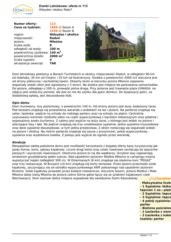 Domki Letniskowe: oferta nr 113 Wdzydze i okolice; Radu? Numer oferty: Cena za tydzień: 113 1899 zł Sezon A 1550 zł Sezon B region: Wdzydze i okolice miejscowość: Raduń jezioro: Młosino liczba osób: 8 odległość od wody: 100 m powierzchnia użytkowa: 140 m2 powierzchnia działki: 2000 m2 liczba sypialni: 4 akceptacja zwierząt: TAK Dom letniskowy położony w Borach Tucholskich w okolicy miejscowości Raduń; w odległości 90 km od Gdańska, 35 km od Chojnic i 25 km od Kościerzyny. Działka o powierzchni 2000 m2 otoczona jest od strony północnej i zachodniej lasem. Otwarty teren w kierunku jeziora Młosino zapewnia wspaniały widok (dom jest ogrodzony z 3 stron). Na działce jest miejsce do parkowania samochodów. Do jeziora, odległego o 100 m, prowadzi polna droga. Przy jeziorze jest trawiasta plaża (UWAGA: na zdjęciu jest widoczny pomost, ale jest on nie do użytku dla gości domku). Do dyspozycji gości, za dodatkową opłatą, jest dwuosobowa łódź. Opis domu Dom murowany, trzy poziomowy, o powierzchni 140 m. Od strony jeziora jest duży zadaszony taras. Pod tarasem znajduje się przeszklona weranda z widokiem na las i jezioro. Na parterze znajduje się salon, łazienka, wejście na schody do niskiego parteru oraz na schody na piętro. Centralnie usytuowany kominek rozdziela salon na część wypoczynkową z kącikiem telewizyjnym oraz jadalnię i wyposażony aneks kuchenny. Z salonu jest wyjście na duży taras, z którego jest widok na jezioro i otaczające lasy i łąki. Na piętrze znajdują się trzy umeblowane sypialnie. Jedna sypialnia trzyosobowa oraz dwie sypialnie dwuosobowe, w tym jedna przejściowa. Z okien roztaczają się wspaniałe widoki na jezioro i okolicę. Na niskim parterze znajduje się sauna z prysznicem, pokój wypoczynkowy sypialnia oraz wydzielona toaleta. Z pokoju jest wyjście do ogrodu przez werandę. Atrakcje Niewątpliwa zaletą położenia domu jest możliwość korzystania z bogatej oferty bazy turystycznej jak: jazdy konne, tenis, spływy kajakowe. Liczne drogi leśne oraz szlaki rowerowe zachęcają do spacerów pieszych i wycieczek rowerowych. Okoliczne jeziora to raj dla wędkarzy. Grzybne lasy zapewniają amatorom grzybobrania pełen sukces. Nad sąsiednim jeziorem Wielkie Młosino w campingu można wypożyczać kajaki (odległość 500 m). W Dziemianach (6 km) znajduje się stadnina koni "PEGAZ" oraz trzy restauracje. W Brusach (10 km) znajdują się korty tenisowe. Przez jezioro przechodzi szlak kajakowy, zaczynający się od ośrodka wypoczynkowego AWF położonego nad sąsiednim jeziorem Brzeźno. Szlak kajakowy prowadzi przez kolejne malownicze, otoczone lasami, jeziora Wielkie i Małe Młosino dalej rzeką Młosina do jeziora Leśno Górne gdzie łączy się ze szlakiem kajakowym rzeki Niechwaszcz. Dom stanowi dobre miejsce wypadowe dla zwiedzania Ziemi Kaszubskiej. Charakter - Maksymalna liczba - 1 Sypialnia: łóżko tapczan 1 os.: piętr - 2 Sypialnia: tapcz - 3 Sypialnia: tapcz - 4 pokój sypialnia: parter - Bielizna pościelow - 1 Łazienka z wann - 2 Łazienka z kabin toaleta: parter strona 1 / 2 Domki Letniskowe: oferta nr 113 Wdzydze i okolice; Radu? - Salon z kominkiem - Aneks kuchenny: p - Kuchenka 4 płyt. + gaz/elektryczna - Czajnik: elektrycz - Ciepła woda: tak - Lodówka: 2 szt. - Ogrzewanie komin * brak szczelnego ogrodzenia - dom ogrodzony z 3 stron CENNIK: Podana poniżej i wyróżniona na pomarańczowo cena jest całkowitą ceną wynajmu domu na 1 tydzień - od soboty do soboty (zawiera w sobie kwotę rezerwacji i zaliczki). Dodatkowo dolicza się podane niżej opłady obowiązkowe i/lub nieobowiązkowe. Sezon A Sezon B TYLKO Weekendy: 25.06. - 20.08.2011. Poza sezonem A 29.04 - 03.05 (4 doby) wynajem za 1 tydzień w tym: 1899 zł/tydz 1550 zł/tydz nie jest wynajmowany - rezerwacja 429 zł/tydz 350 zł/tydz --- - zaliczka 200 zł/tydz 200 zł/tydz --- OPŁATY DODATKOWE: 1. Zużycie energii elekt. wg wskazań licznika; koszt 90 gr. za 1 kWh. 2. Zużycie gazu 16 zł za 1 m3 wg wskazań licznika 3. Sprzątanie domu po zakończeniu turnusu 150 zł jeżeli najemca nie chce sam wykonać tej pracy 4. Drewno do kominka 1 wsad gratis, dodatkowa wiązka 30 zł 5. Każde zwierzę: 50 zł/tydzień 6. Wypożyczenie łodzi: 50 zł/tydzień KAUCJA 300 zł Kaucja, pobierana przez właściciela w momencie przekazania kluczy, jest zwracana najemcy po potrąceniu kwoty opłat dodatkowych oraz ewentualnych uzasadnionych kosztów szkód powstałych z jego winy. strona 2 / 2 Powered by TCPDF (www.tcpdf.org)