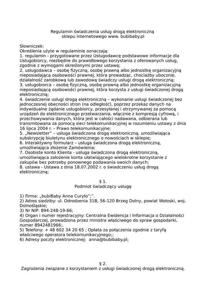 Regulamin świadczenia usług drogą elektroniczną sklepu internetowego www. bubibaby.pl Słowniczek: Określenia użyte w regulaminie oznaczają: 1. regulamin - przygotowane przez Usługodawcę podstawowe informacje dla Usługobiorcy, niezbędne do prawidłowego korzystania z oferowanych usług, zgodnie z wymogami określonymi przez ustawę; 2. usługodawca – osobę fizyczną, osobę prawną albo jednostkę organizacyjną nieposiadającą osobowości prawnej, która prowadząc, chociażby ubocznie, działalność zarobkową lub zawodową świadczy usługi drogą elektroniczną; 3. usługobiorca – osobę fizyczną, osobę prawną albo jednostkę organizacyjną nieposiadającą osobowości prawnej, która korzysta z usługi świadczonej drogą elektroniczną; 4. świadczenie usługi drogą elektroniczną – wykonanie usługi świadczonej bez jednoczesnej obecności stron (na odległość), poprzez przekaz danych na indywidualne żądanie usługobiorcy, przesyłanej i otrzymywanej za pomocą urządzeń do elektronicznego przetwarzania, włącznie z kompresją cyfrową, i przechowywania danych, która jest w całości nadawana, odbierana lub transmitowana za pomocą sieci telekomunikacyjnej w rozumieniu ustawy z dnia 16 lipca 2004 r. – Prawo telekomunikacyjne; 5. „Newsletter” – usługa świadczona drogą elektroniczną, umożliwiająca subskrypcję biuletynu elektronicznego o nowościach w sklepie; 6. Interaktywny formularz – usługa świadczona drogą elektroniczną, umożliwiająca złożenie Zamówienia; 7. Osobiste konto Klienta - usługa świadczona drogą elektroniczną, umożliwiająca założenie konta ułatwiającego wielokrotne korzystanie z zakupów bez potrzeby ponownego podawania swoich danych; 8. ustawa - Ustawa z dnia 18.07.2002 r. o świadczeniu usług drogą elektroniczną; § 1. Podmiot świadczący usługę 1) Firma: „bubiBaby Anna Curyło”;”. 2) Adres siedziby: ul. Odrodzenia 31B, 56-120 Brzeg Dolny, powiat Wołoski, woj. Dolnośląskie; 3) Nr NIP: 894-248-19-66; 4) Organ i numer rejestracyjny: Centralna Ewidencja i Informacja o Działalności Gospodarczej, prowadzona przez ministra właściwego do spraw gospodarki, numer 8942481966;. 5) Telefony: + 48 602 34 20 65 ; Opłata za połączenia zgodnie z taryfą właściwego operatora telekomunikacyjnego;; 6) Adresy poczty elektronicznej: [email protected]; § 2. Zagrożenia związane z korzystaniem z usługi świadczonej drogą elektroniczną. 1. Podstawowym zagrożeniem każdego użytkownika Internetu, w tym osób korzystających z usług świadczonych drogą elektroniczną, jest możliwość „zainfekowania” systemu teleinformatycznego przez różnego rodzaju oprogramowanie tworzone głównie w celu wyrządzania szkód, typu wirusy, „robaki” czy „konie trojańskie”. By uniknąć zagrożeń z tym związanych ważne jest, by Usługobiorca zaopatrzył swój komputer, który wykorzystuje podłączając się do Internetu, w program antywirusowy i stale go aktualizował, instalując jego najnowsze wersje. 2. Szczególne zagrożenia związane z korzystaniem z usługi świadczonej drogą elektroniczną, w tym opisywanej w regulaminie, wiążą się z działalnością tzw. hackerów, zmierzających do włamania się zarówno do systemu sprzedawcy internetowego (np. ataki na jego witryny), jak i kupującego. § 3. Funkcje i cel oprogramowania niebędących składnikiem treści usługi 1. Usługobiorca może wyrazić zgodę na przechowywanie. przez Usługodawcę, na jego komputerze niewielkich plików tekstowych (tzw. cookies) niezbędnych do prawidłowego świadczenia usług. Po wejściu na stronę www. bubibaby.pl wyświetla się komunikat ostrzegawczy z informacją jak wyłączyć „cookies” w przeglądarce. § 4. Rodzaj i zakres usług świadczonych drogą elektroniczną Usługi świadczone drogą elektroniczną, przez Usługodawcę, umożliwiają Usługobiorcy: 1) założenie i utrzymanie osobistego konta Klienta; 2) zawarcie umowy sprzedaży na odległość, poprzez wypełnienie interaktywnego formularza zamówienia, znajdującego się na stronie internetowej Usługodawcy; 3) subskrypcję biuletynu elektronicznego - „Newsletter”. § 5. Warunki świadczenia usług drogą elektroniczną 1. Wymagania techniczne niezbędne do współpracy z systemem teleinformatycznym, którym posługuje się usługodawca: a) procesor: architektura x86 1GHz lub odpowiedniki w pozostałych architekturach; b) pamięć operacyjna 1GB; c) monitor i karta graficzna: zgodny ze standardem XGA, minimalna rozdzielczość 1024x768 16bit; d) dysk twardy: dowolny obsługujący system operacyjny z minimalnie 100MB wolnego miejsca; e) mysz lub inny manipulator + klawiatura; f) karta sieciowa/modem: umożliwiająca dostęp do sieci Internet z prędkością 512kb/s; g) system Operacyjny: System MS Windows XP i wyżej, MacOS 9 lub wyżej; h) przeglądarka internetowa: Internet Explorer 7 lub wyżej, Opera 10 i wyżej, FireFox 3 i wyżej; Chrome 1.0 i wyżej, Safari 5 i wyżej; i) przeglądarka z obsługą ciasteczek i włączoną obsługą JavaScript; k) dostęp do poczty elektronicznej. 2. Dostarczanie przez Usługobiorcę treści o charakterze bezprawnym lub zawierających wirusy jest zakazane. W przypadku otrzymania takich treści Usługodawca ma prawo do zablokowania dostępu Usługobiorcy do świadczonych usług oraz podjęcia kroków przewidzianych prawem. 3. Warunki zawierania i rozwiązywania umów o świadczenie usług drogą elektroniczną. 1) usługi elektroniczne wymienione w § 4. świadczone są przez Usługodawcę nieodpłatnie i zawierane są na odległość bez jednoczesnej obecności Stron; 2) umowa o założenie i utrzymanie konta osobistego zawierana jest na czas nieoznaczony. Do zawarcia umowy dochodzi po podaniu w formularzu rejestracyjnym wymaganych do zawarcia umowy danych i potwierdzeniu ich przez Usługobiorcę. 3) umowa o udostępnienie interaktywnego formularza zamówienia zawierana jest na czas o